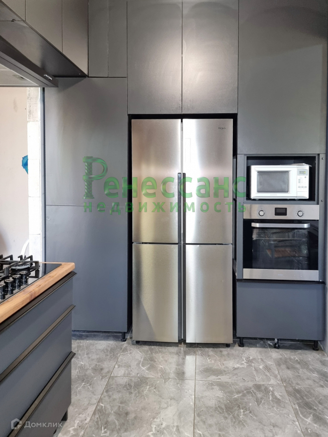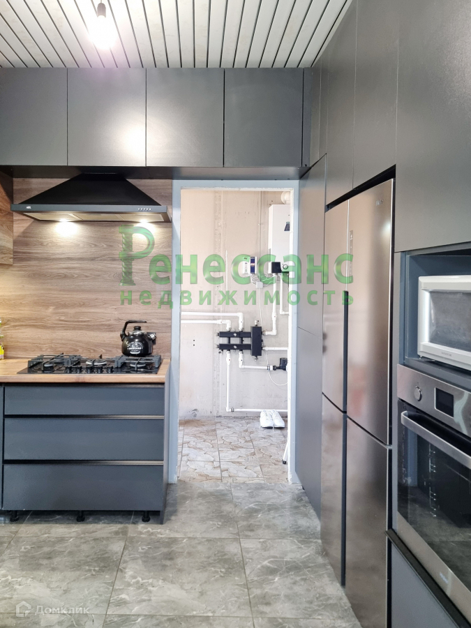 Ремонт закончен на 90%, плитка в сан. узлах, натяжные потолки, ламинат на полу, евроокна, встроенный кухонный гарнитур, осталось: поклеить обои, установить межкомнатные двери.