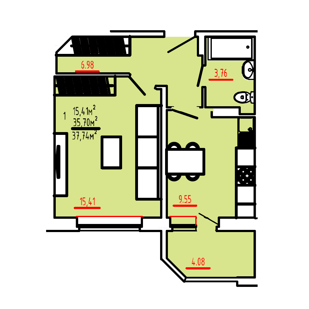 Общая площадь 37.4 м2