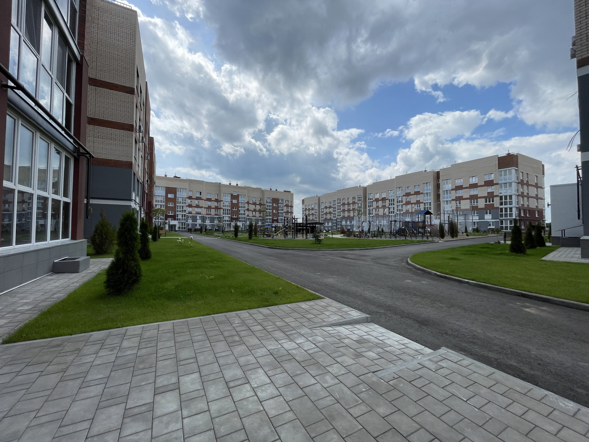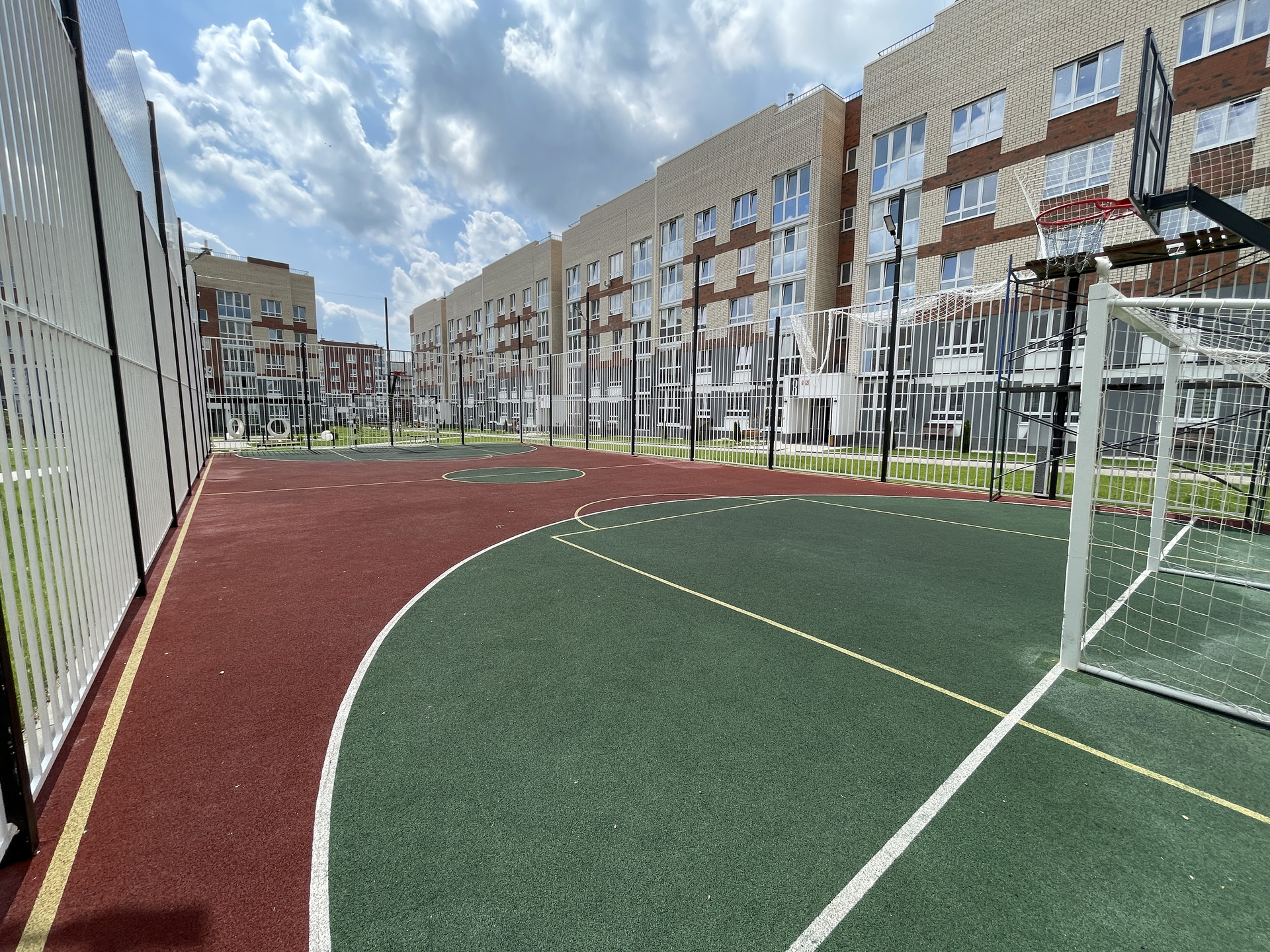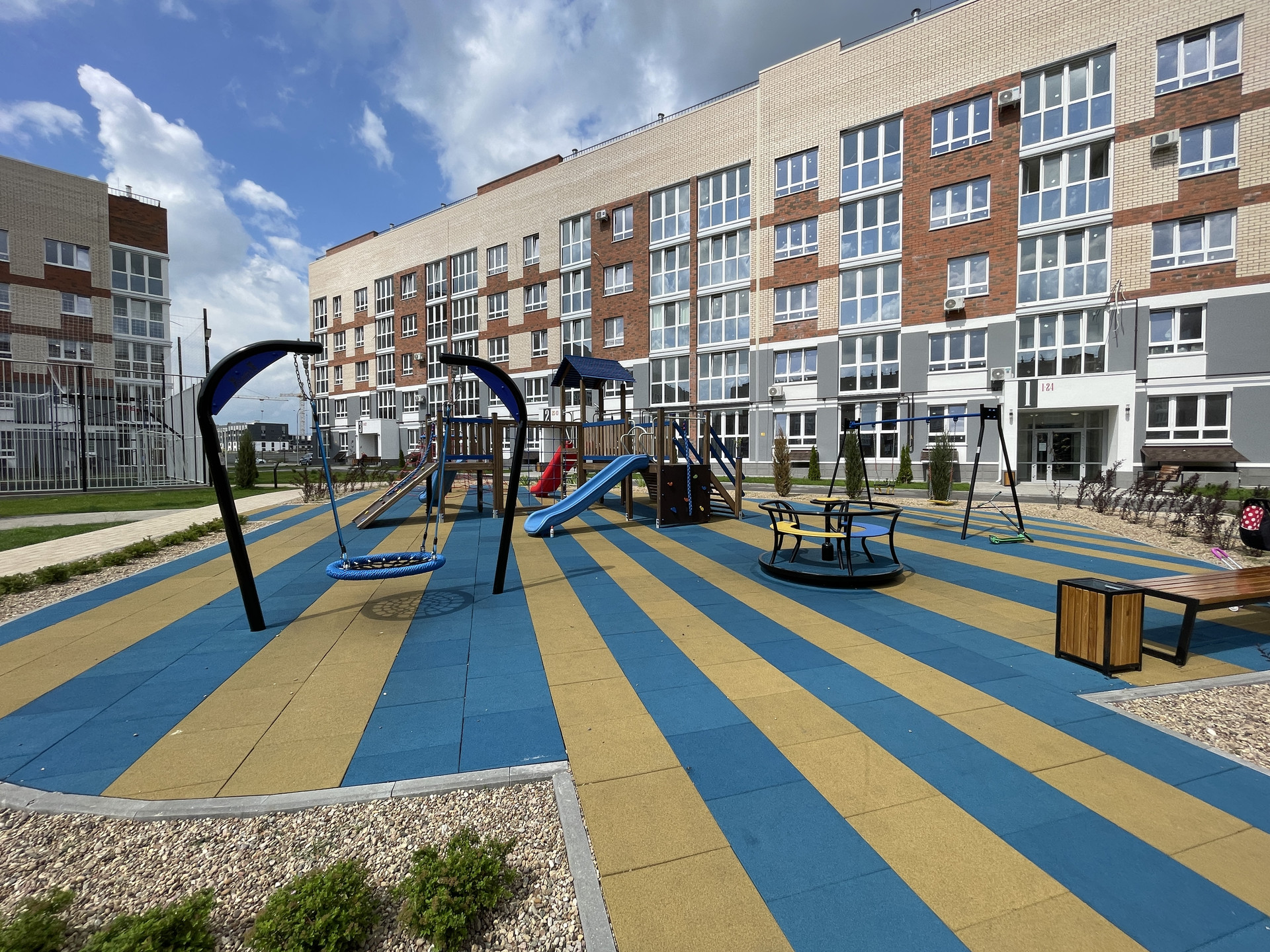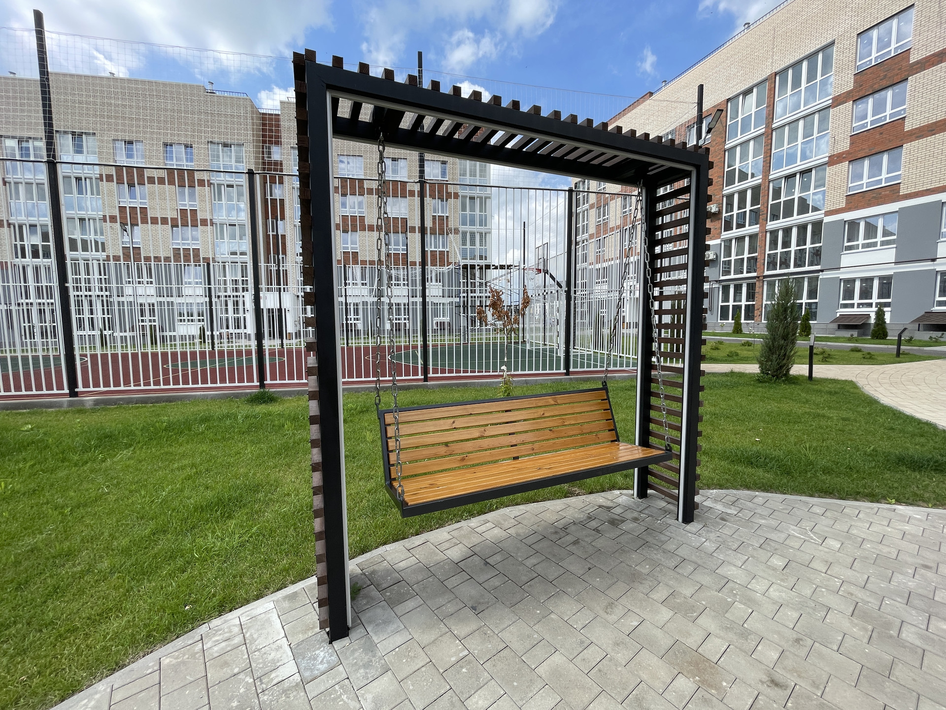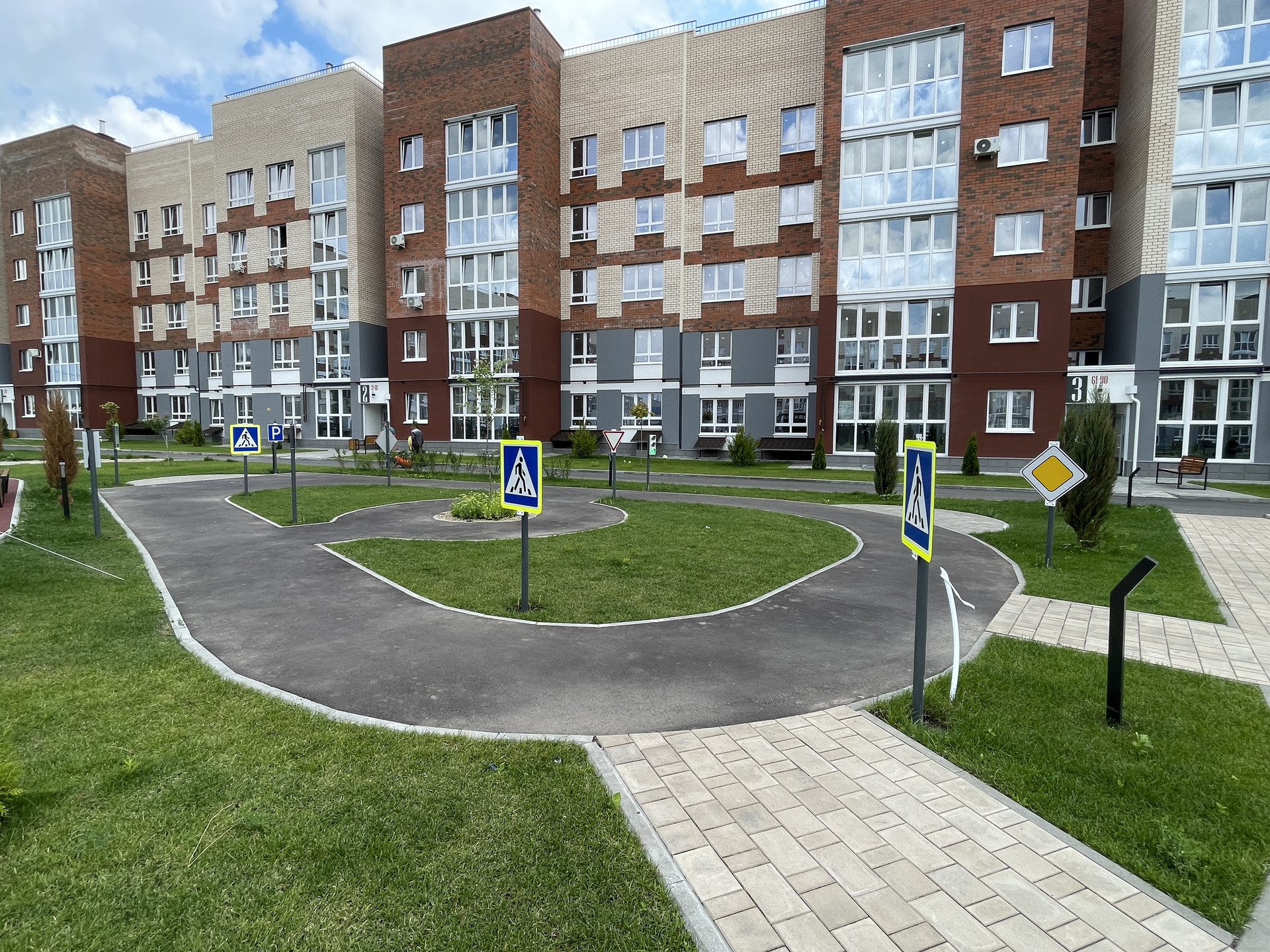 • двор оборудован: клеткой для мини-футбола, беседками; имеется парковая зона с лавочками; всевозможные развлечениями для детей, где даже не забыли о правилах ПДД!