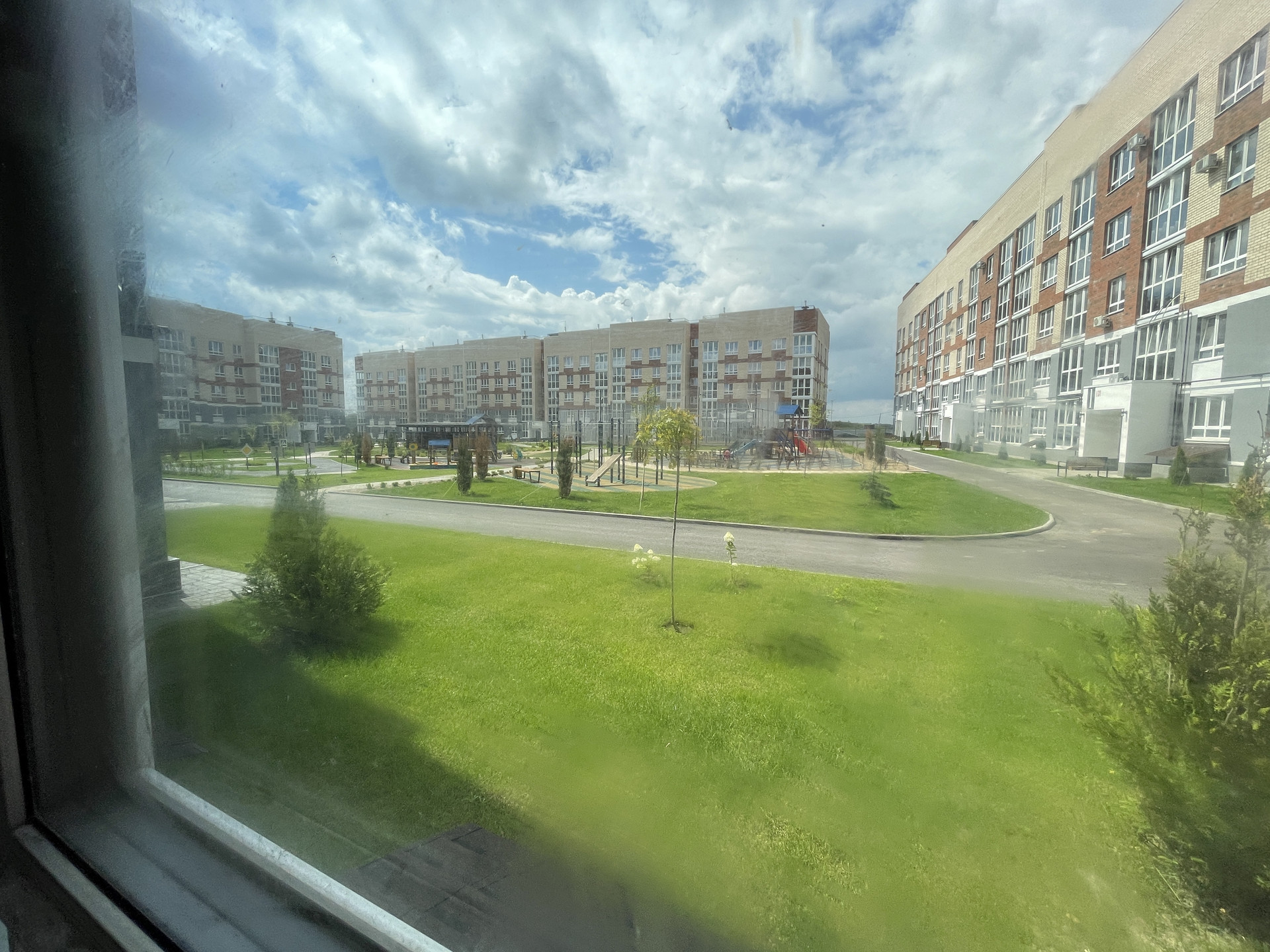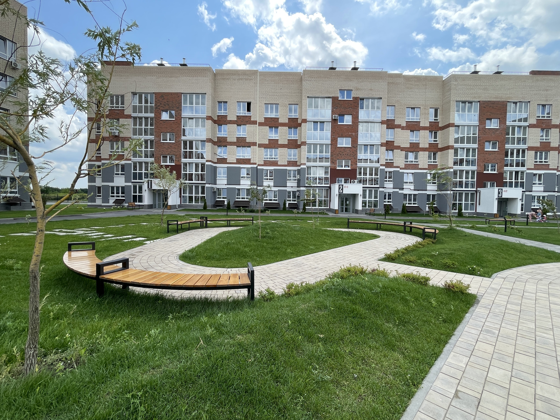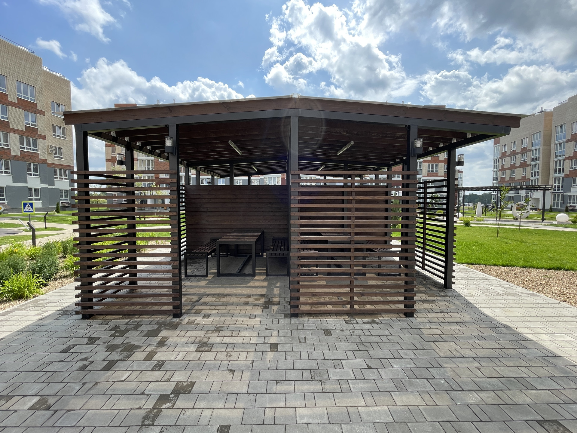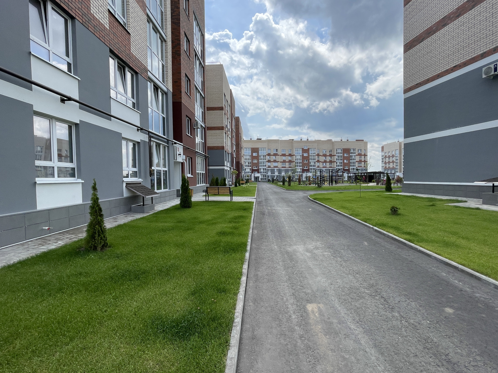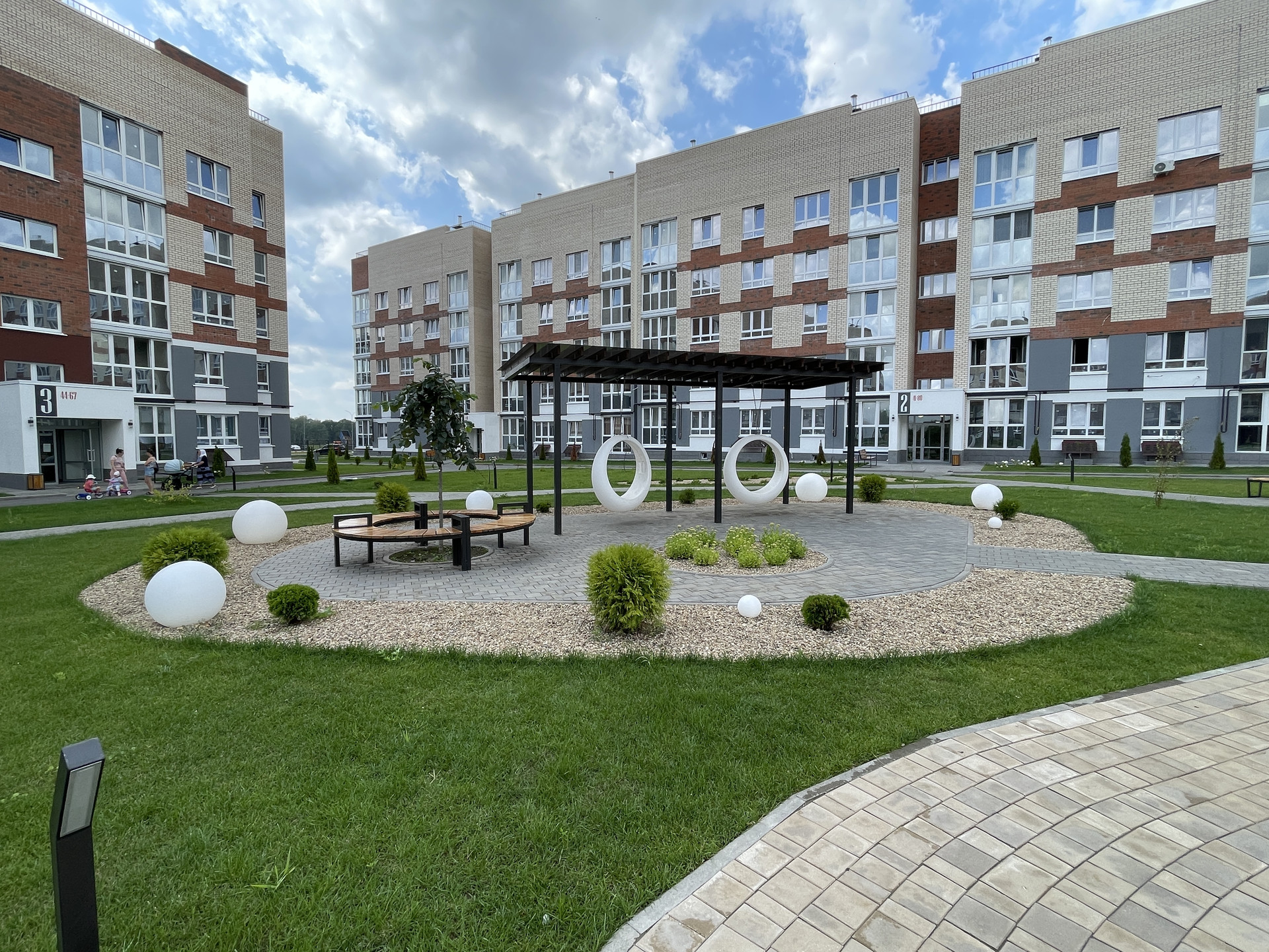 • двор оборудован: клеткой для мини-футбола, беседками; имеется парковая зона с лавочками; всевозможные развлечениями для детей, где даже не забыли о правилах ПДД!