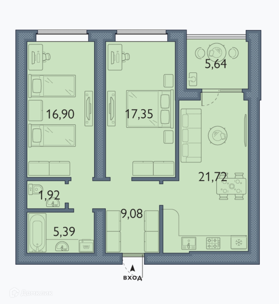 Жилая площадь 34.7 м2