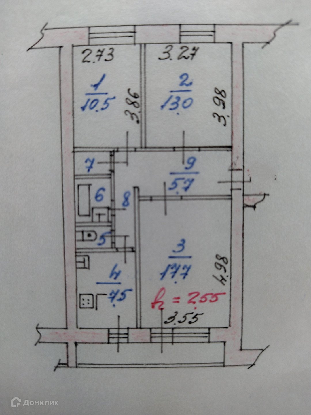 Общая площадь квартиры - 62,6 кв.м., жилая площадь - 41,2 кв.м., кухня 7,5 кв.м., все комнаты изолированы, правильной формы, с/у раздельный, окна выходят на обе стороны дома, на юг и на север. Имеется вместительная кладовка. Лоджия 6 кв.м. застеклена, выходы из кухни и комнаты.