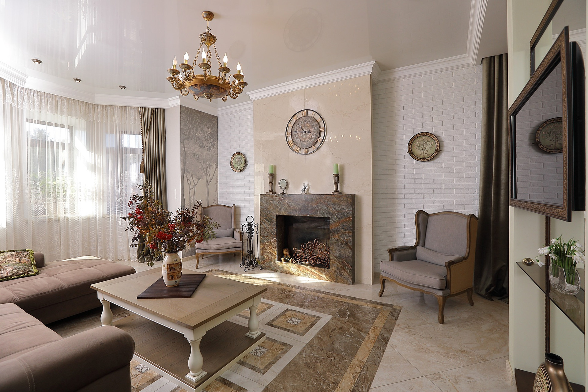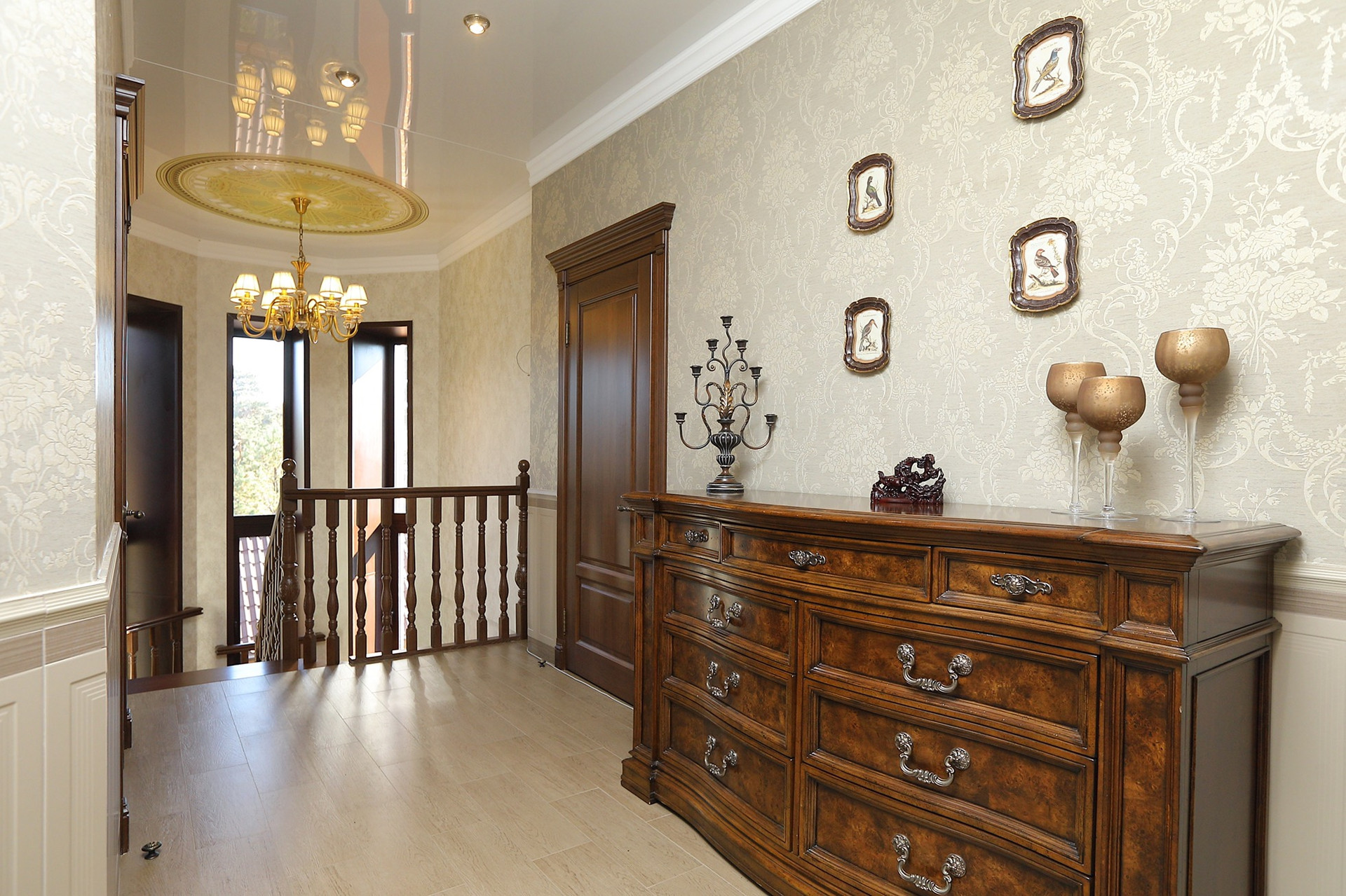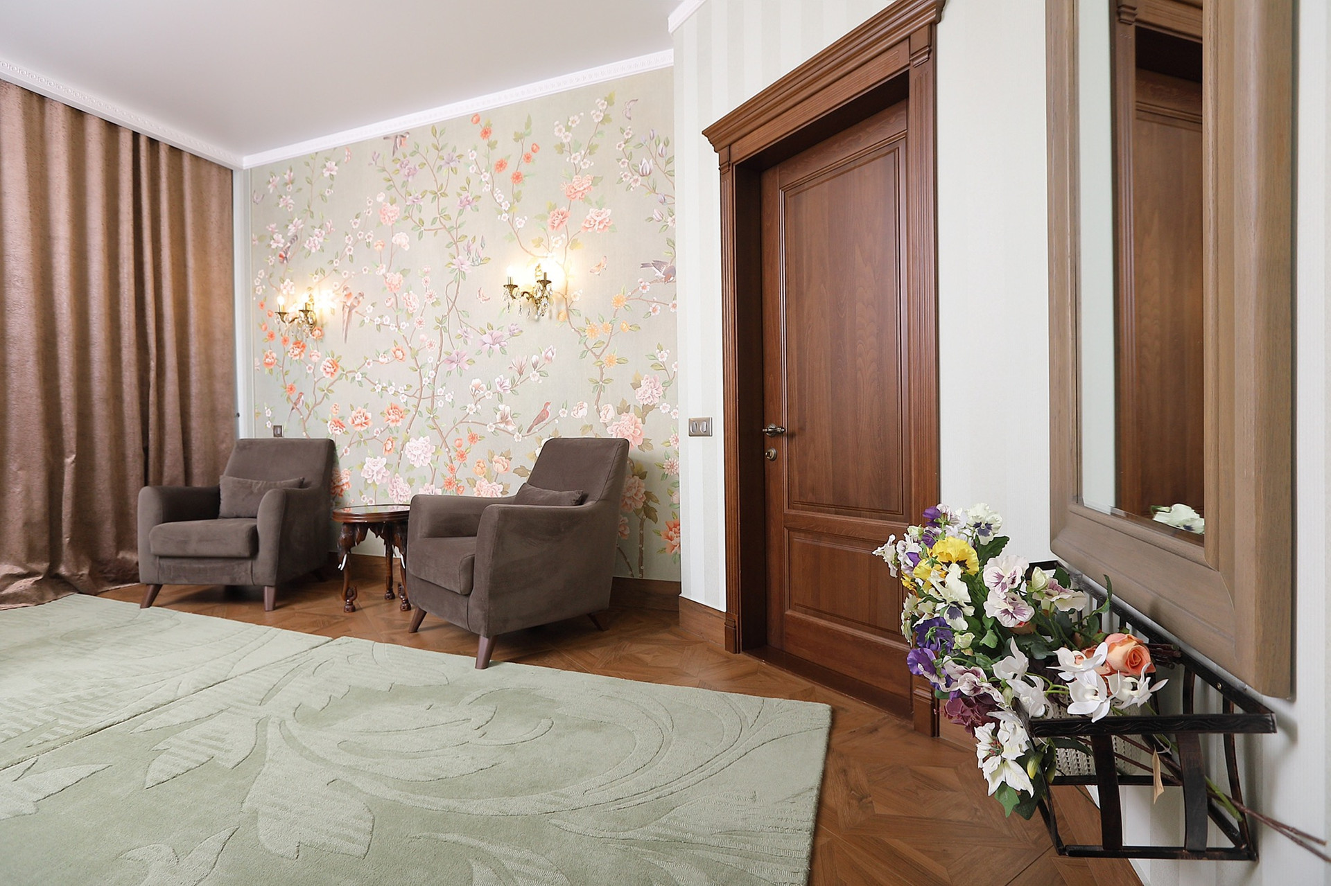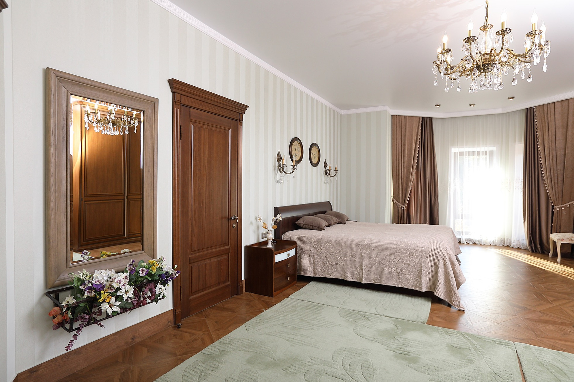 Оформление внутренних помещений выполненно в комфортной цветовой гамме, приятной глазу, а классический стиль никогда не выйдет из моды и не надоест. Мебель, детали интерьера выглядят достойно и привлекательно.  Комнаты просторные, наполнены светом.