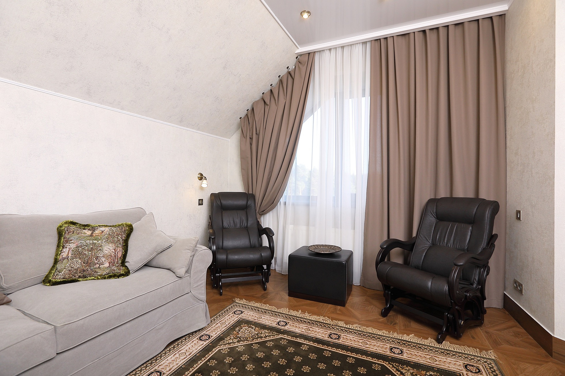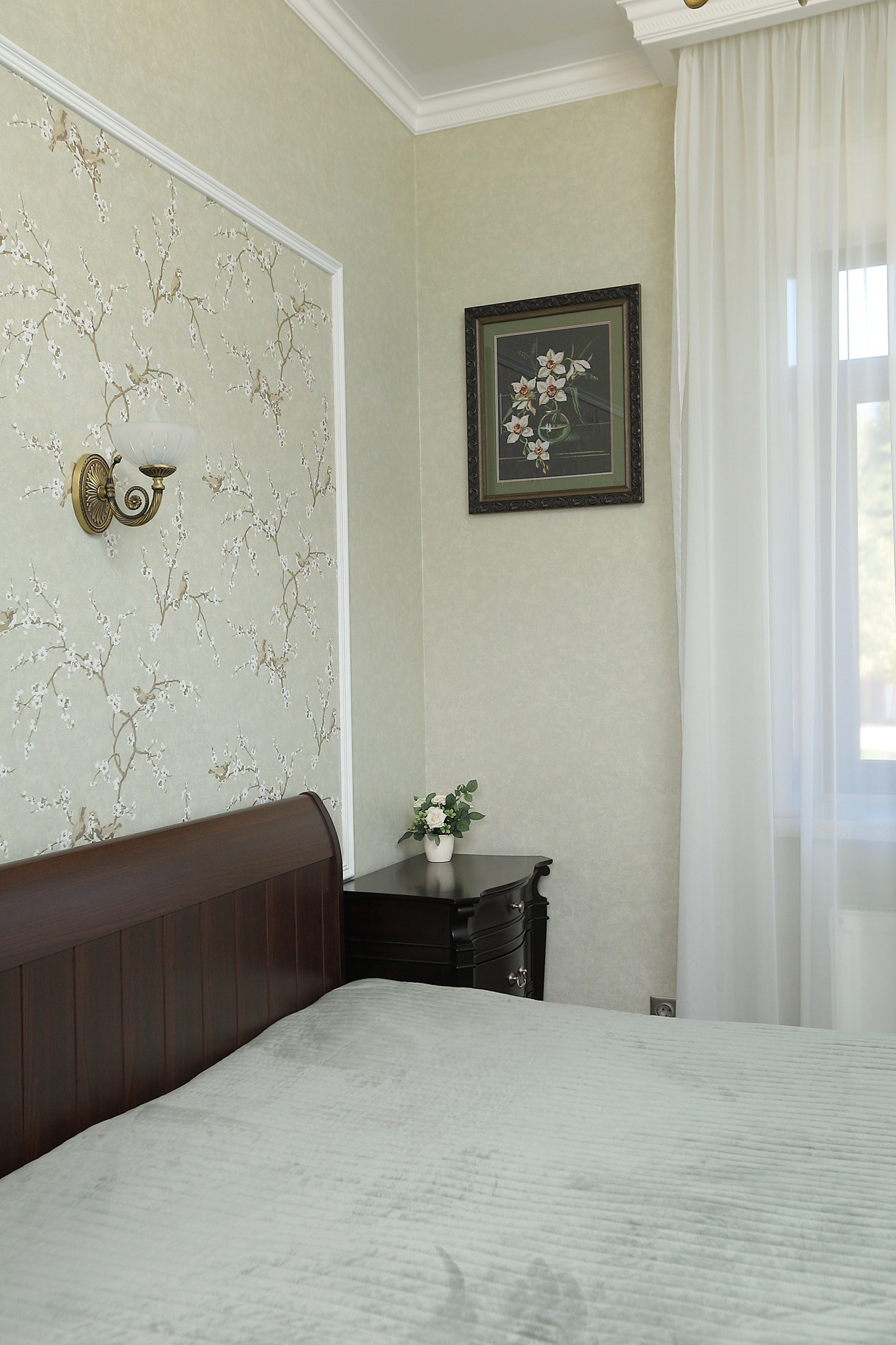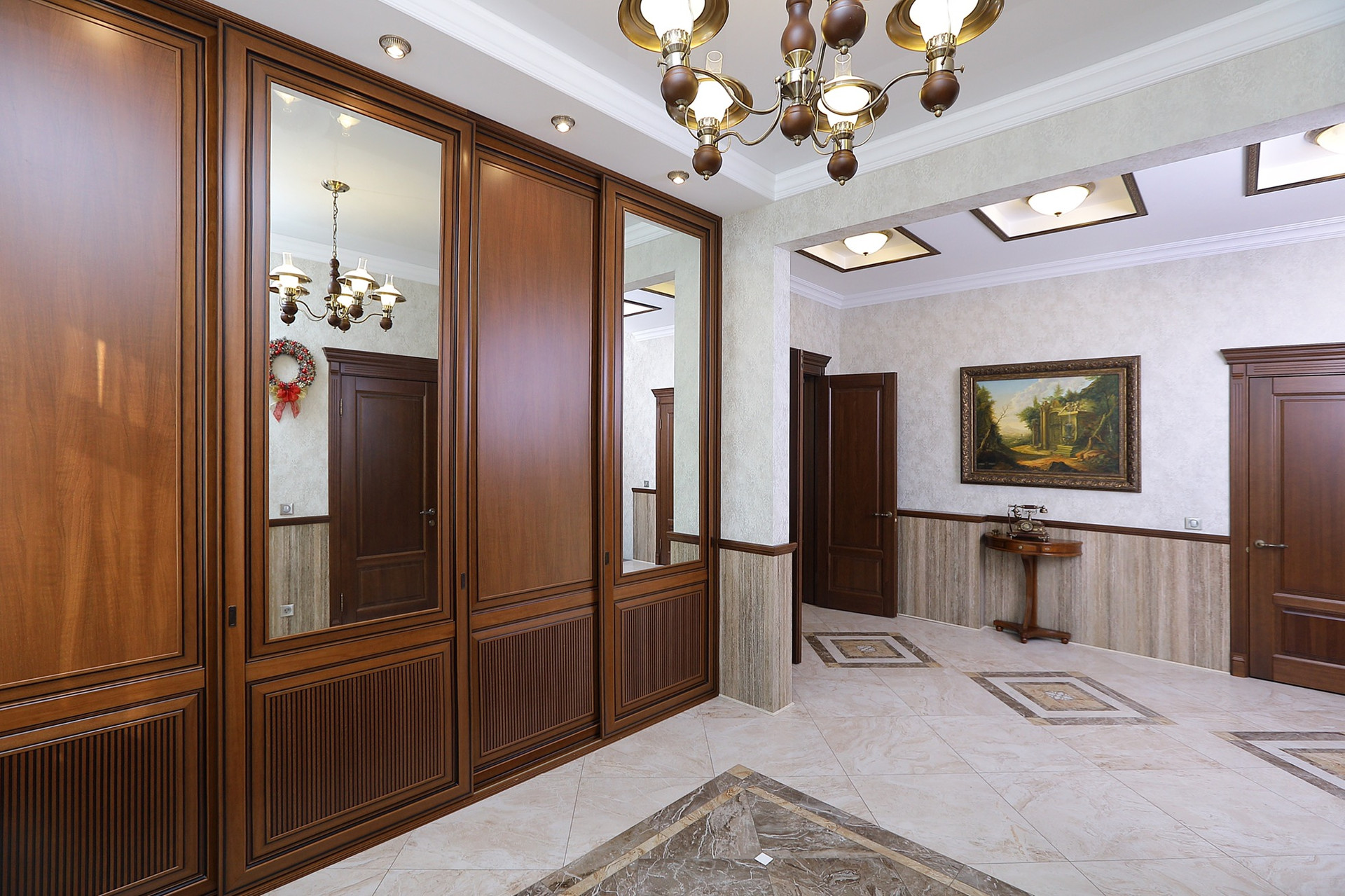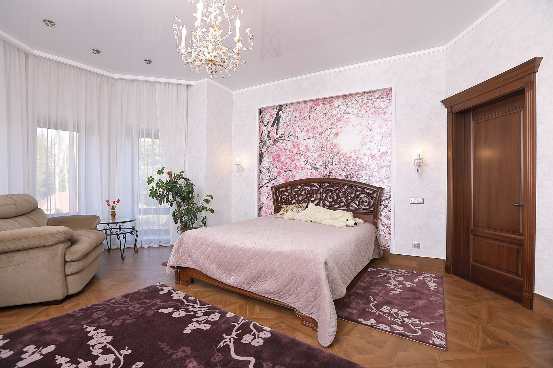 Оформление внутренних помещений выполненно в комфортной цветовой гамме, приятной глазу, а классический стиль никогда не выйдет из моды и не надоест. Мебель, детали интерьера выглядят достойно и привлекательно.  Комнаты просторные, наполнены светом.