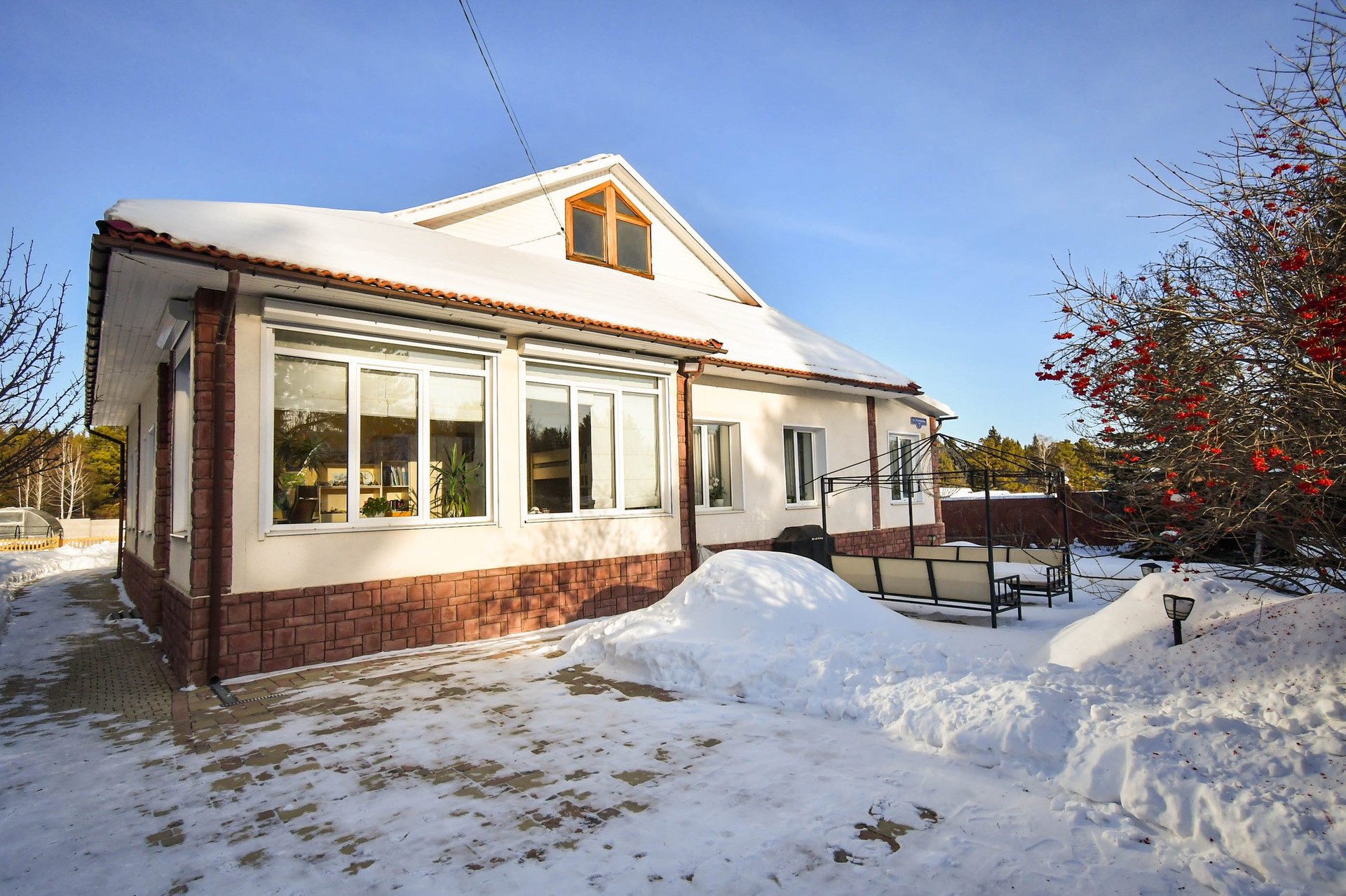Дом имеет два входа - парадный и задний. К дому пристроен гараж. Ворота автоматический. Вход в дом напрямую из гаража через коридор.
