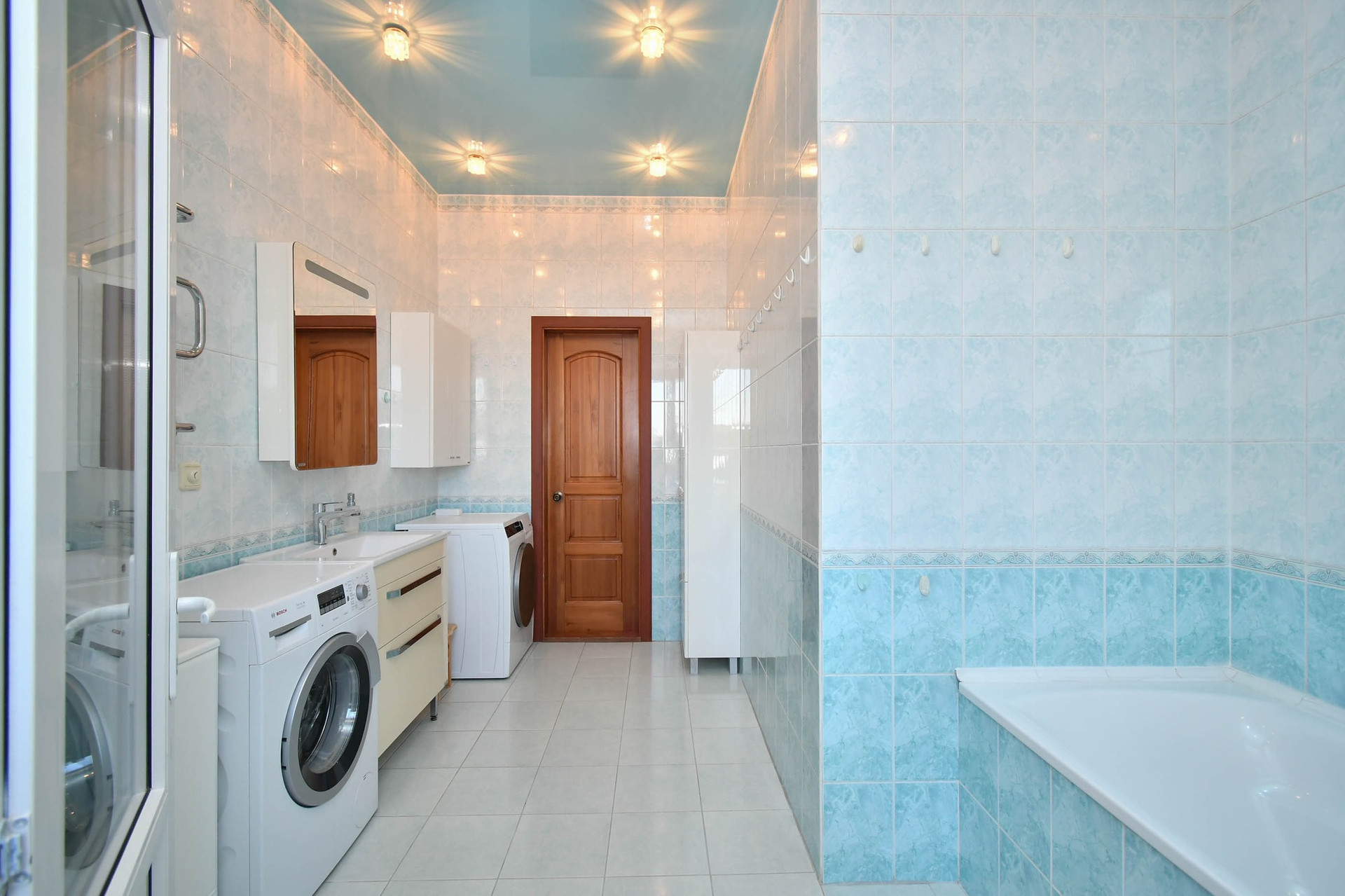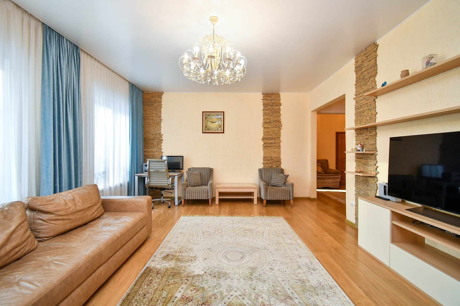 На первом этаже -гостиная 28,4 кв.м, 2 спальни взрослых- каждая площадью 15,8 кв.м, кухня - 17,3 кв.м, летняя кухня- 6,5 кв.м, 2 детских комнаты- 10,7; 10 кв.м, ванна + душевая (9,7кв.м) и санузел (1,74 кв.м) - раздельные. Встроенные вместительные шкафы, качественный кухонный гарнитур с каменной столешницей.