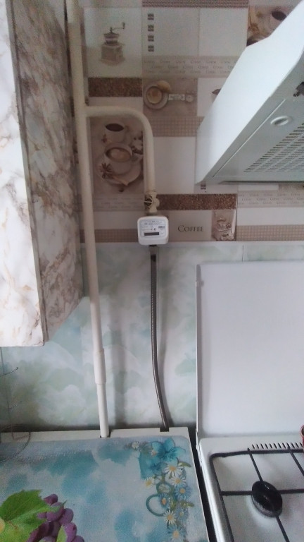 Кухня большая, квадратная, есть счетчики на газ и на воду. Остается кухонный гарнитур, уголок и газовая плита.