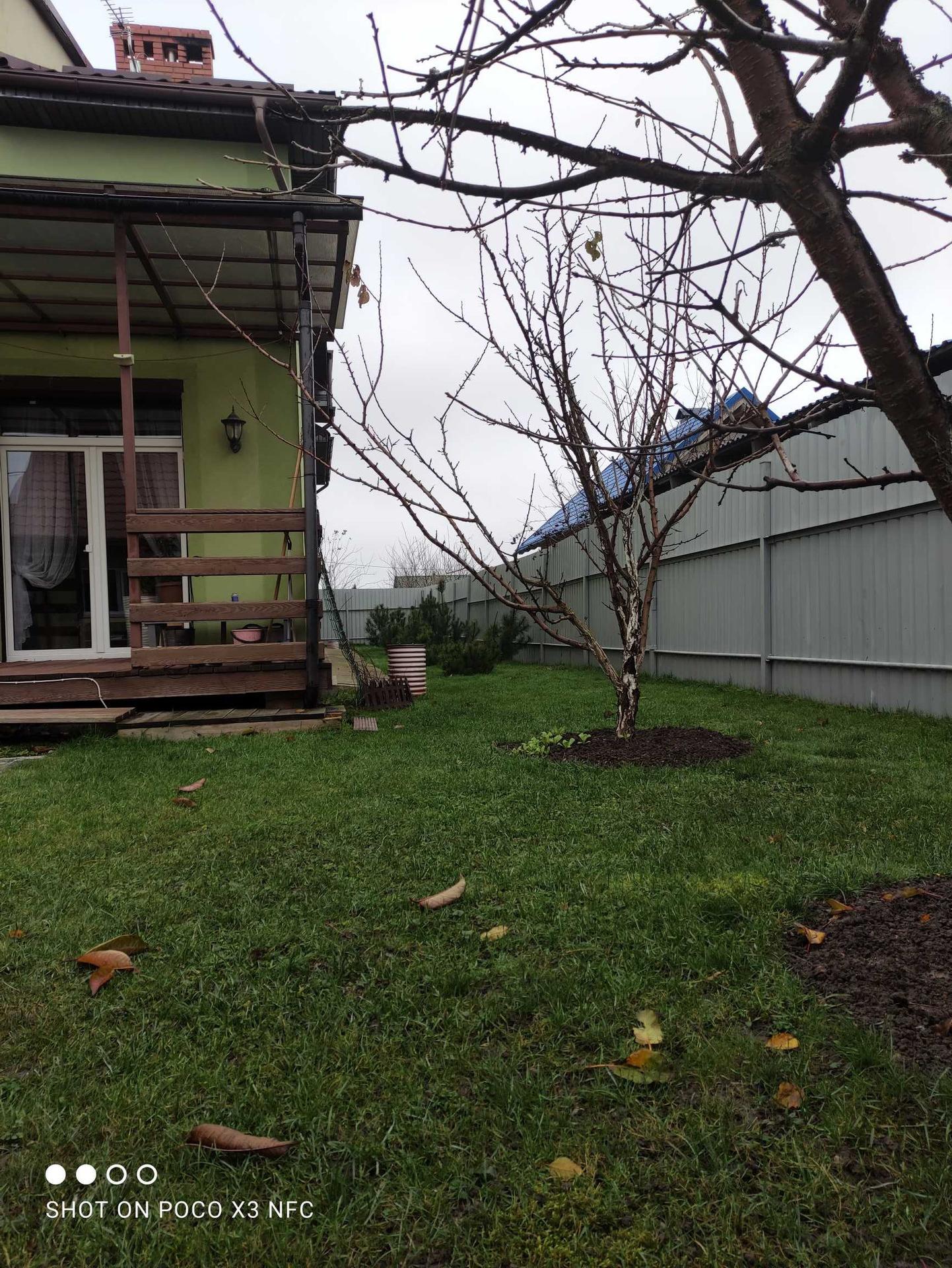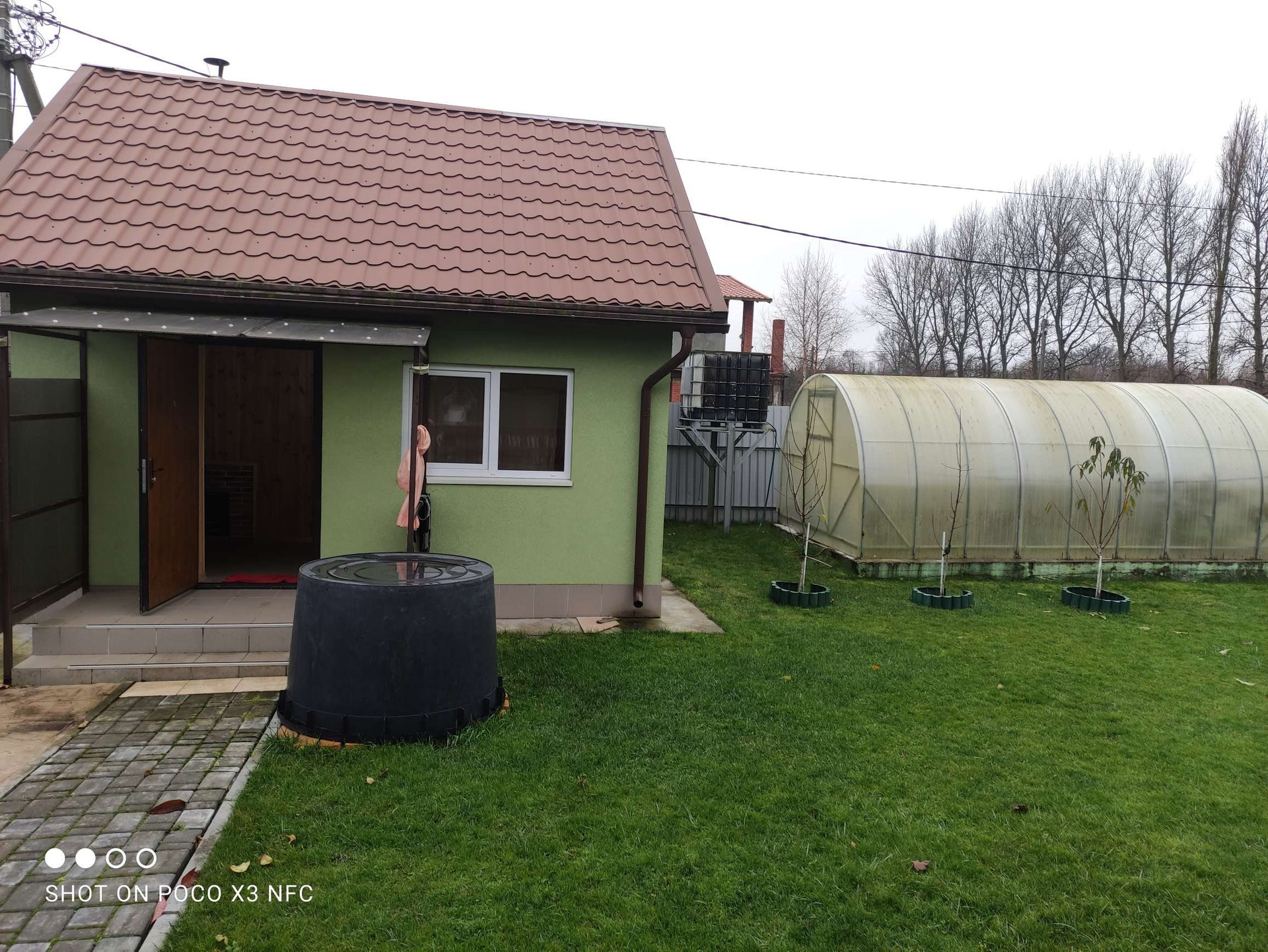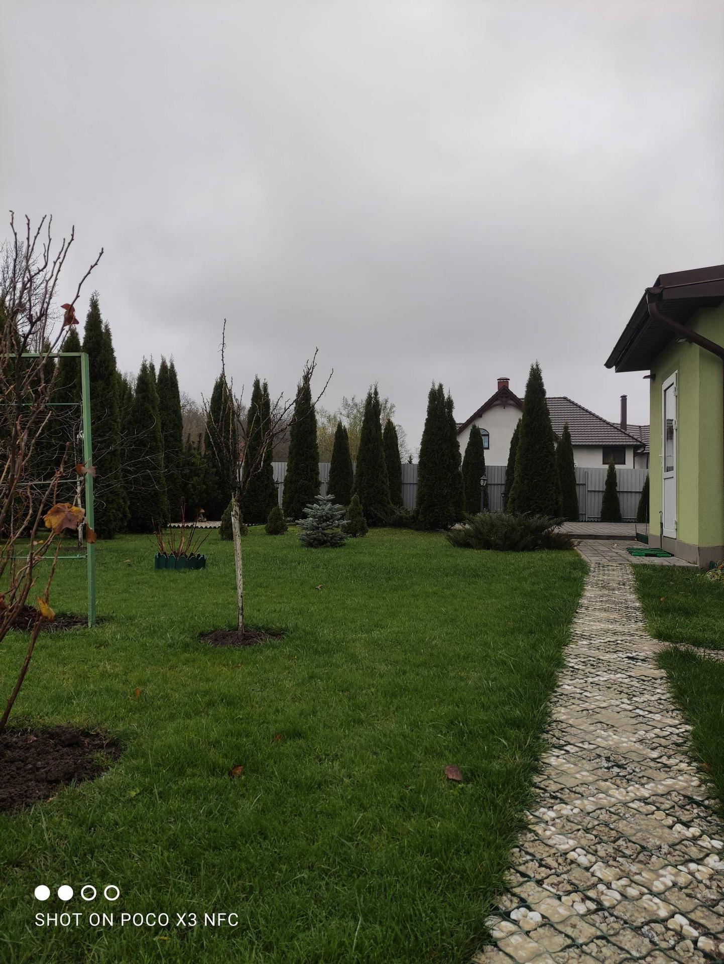 Территория вокруг дома облагорожена, уложена плитка, газон, высажены туи и плодовоягодные деревья, парник.