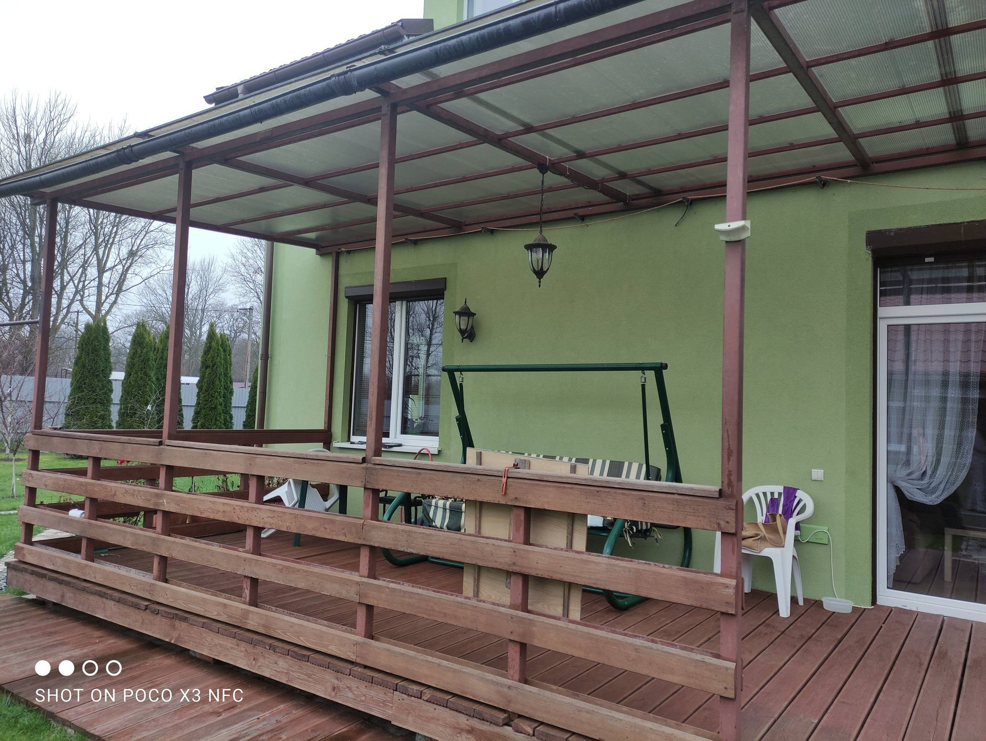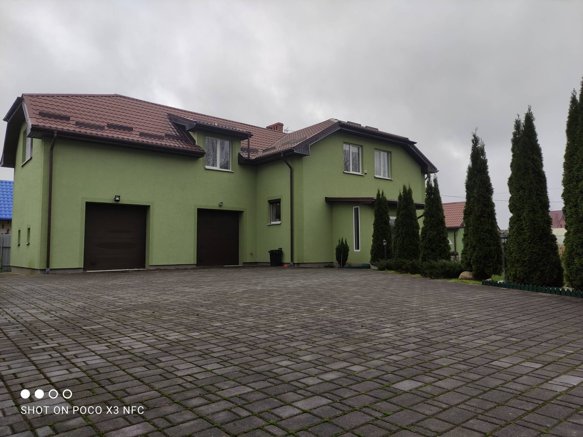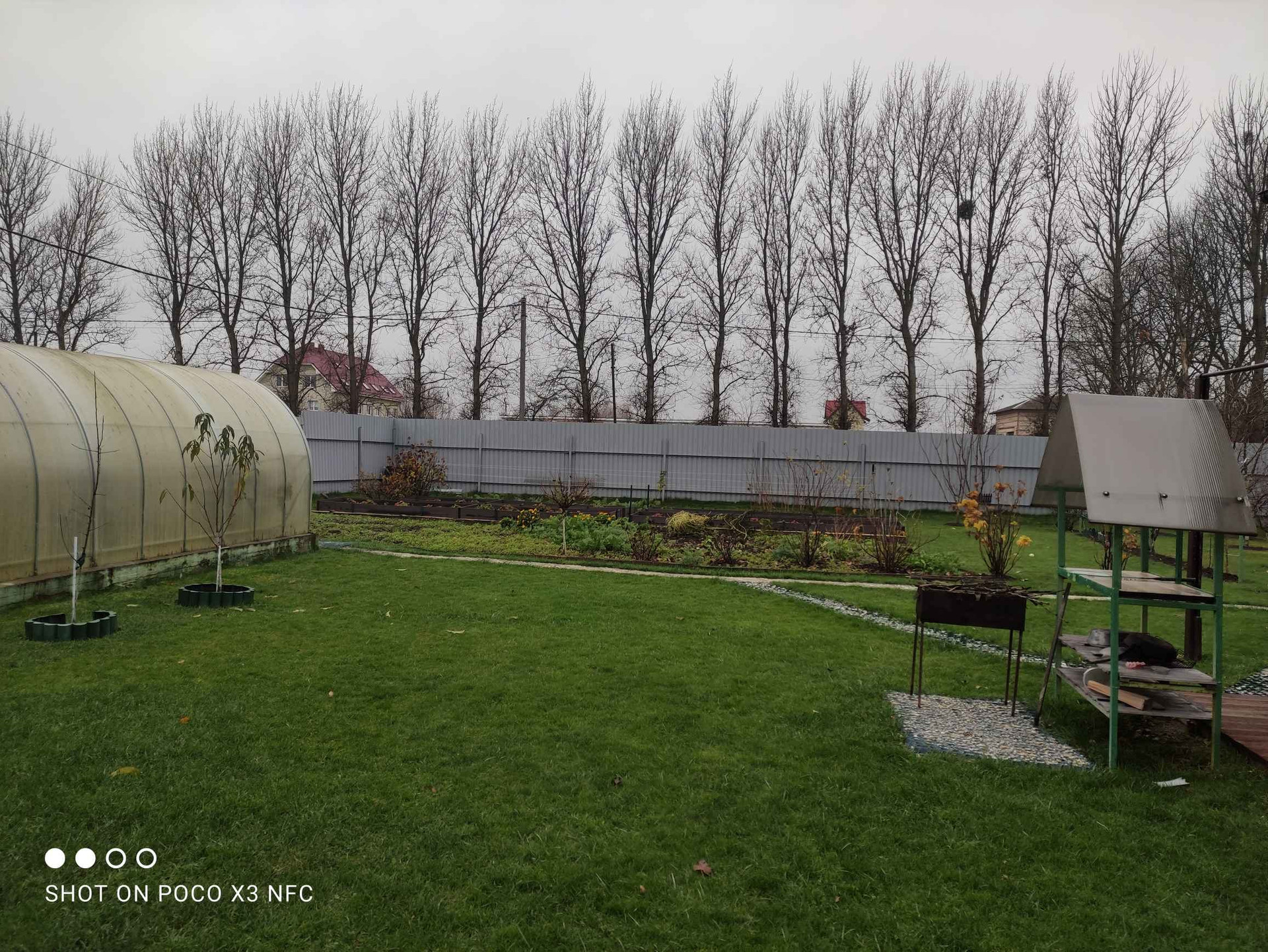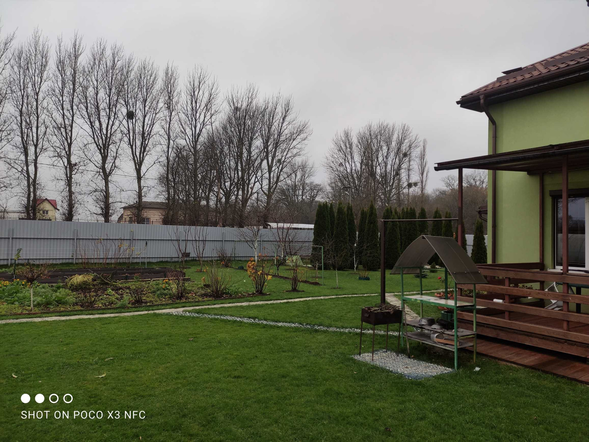 Территория вокруг дома облагорожена, уложена плитка, газон, высажены туи и плодовоягодные деревья, парник.