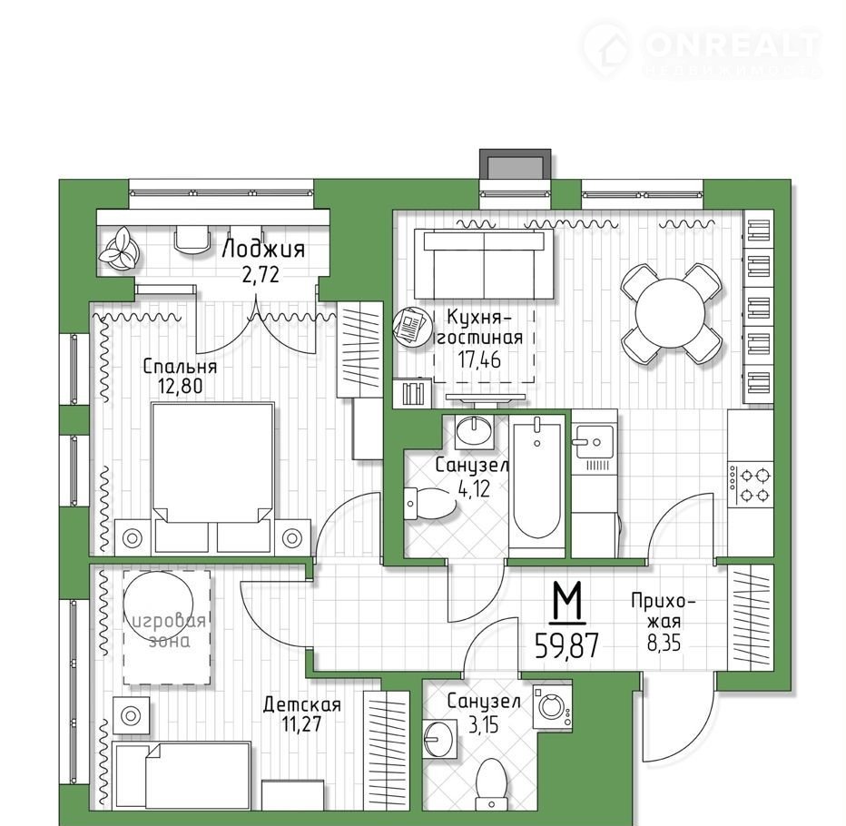 Общая площадь 59.9 м2