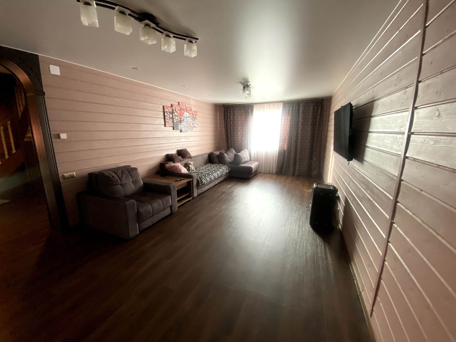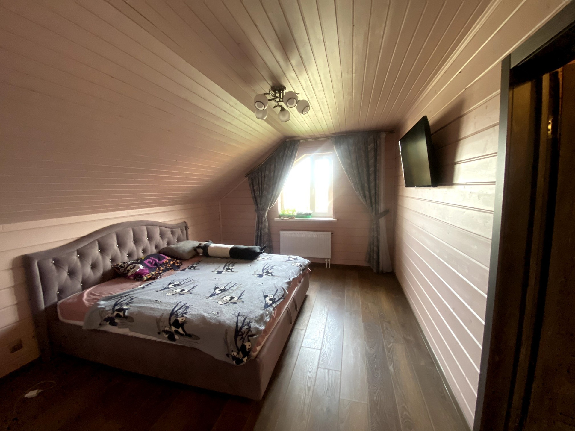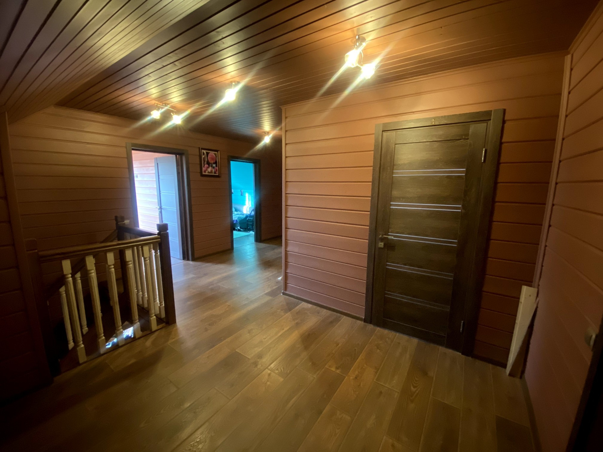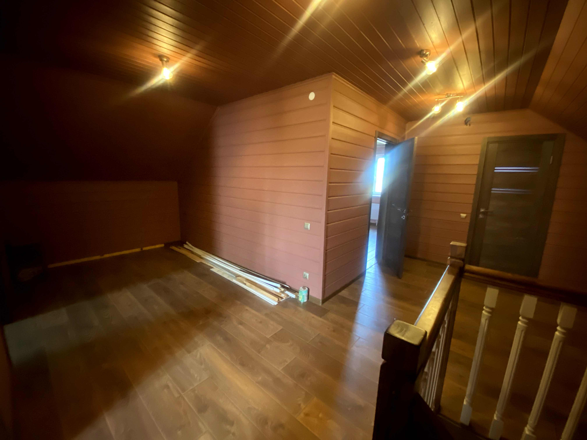Потолок на первом этаже натяжной, сатиновый. На втором этаже имитация бруса.