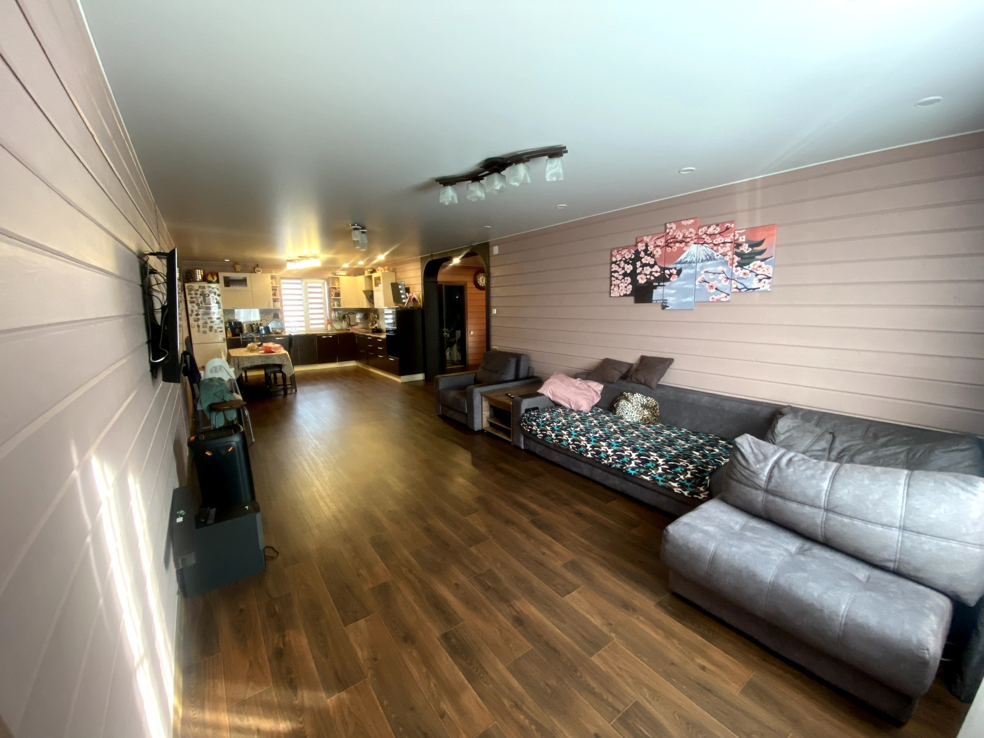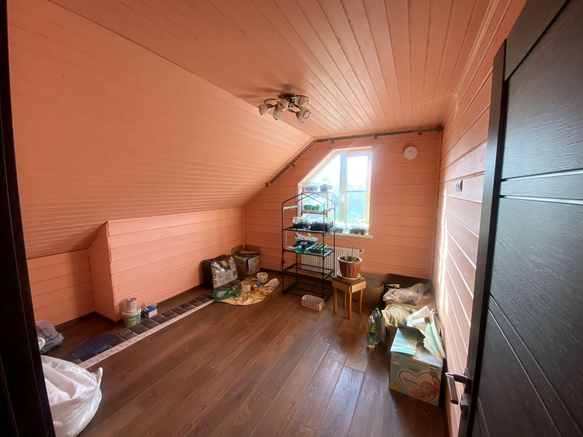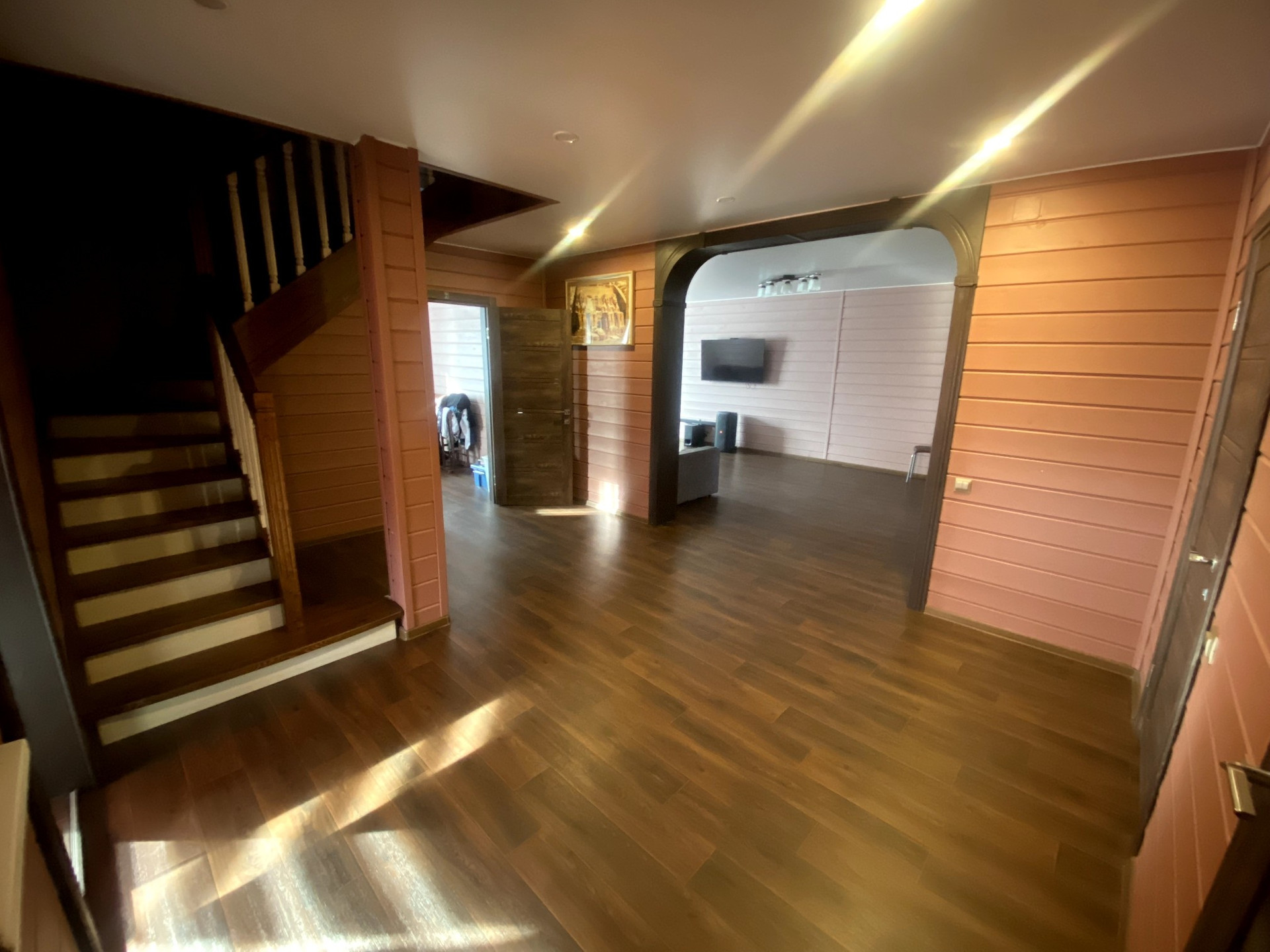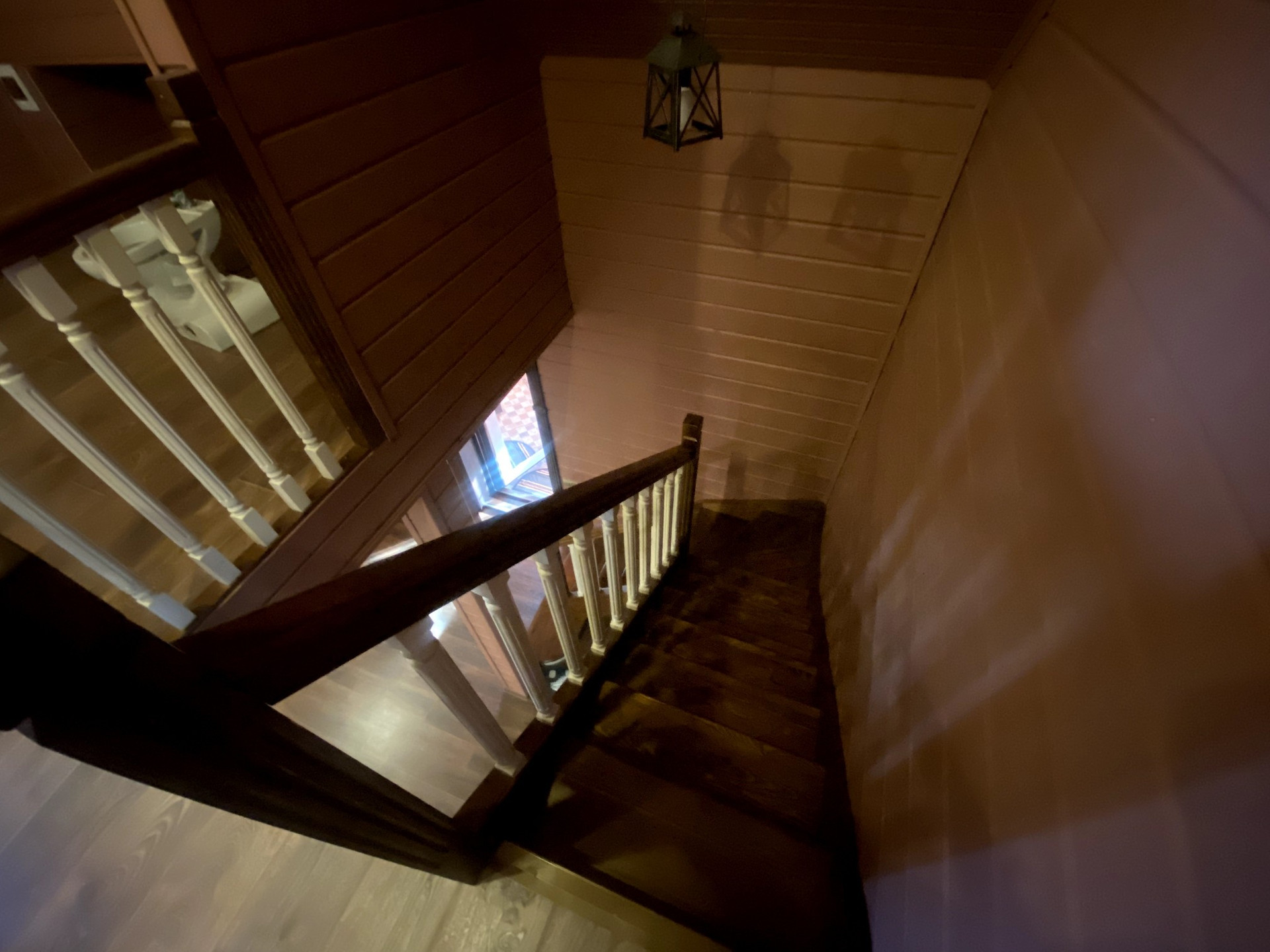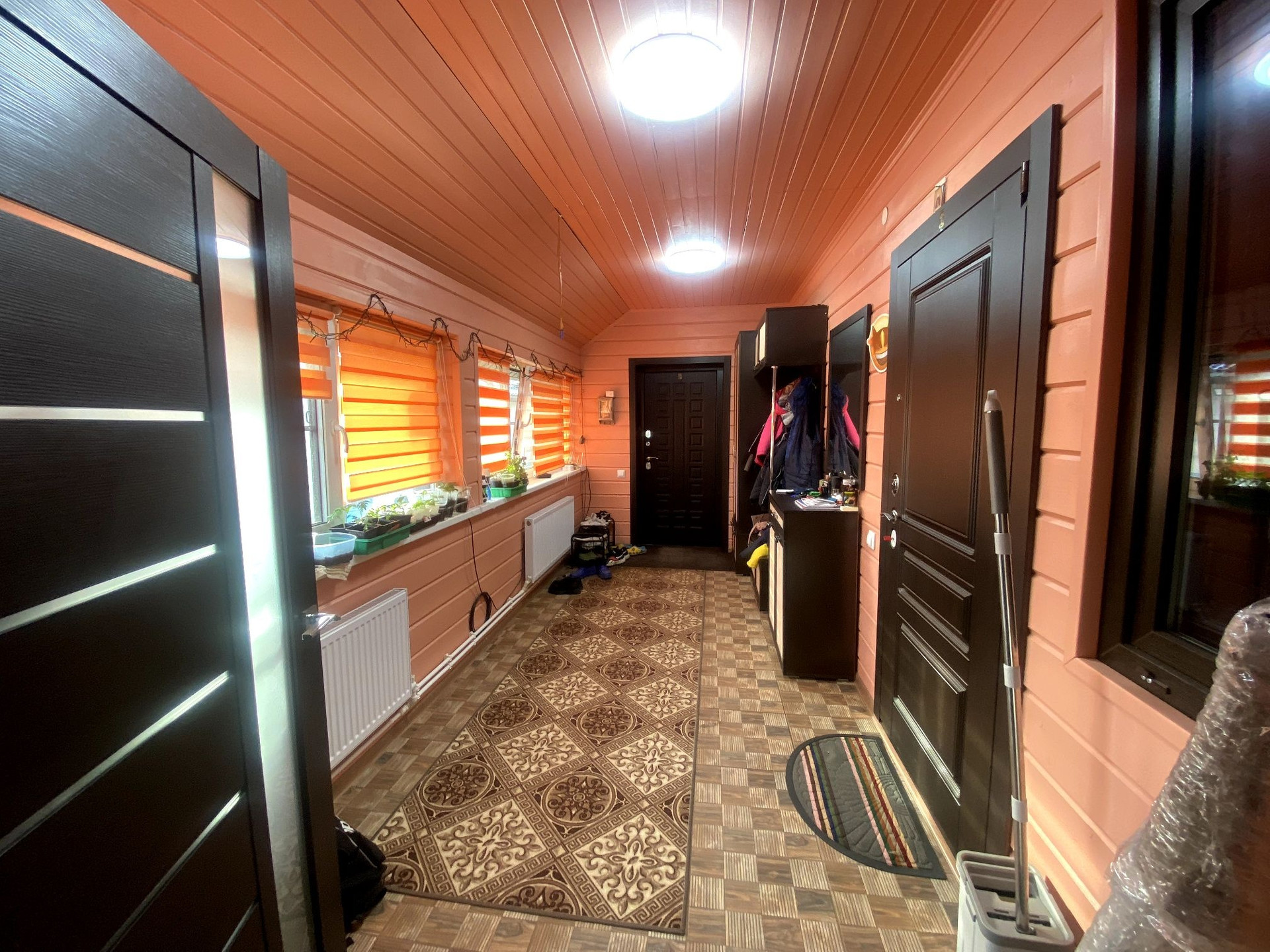 Потолок на первом этаже натяжной, сатиновый. На втором этаже имитация бруса.