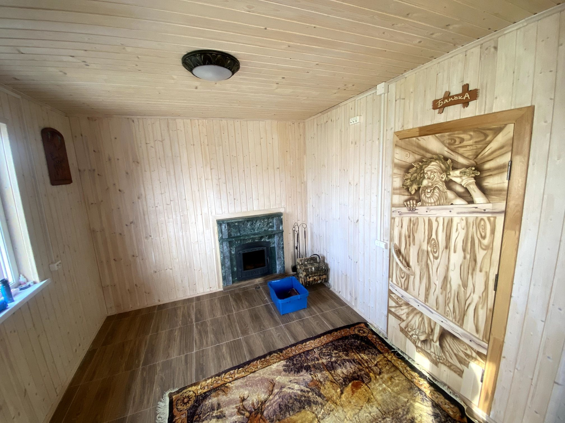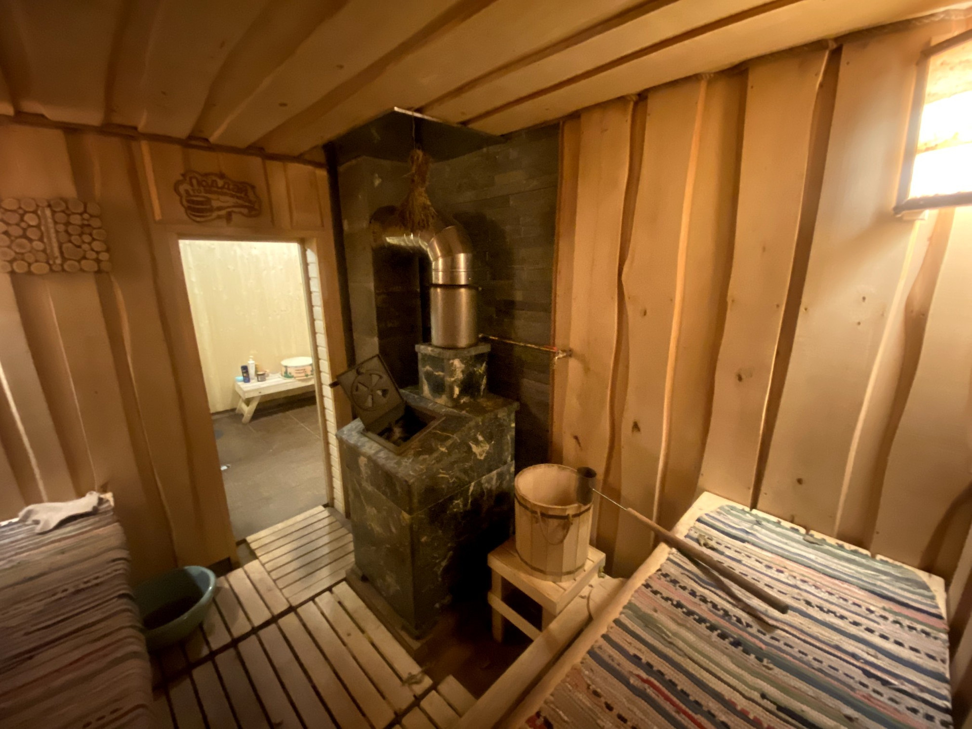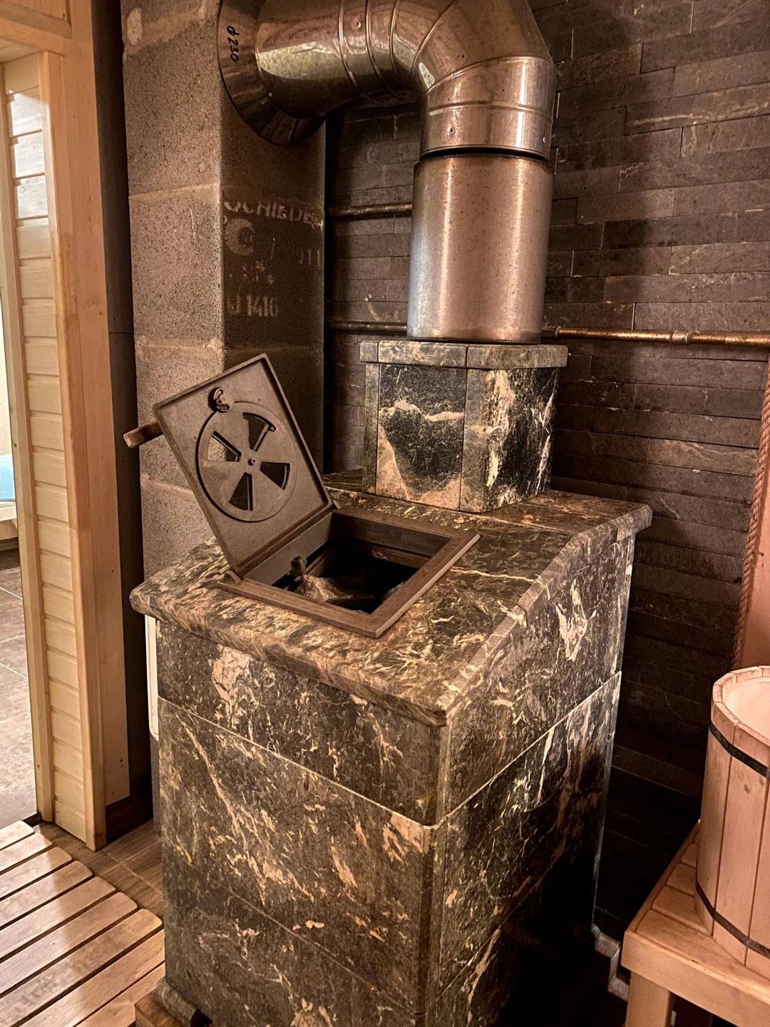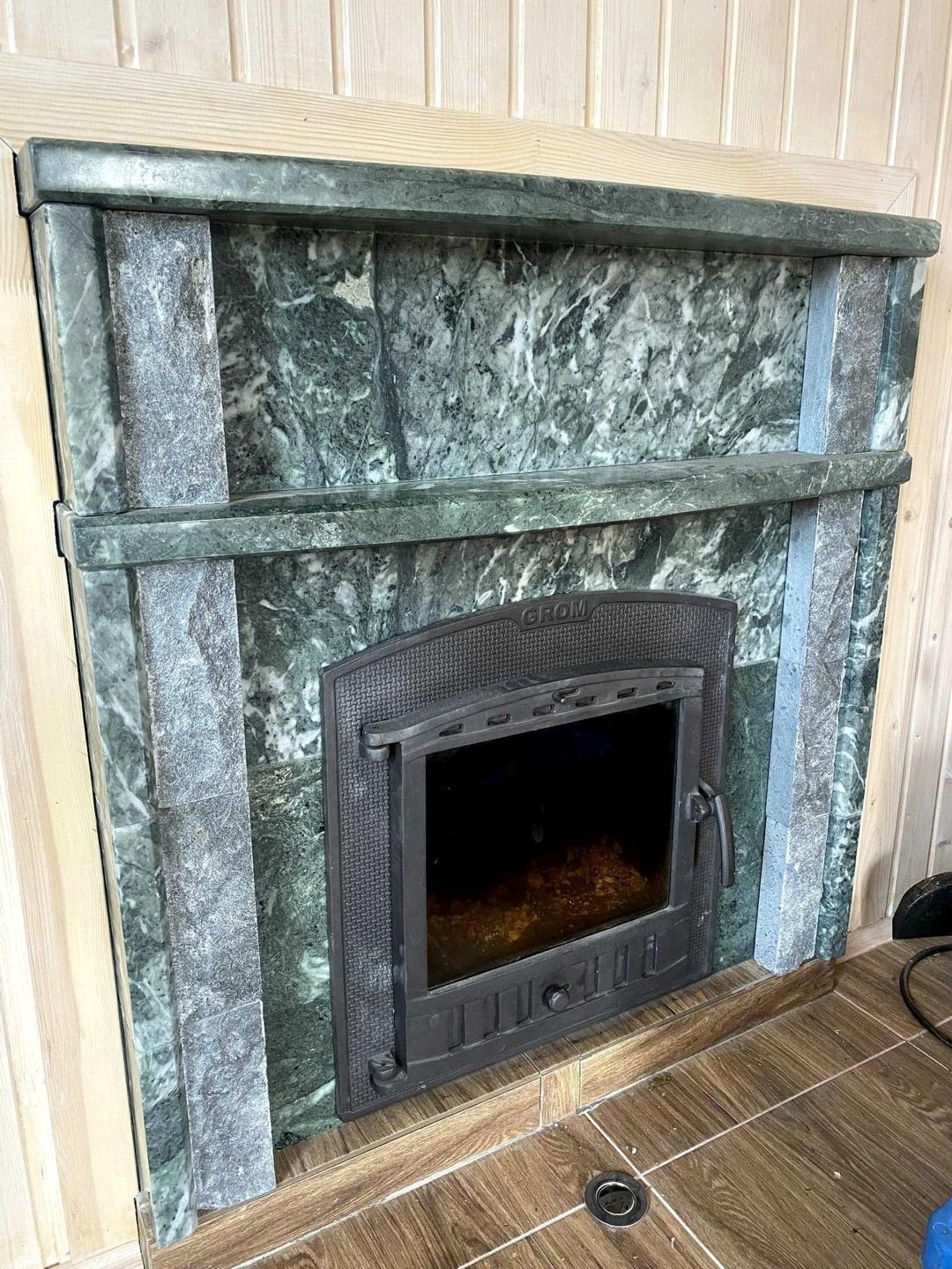 В бане установлена чугунная печь из камня змеевик, фирмы Grom.