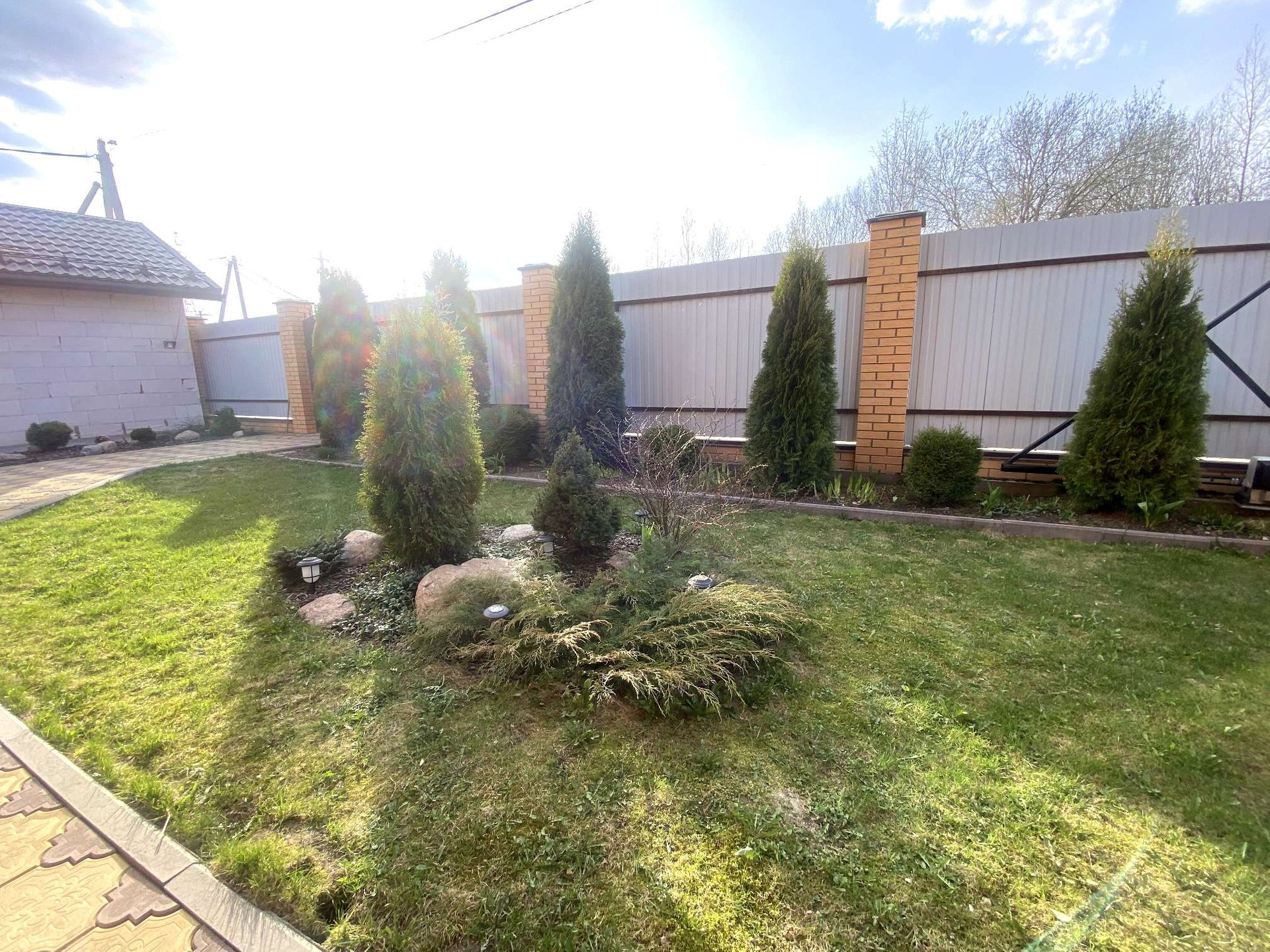 На участке высажены плодовые деревья и кустарники. Есть альпийская горка и цветники.