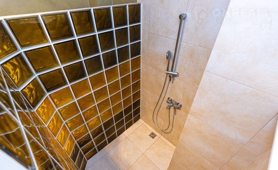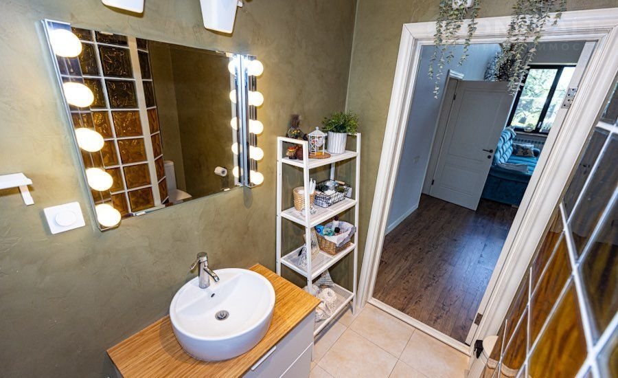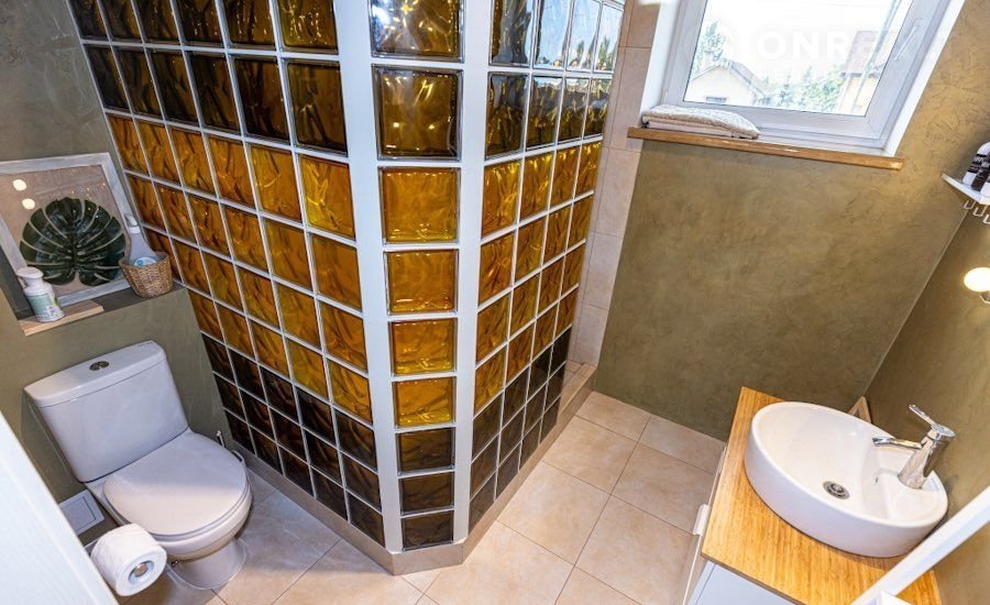 Санузел первый этаж - душевая кабина из стеклоблоков, унитаз am.pm, тумба, раковина, зеркало и подсветка - Икеа