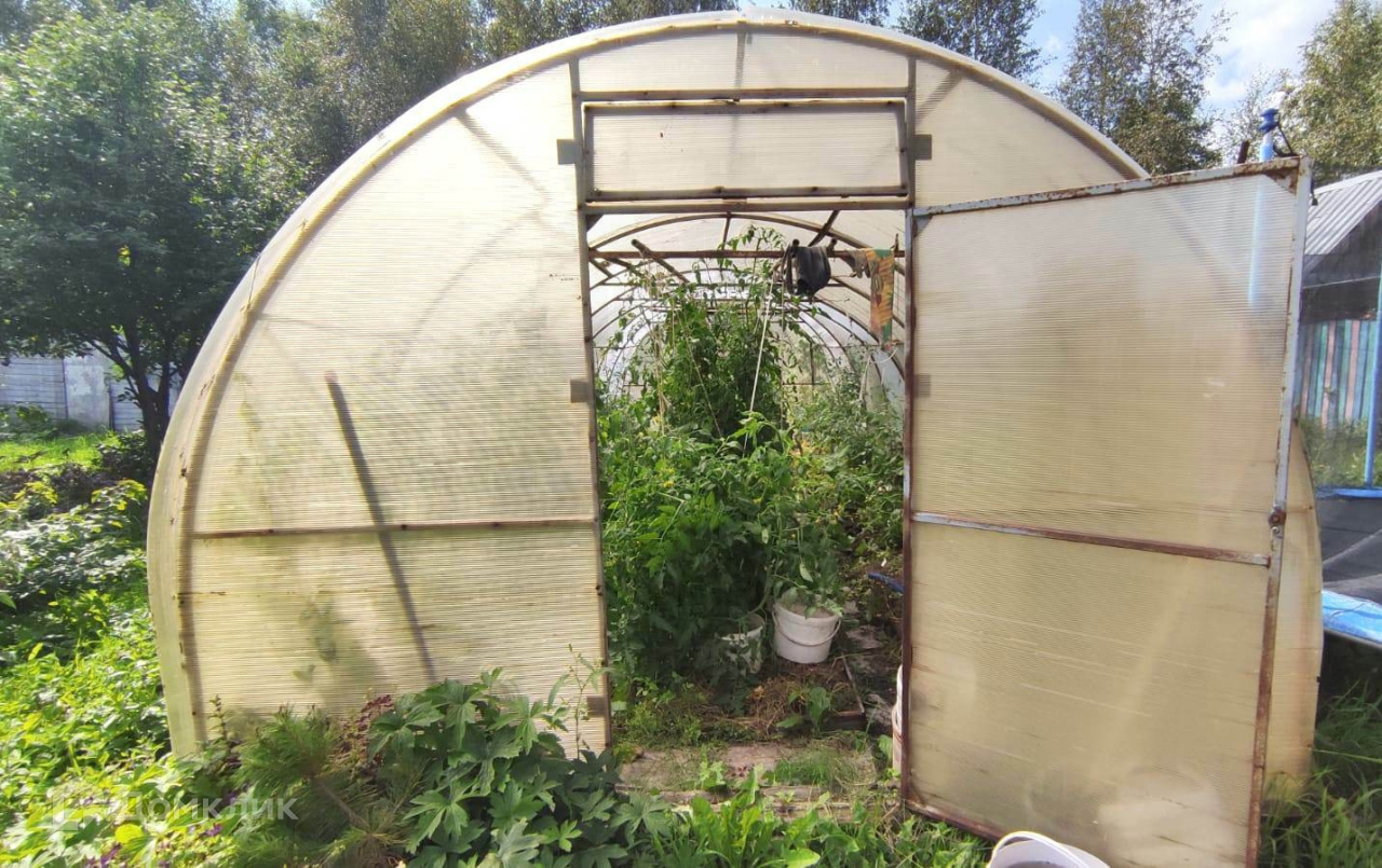 На участке 2 яблони, груша, малина, смородина, вишня, земляника, многолетние цветы и т.д., есть теплица 3*8.
