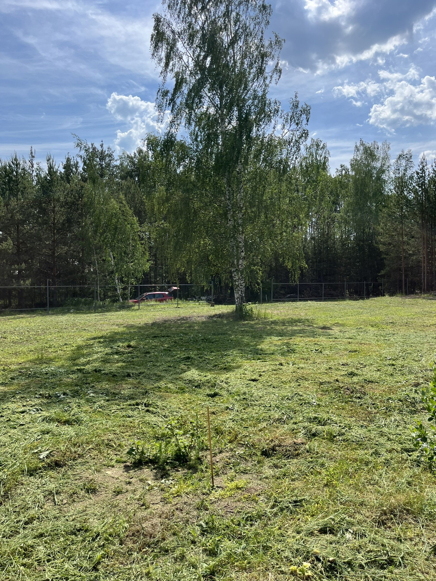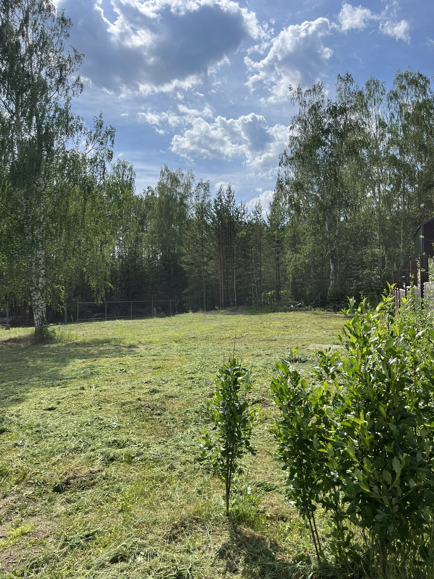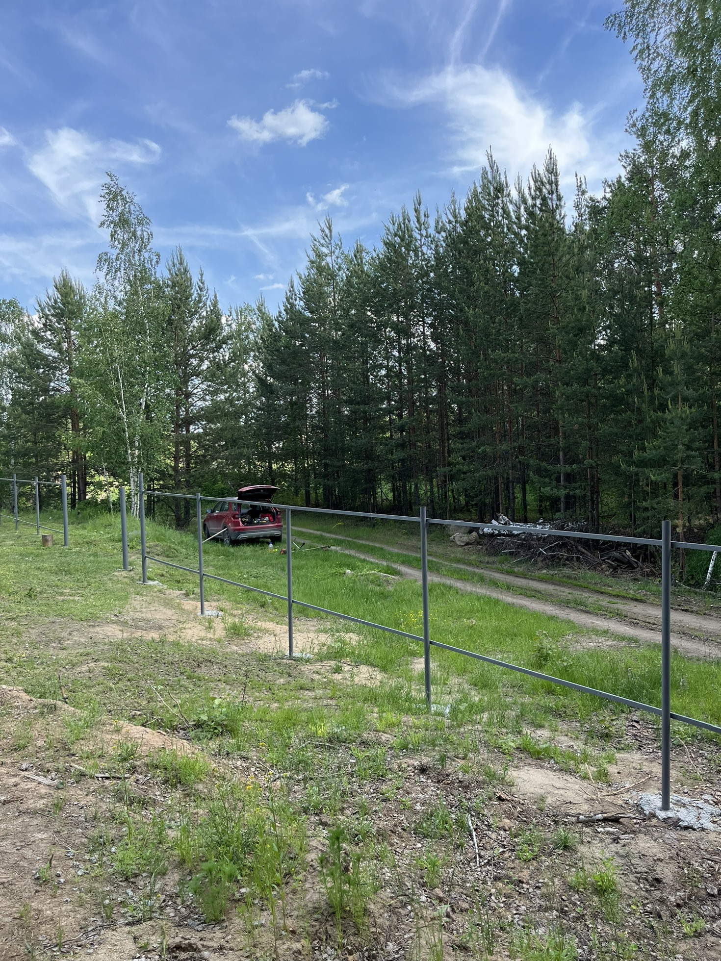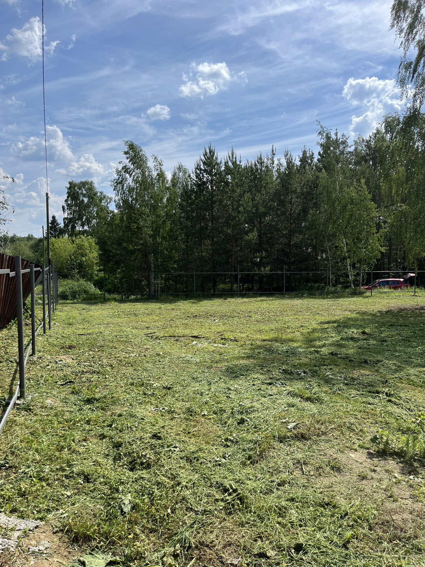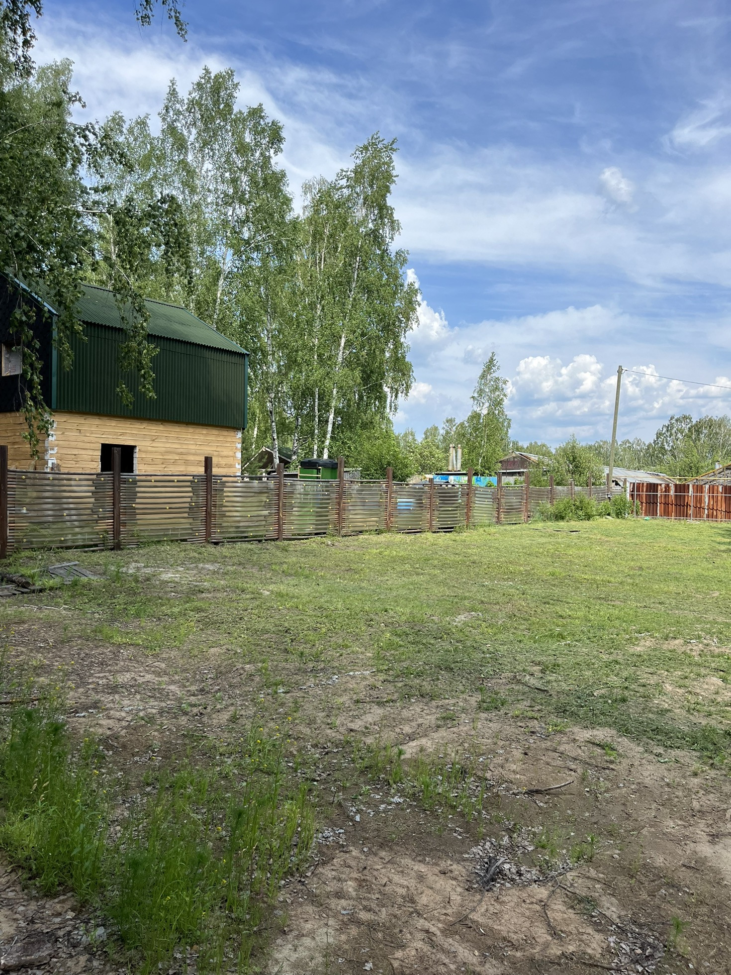 Газ за забором. Электричество вдоль границы(от соседей времянка со счетчиком). Скважина действующая глубиной 45м+- на участке. Металл каркаса забора сварен и почти покрашен. Въезд шириной 4,5м, калитка 1м.
