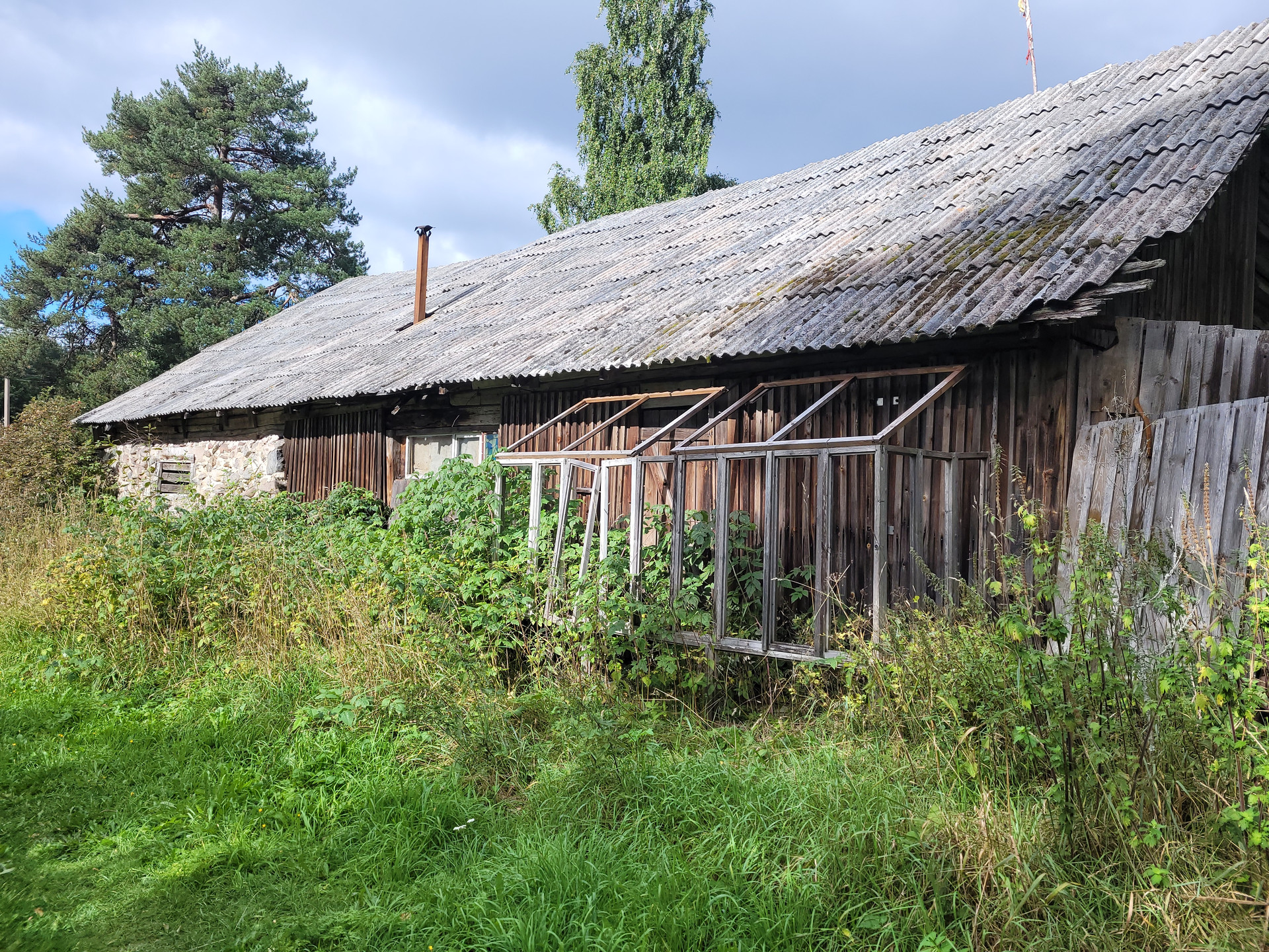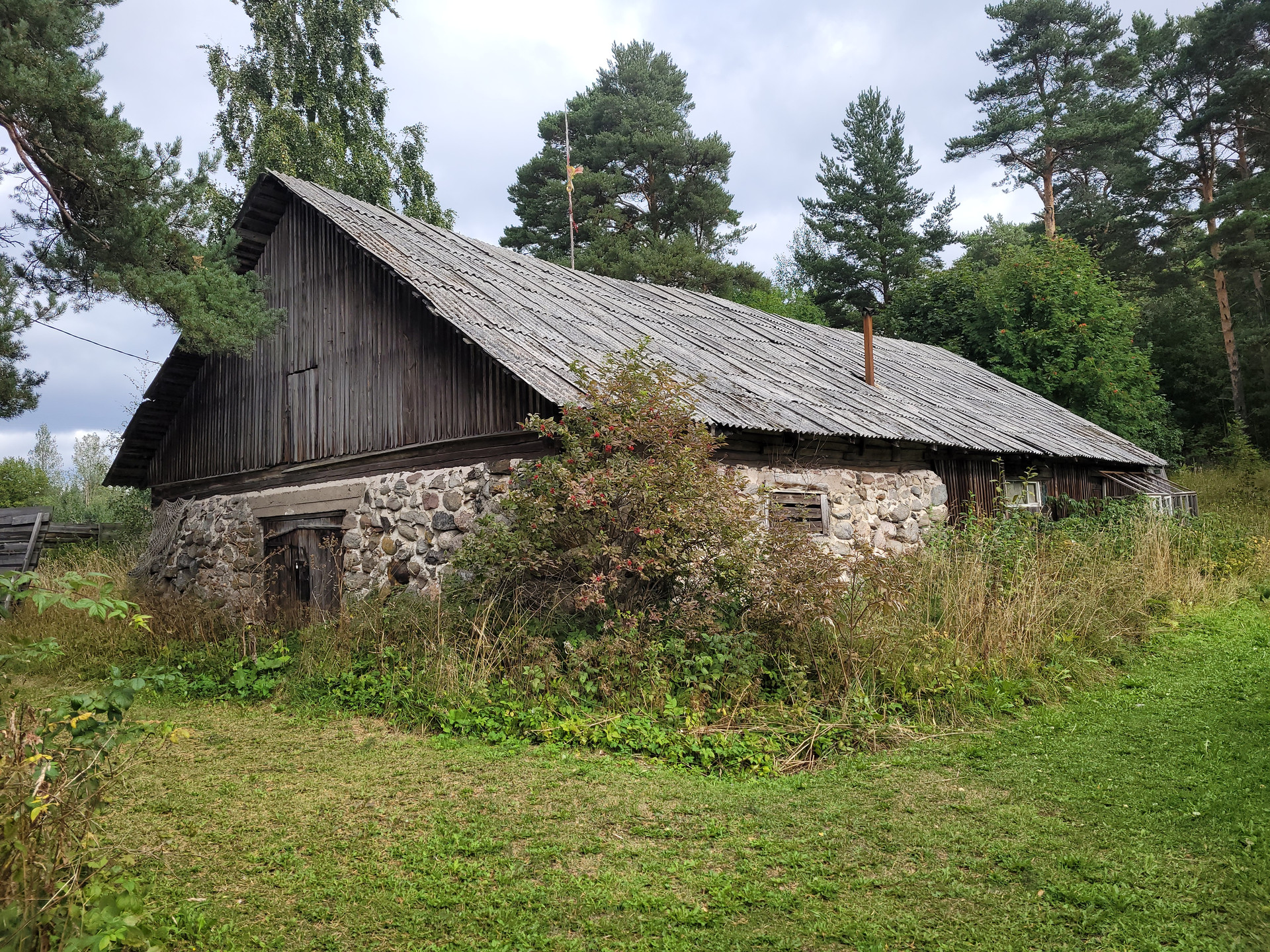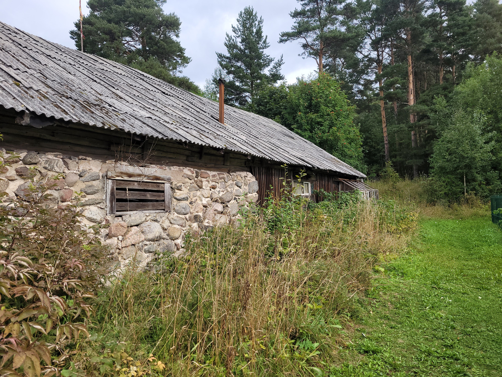 Участок высокий, огорожен от дороги.  На территории финское каменное строение с деревянной пристройкой. Рядом сосновый лес.