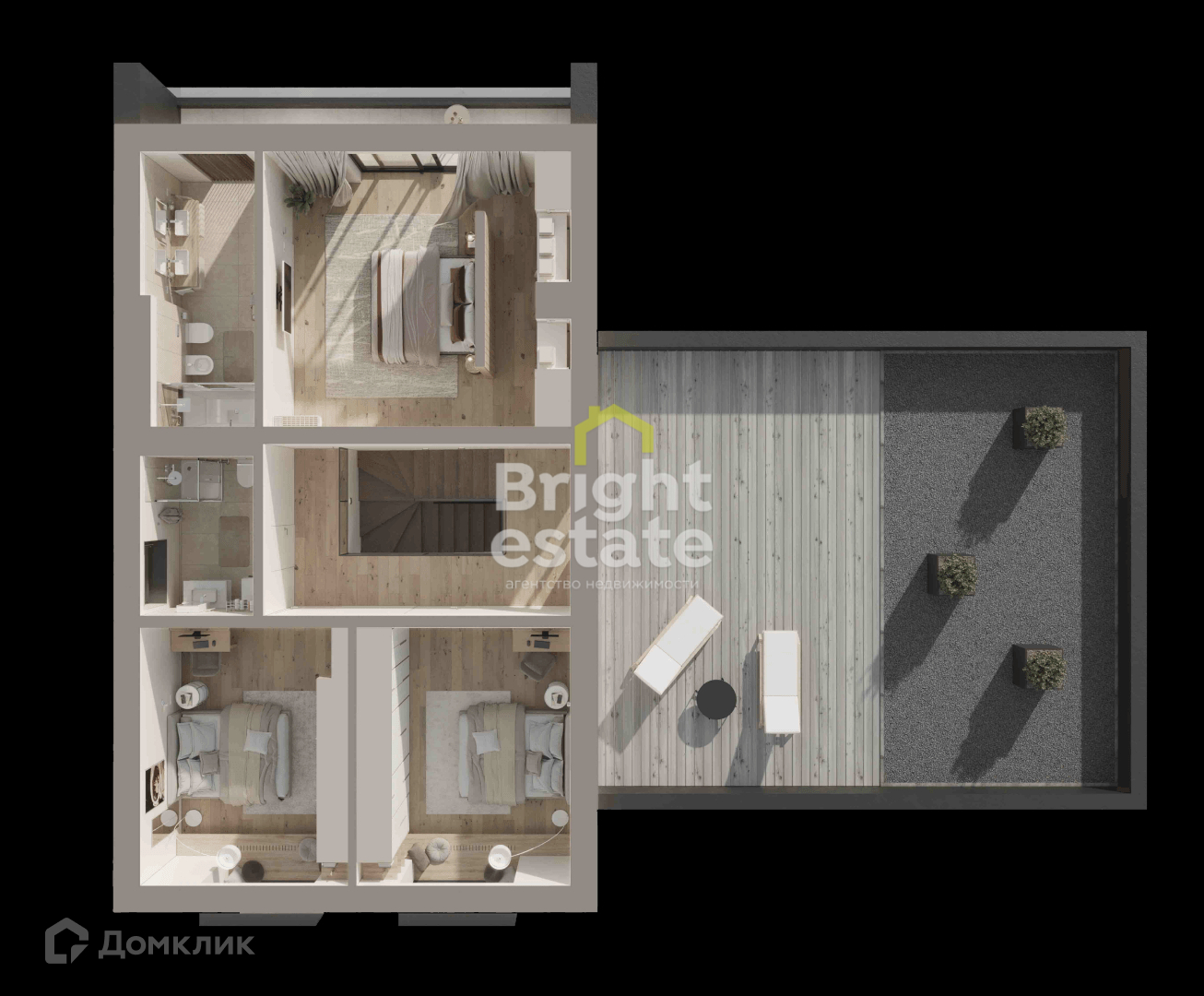2 этаж: терраса, балкон, мастер-спальня с гардеробной и с/у, холл, с/у, 2 детские спальни.