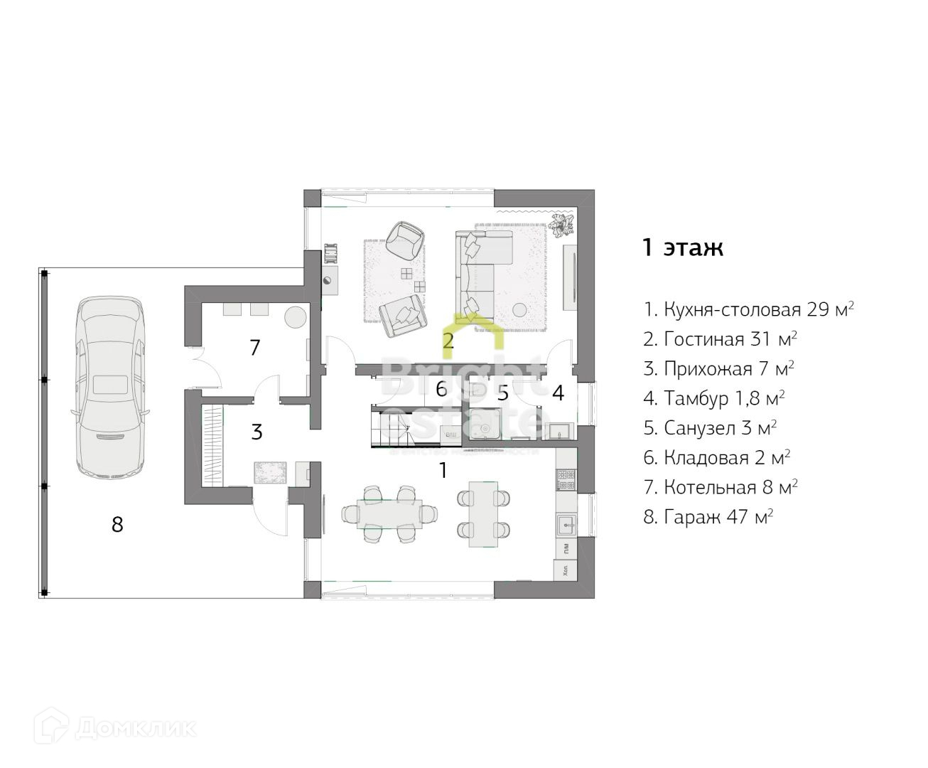 1 этаж: гараж, холл, котельная, гостиная с камином, кладовая, с/у, кухня-столовая.