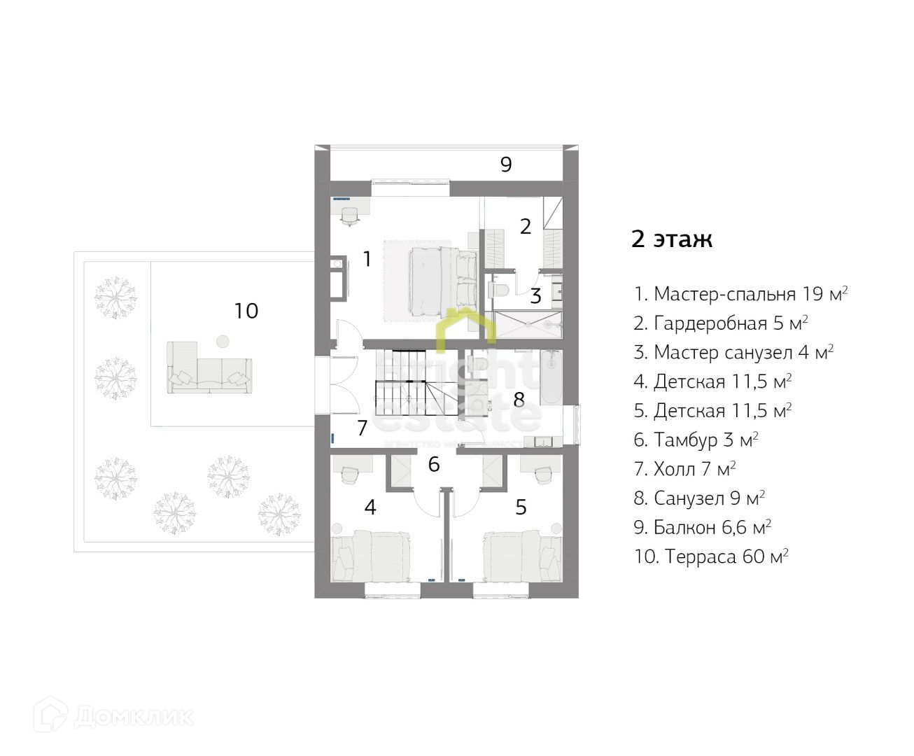 2 этаж: терраса, мастер-спальня с балконом, с/у и гардеробной, холл, 2 детские спальни, с/у, гардеробная.