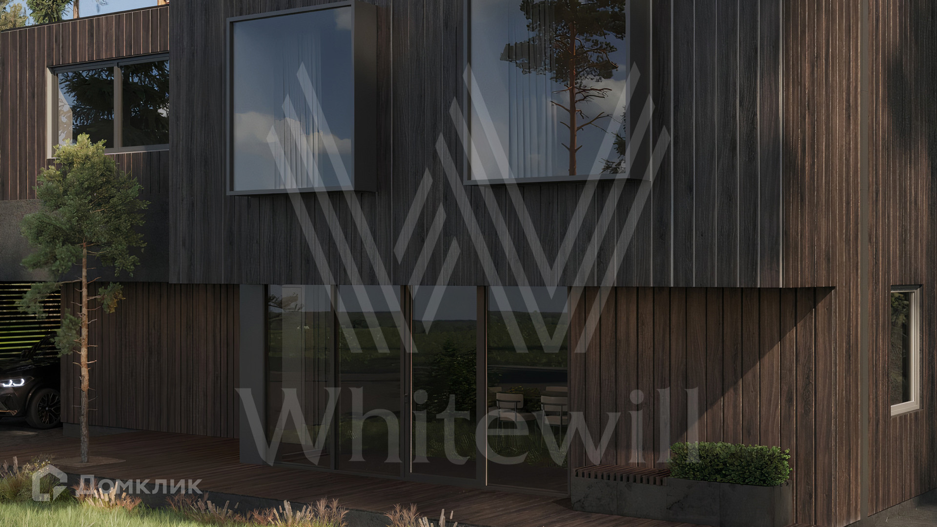 ID 11 575. Ильинские холмы. Загородный дом по проекту L площадью 485 м² расположен на прилесном участке 13 соток. Темный фасад здания облицован лиственницей с заводским покрытием маслом Biofa и декорирован архитектурной подсветкой. Благодаря большой площади остекления и потолкам высоток 2,9 метра внутреннее пространство наполнено воздухом и светом. В коттедже без отделки можно реализовать индивидуальный дизайн-проект. В резиденции разместили 3 спальни, гостиную с камином, кухню-столовую, 2 кабинета, комнату отдыха, хаммам и просторную террасу на втором этаже. К дому пристроен навес для машины. На участке выполнен ландшафтный дизайн и оборудована зона отдыха вокруг кострища.