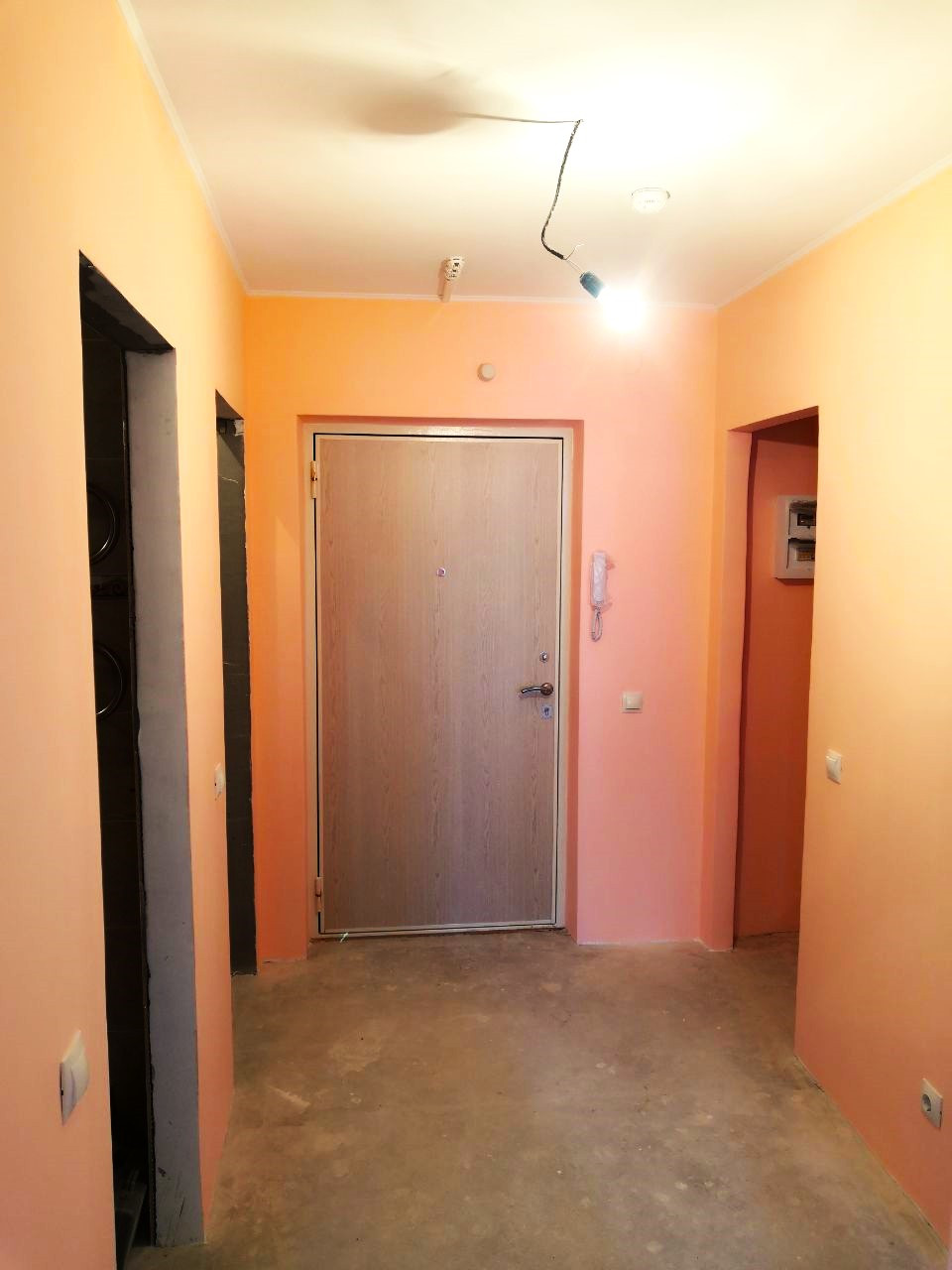 Прихожая: стены и потолок готовы к эксплуатации, пол подготовлен под отделку.