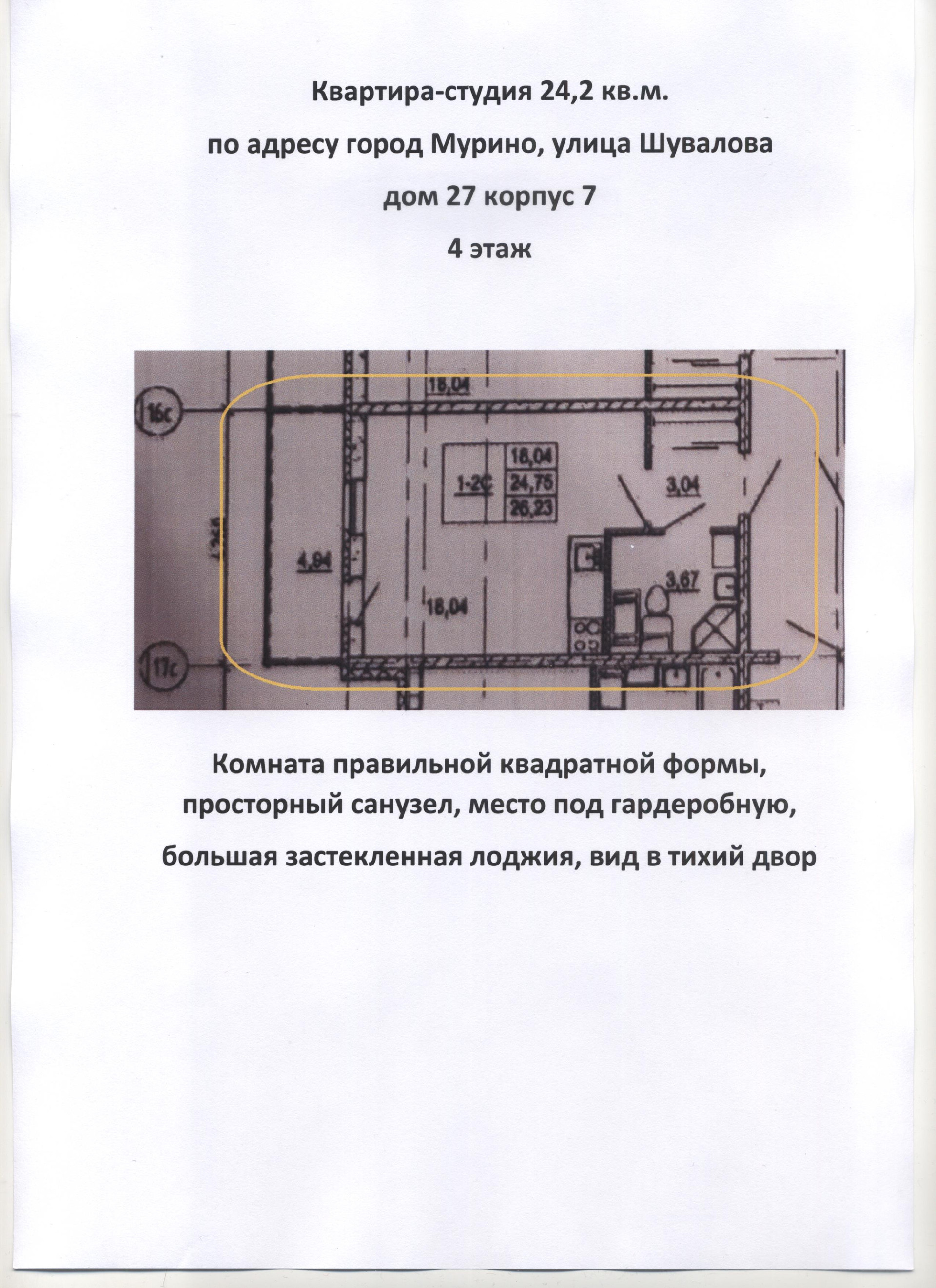 Квартира студия, 24.2 м2, этаж 4 / 20, на продажу в посёлке Мурино, улица Шувалова, 27/7