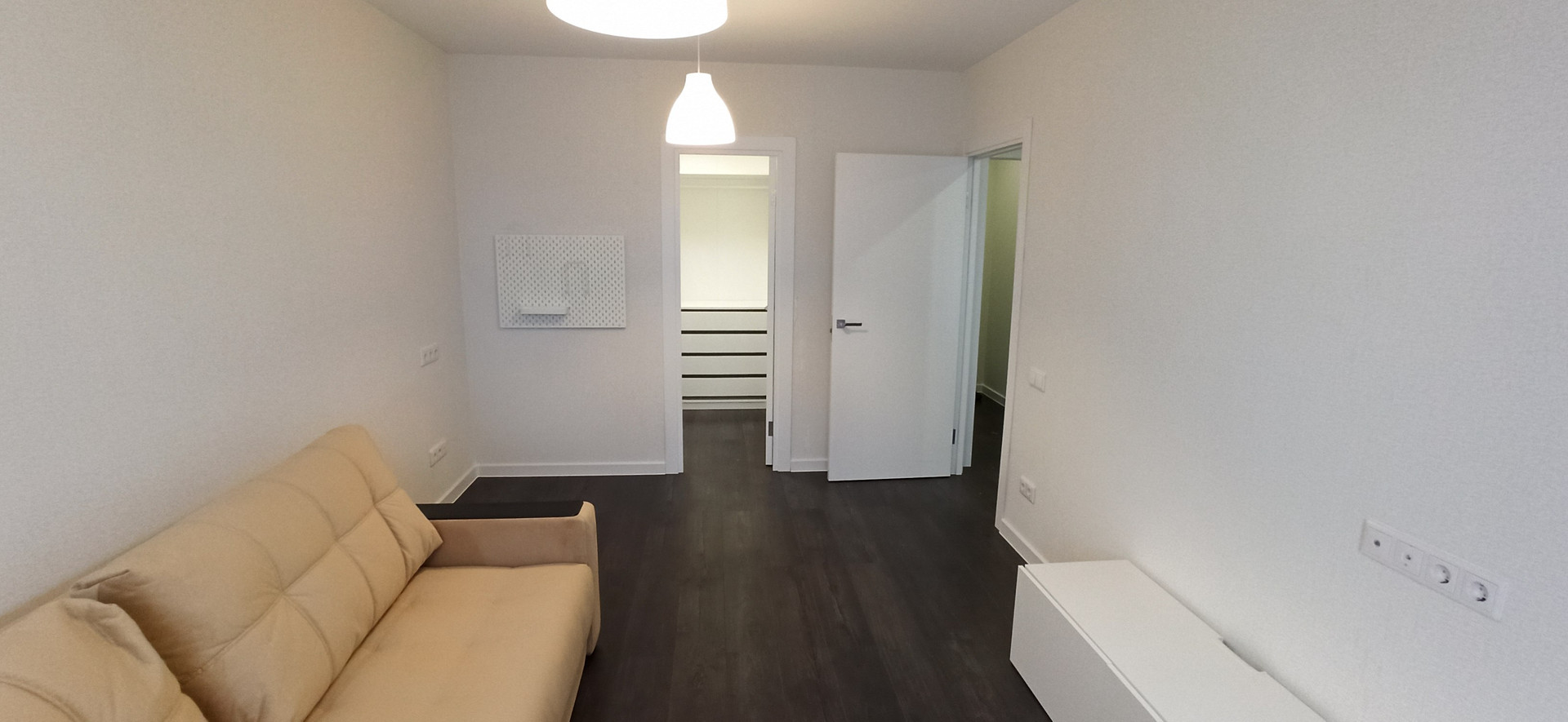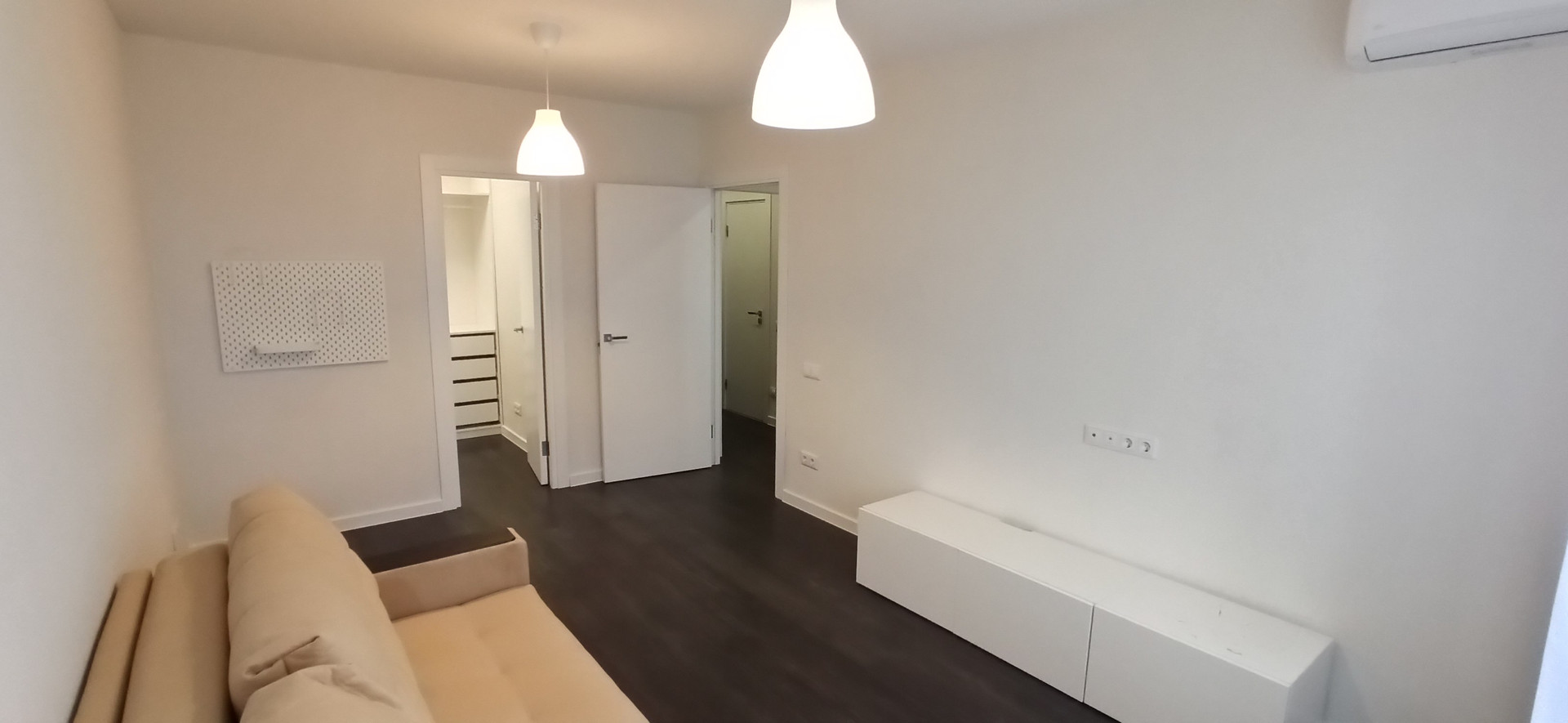 В комнате сплит система с выводом на веранду, подходит как и для охлаждения так и для обогрева если недостаточно регулируемых батарей или необходимо нагреть и просушить квартиру в дождливый день, большая гардеробная благодаря которой не нужен шкаф и/или комод. Розетки с прямым выходом для интернета и тв. В данный момент диван со спальным местом 200х150, уже заказана кровать и пружинный матрас со спальным местом 200х140, ждем доставки.
