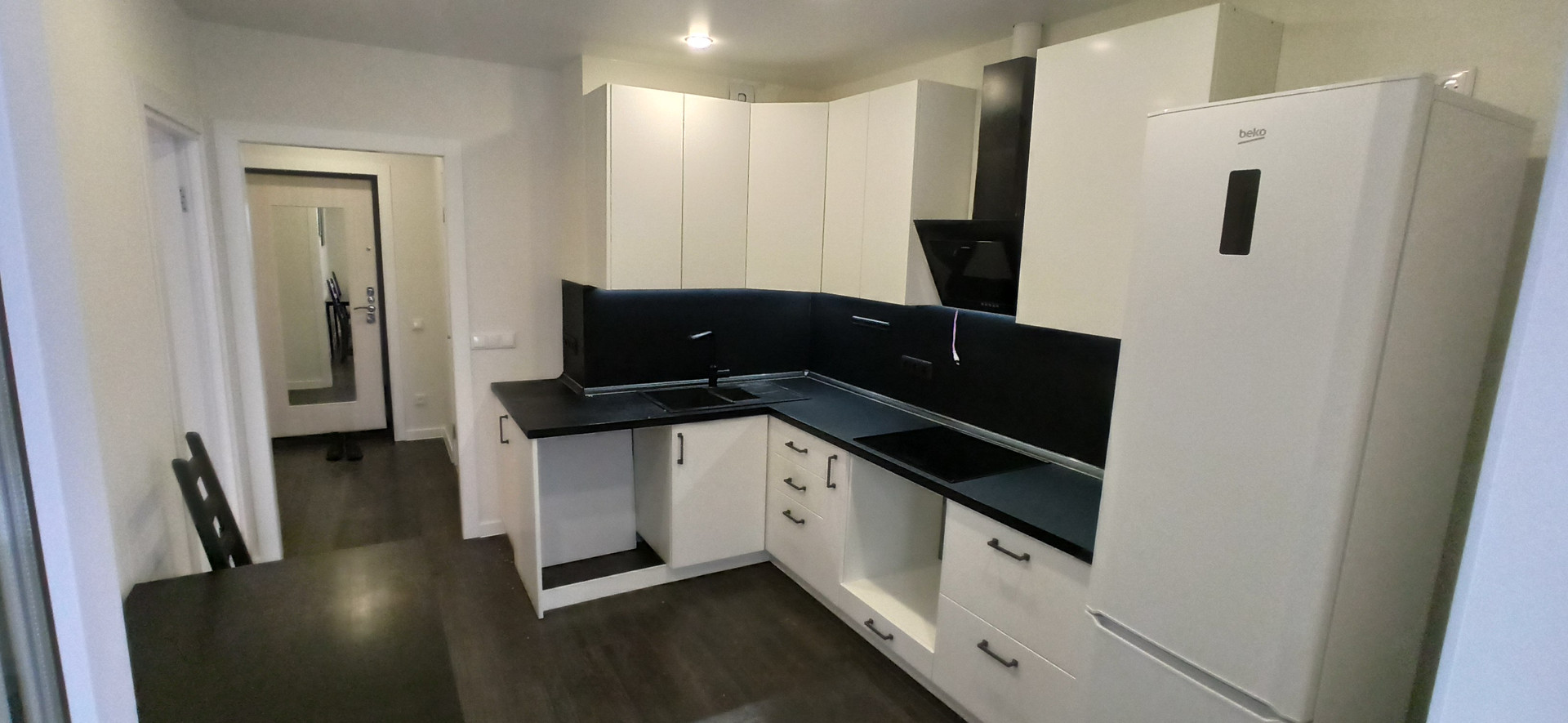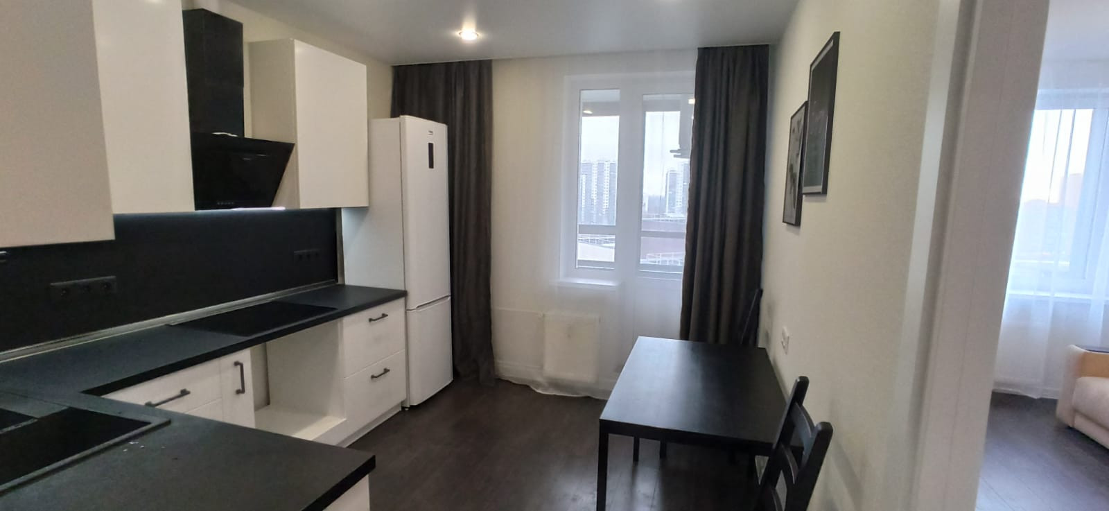На кухне индукционная плита, вытяжка, доп вентелятор на общей вытежке, встроенный в кран фильтр питьевой воды