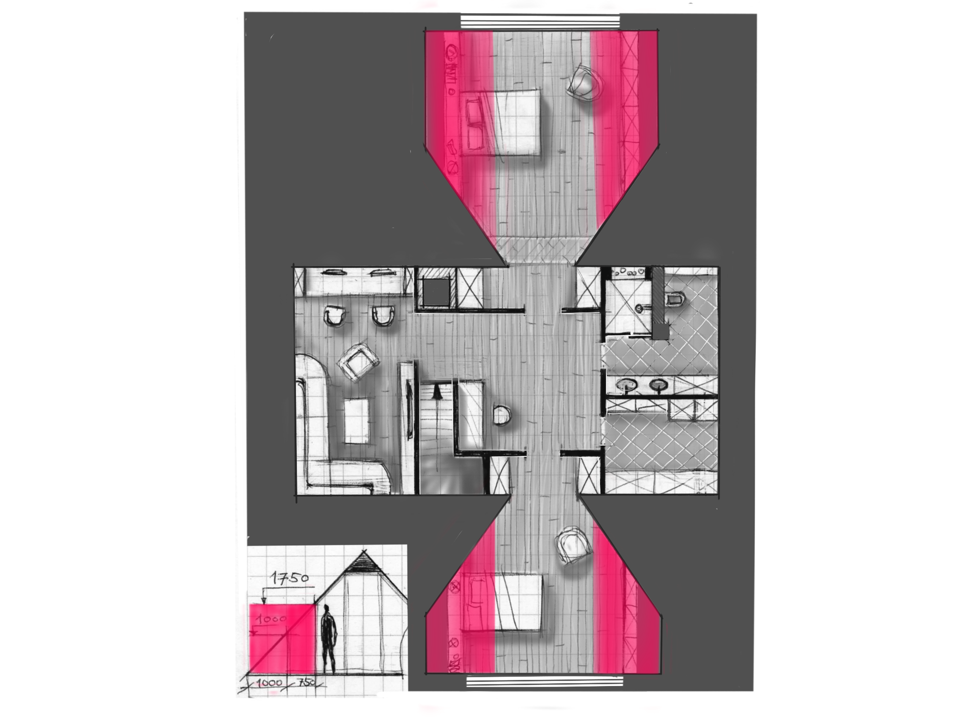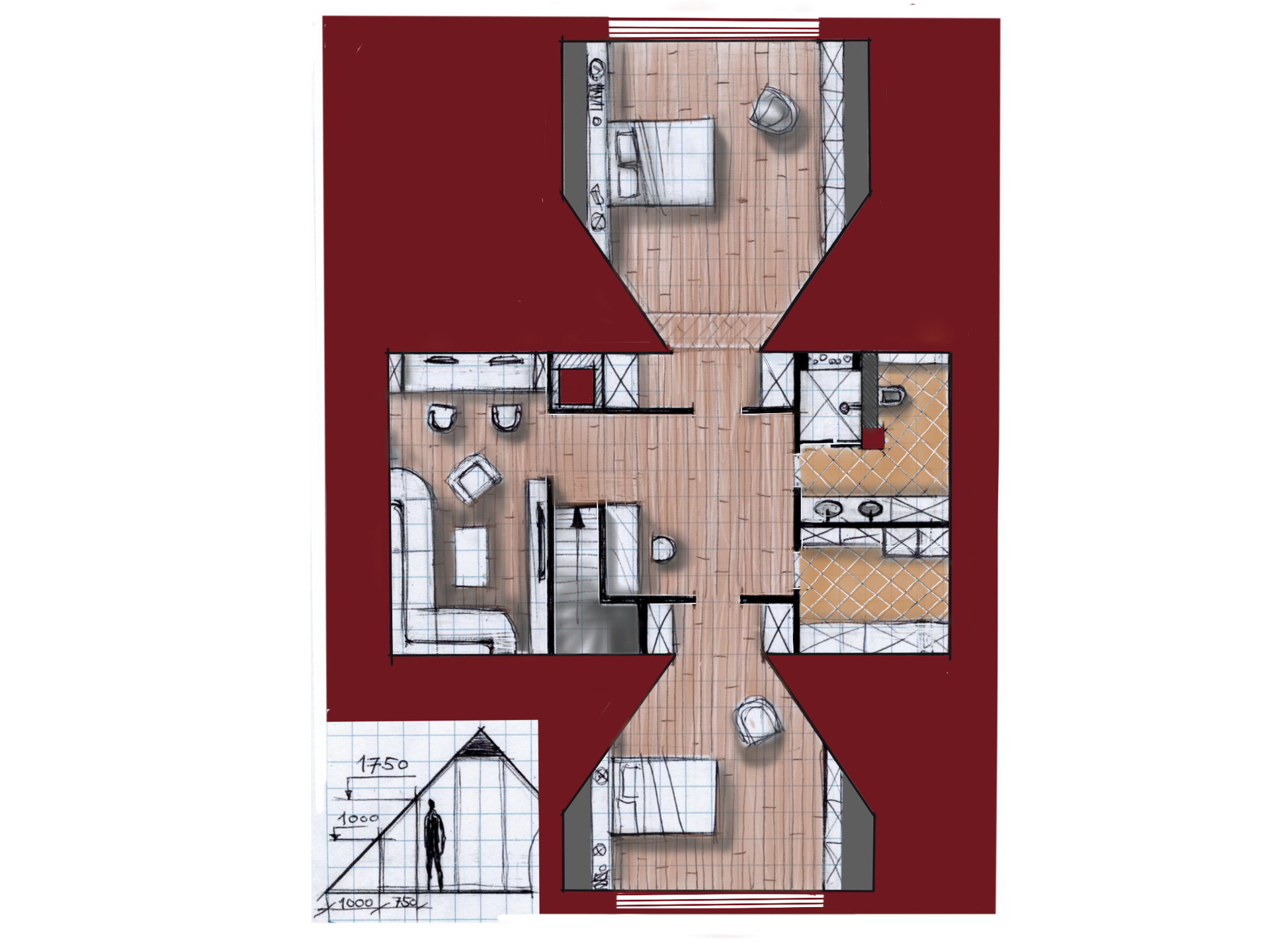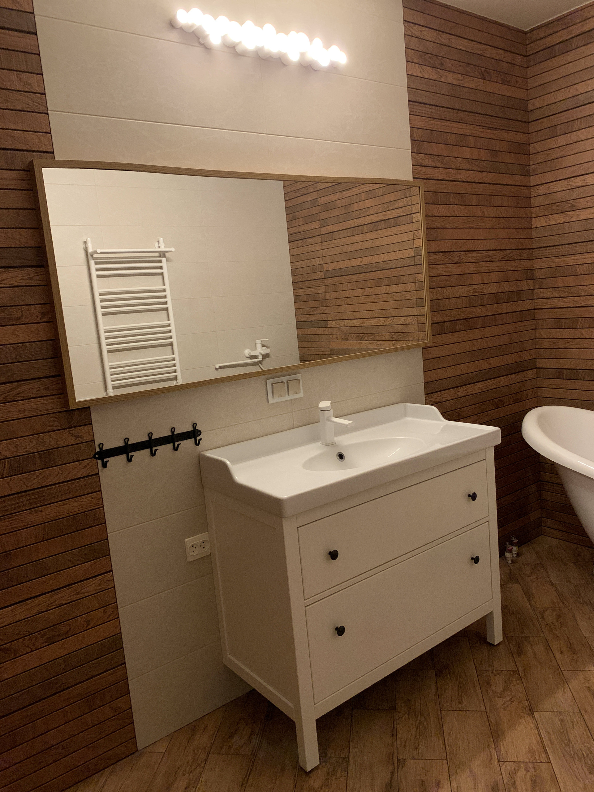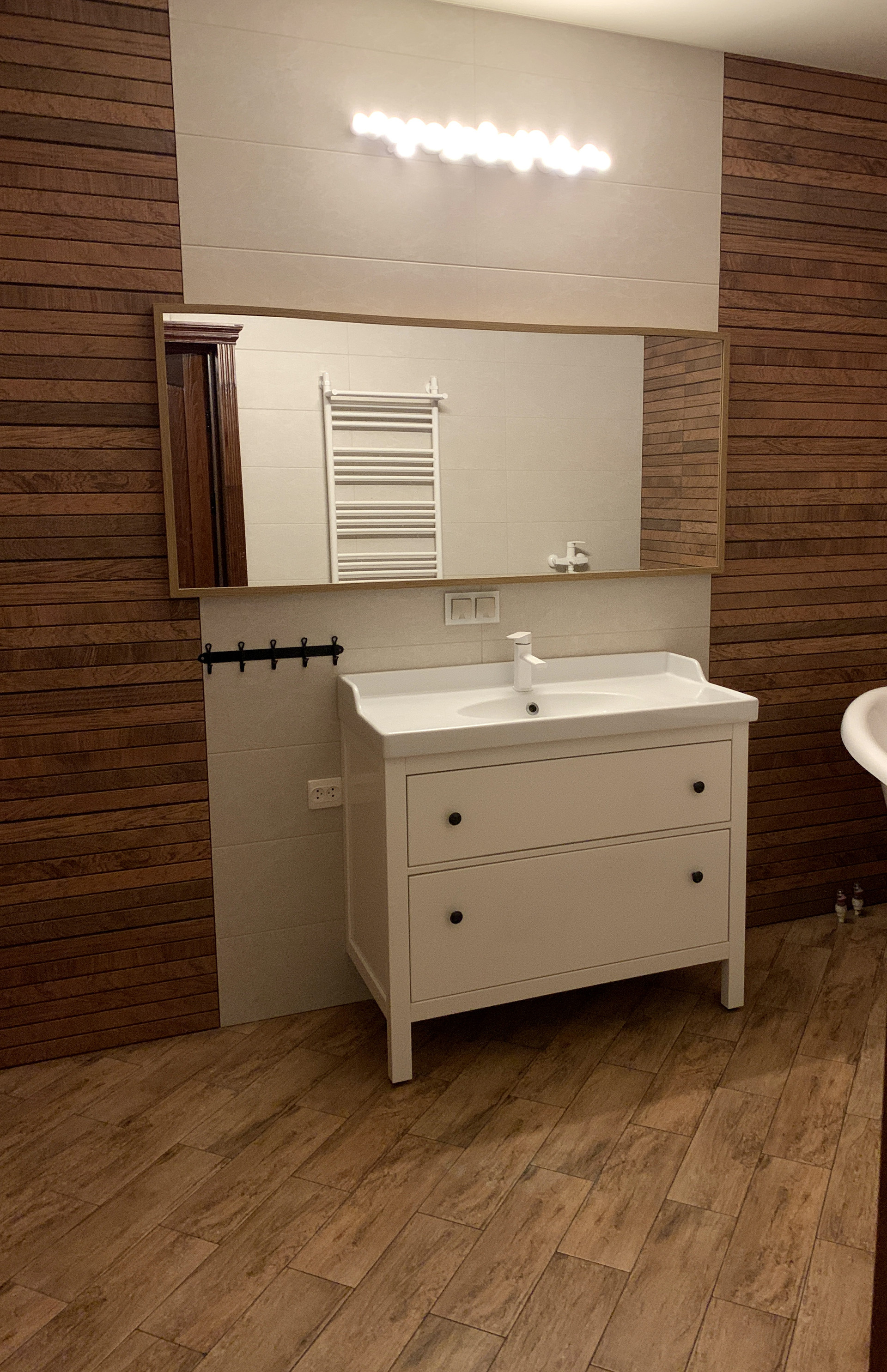 В центре дома, лицом в кухню-столовую, построена Русская печь с горнилом и уютной лежанкой в спальных комнатах. Облицовочный кирпич печи - ручной формовки Milano WFD Terca, Бельгия. Выход в сад проходит через благоустроенную террасу.