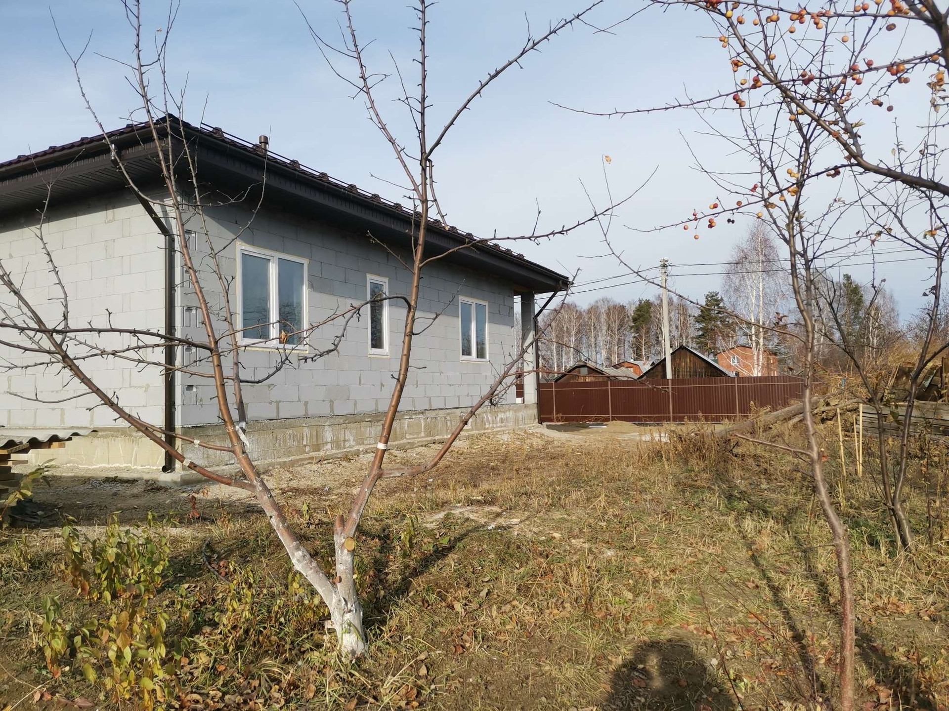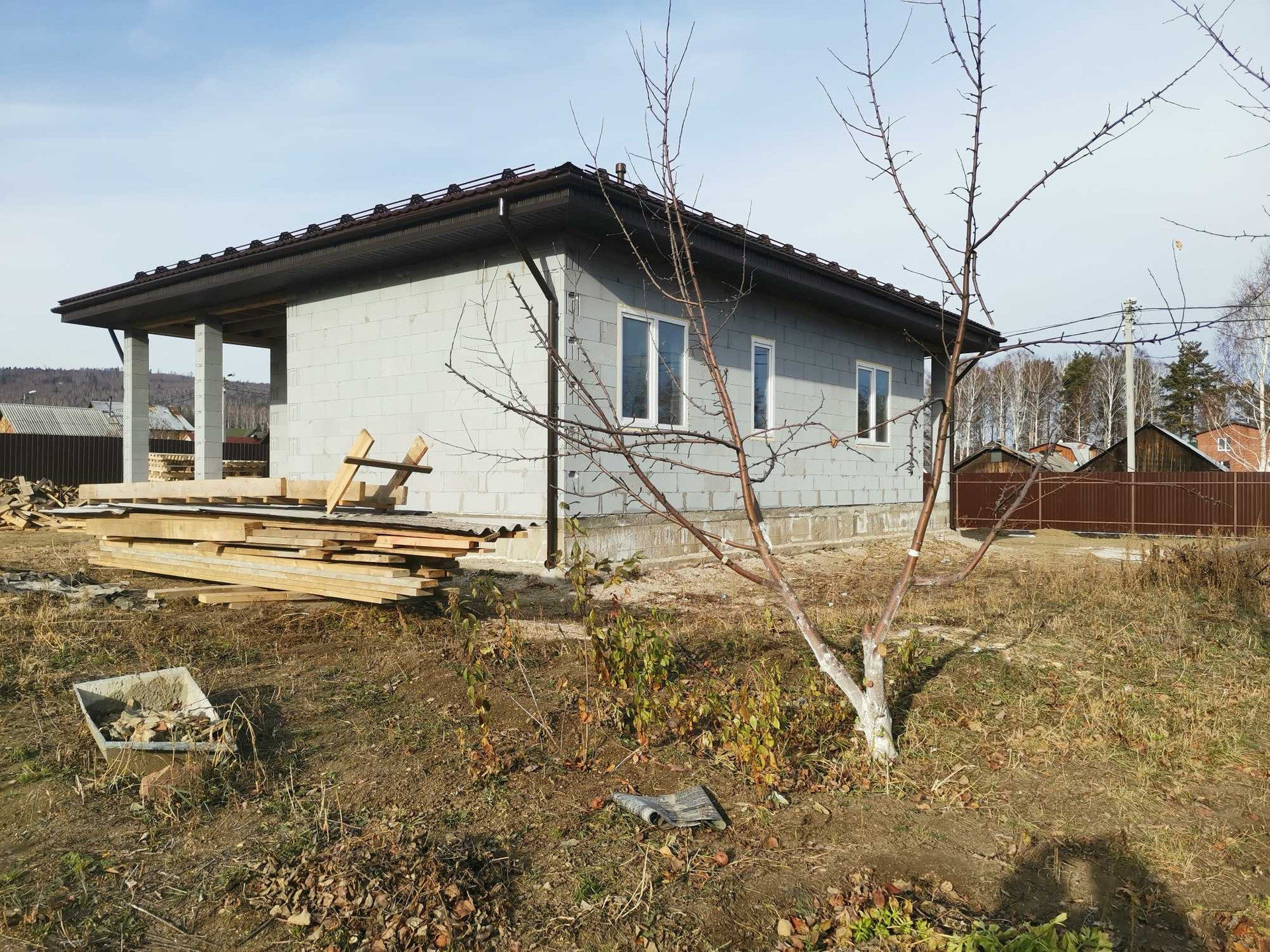 Дом (без отделки, есть эскизный проект): фундамент свайно-ленточный с плитой; кровля: четырехскатная металочерепица (цвет шоколад); вода заведена в дом; две комнаты 15 и 12м, гостиная 23м, кухня 13.0м, ванна 7,5м,  котельная с окном 6,0 (в 2023 - 2024 на улице планируется подведение газа). Скважина. Септик. На участке плодовые деревья и оцинкованная теплица 3*6. Подсобное помещение.