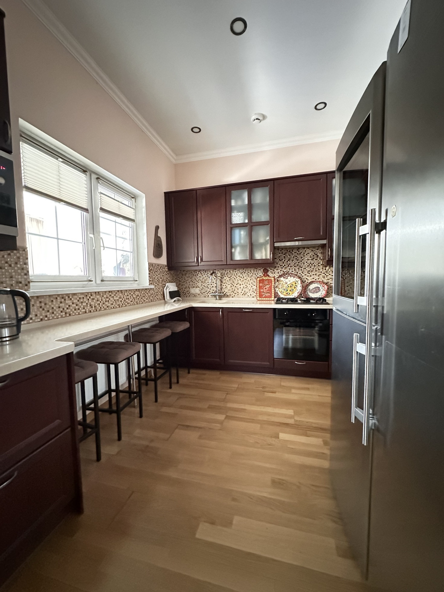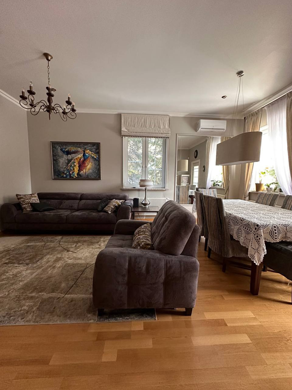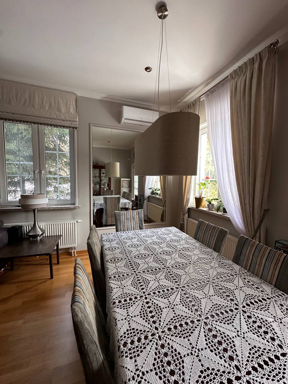 Вашему вниманию предлагается Таунхаус (Дуплекс) площадью 135 кв.м  с участком 5,3 соток полностью готовый к заселению. 1 этаж: гостинная, кухня, прихожая, гостевая комната, терраса, бойлерная и кладовая. 2 этаж: спальня с гардеробной, ванная с сауной и две комнаты. В каждой комнате установлен кондиционер, в спальне на 2м этаже и гостевой комнате на 1м этаже установлены рекуператоры воздуха. БОльшая часть мебели и встраиваемая техника остаются (посудомоечная машина Mielle, микроволновая печь Bosch и духовой шкаф с варочной панелью Ariston). Терраса и главное крыльцо выложены гранитом, на террасе установлены электрожалюзи для всесезонного использования. Материал стен: каркасник обложенный кирпичом.  На участке с проработанным ландшафтном дизайном расположено большое количество хвойных растений (более 10 больших красивейших елей, живая изгородь из туй итд) а также: декоративный кустарник, клён, клумбы с цветами и др.растения.