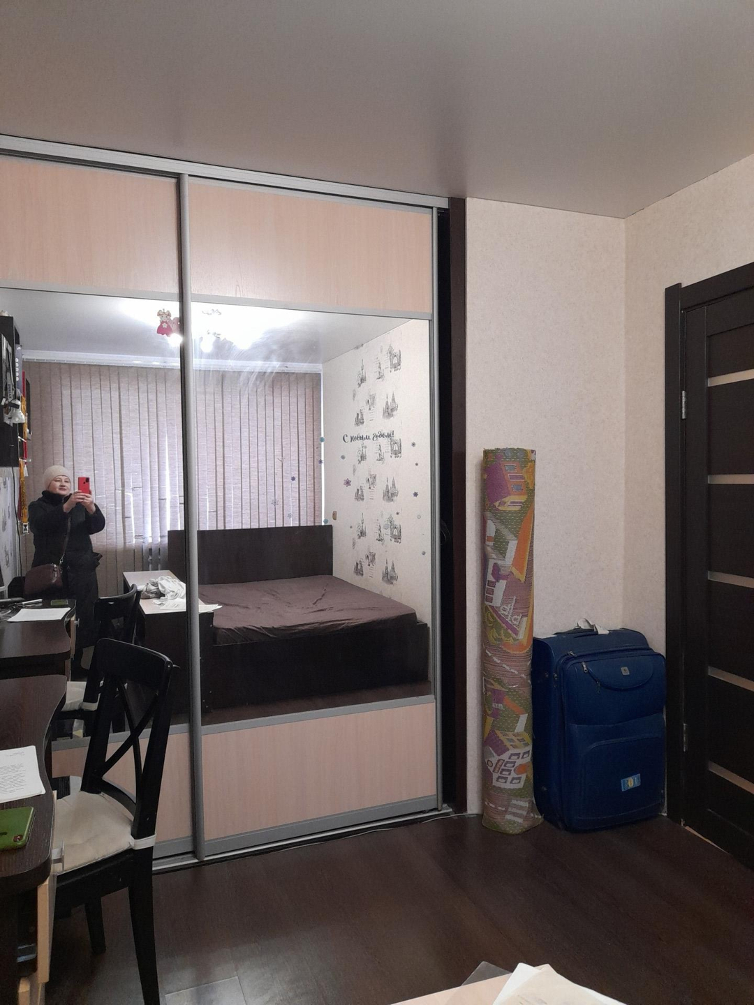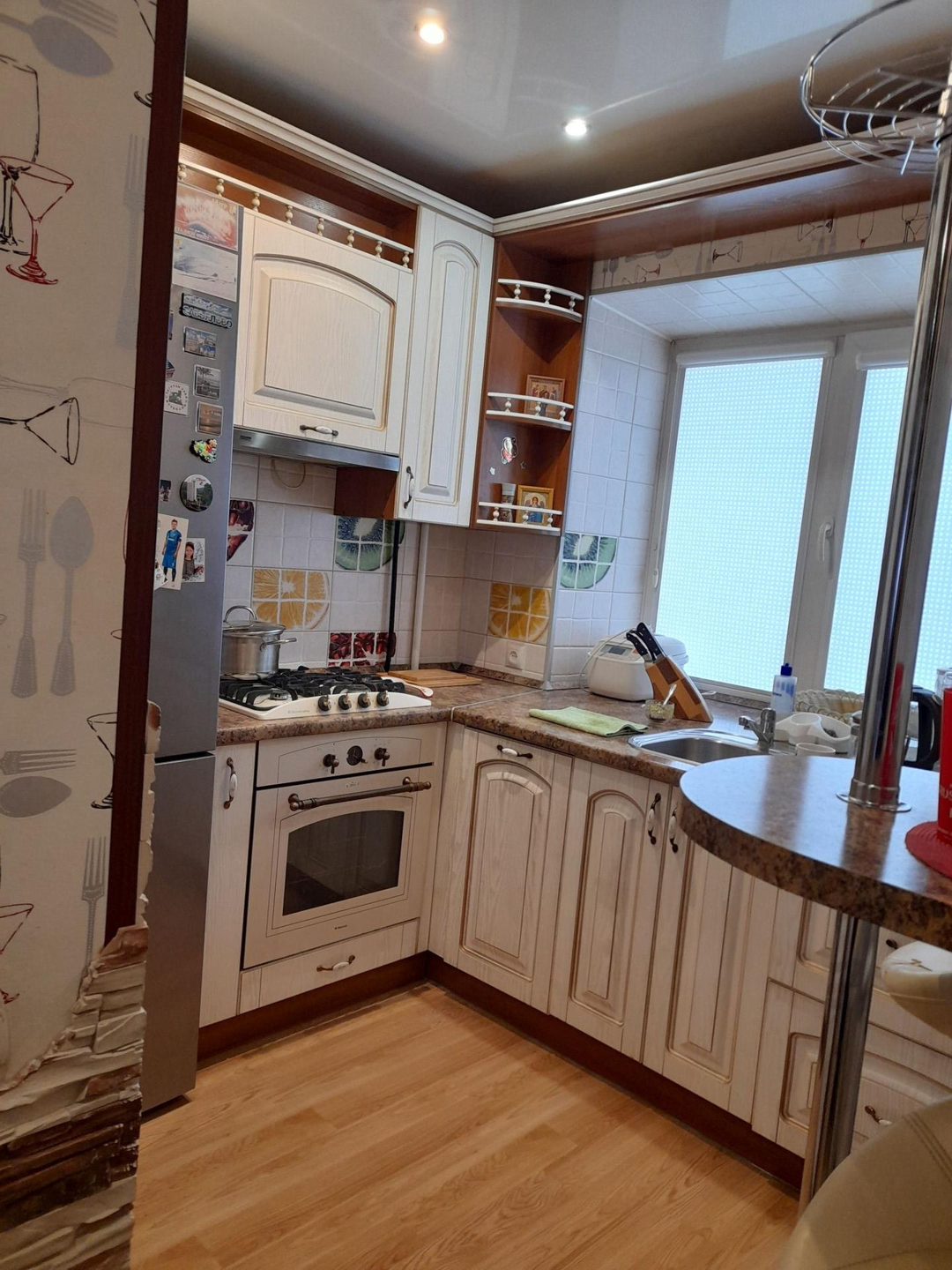 Остаётся встроенная мебель: кухонный гарнитур в классическом стиле, встроенный гардеробный шкаф.
