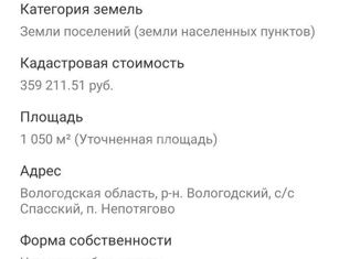 Продается земельный участок 6 соток в п Непотягово, в 8 км от г Вологды, по новой асфальтовой дороге, межевание проведено, назначение ЛПХ , кадастровый номер 35:25:0705040:447 |