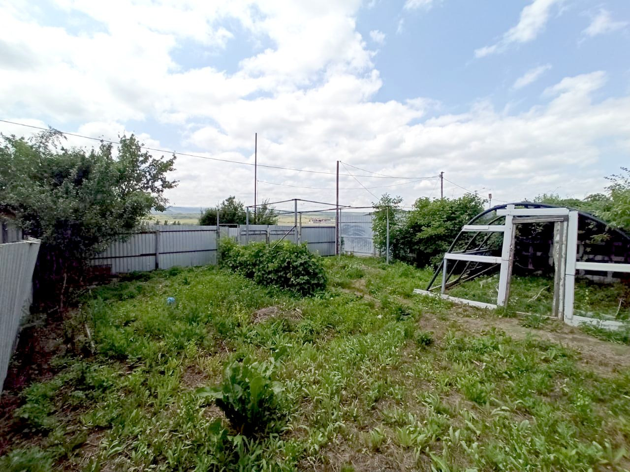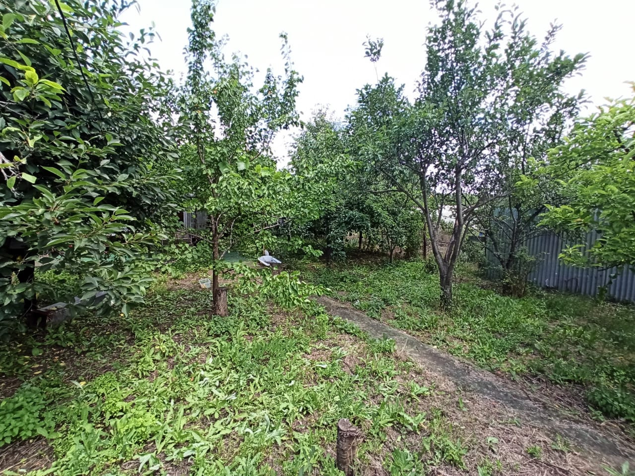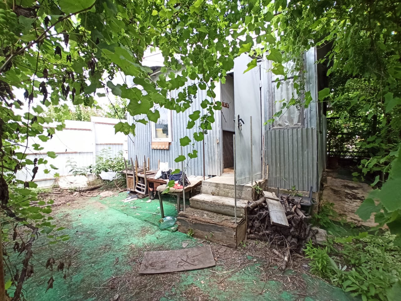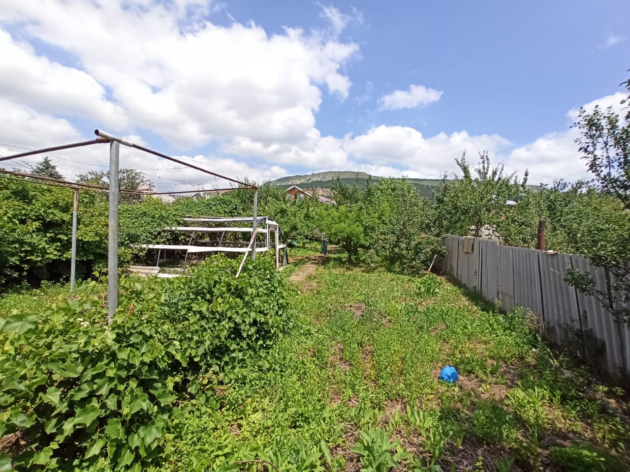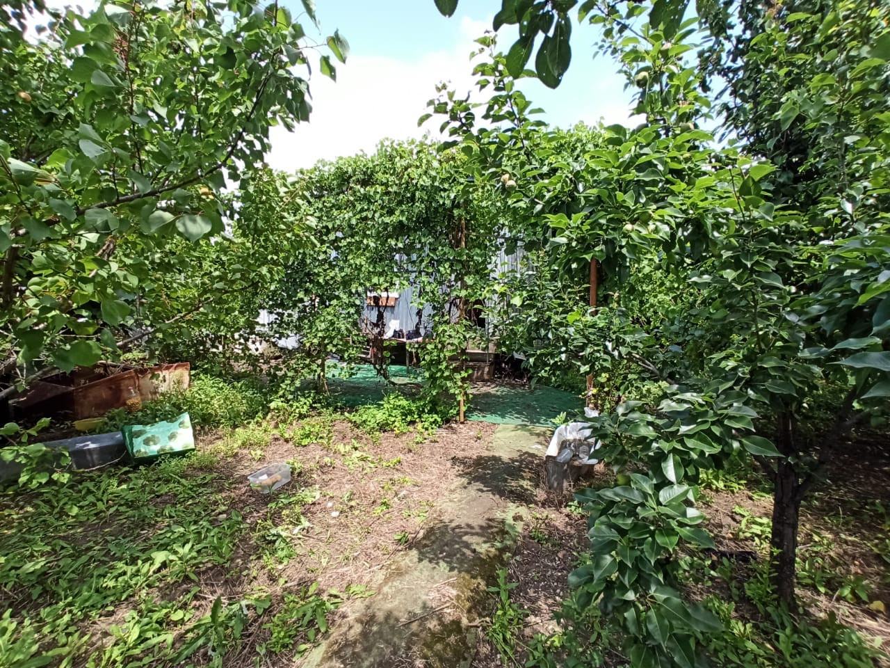 На участке не большой садовый домик. Много фруктовых деревьев, виноград.