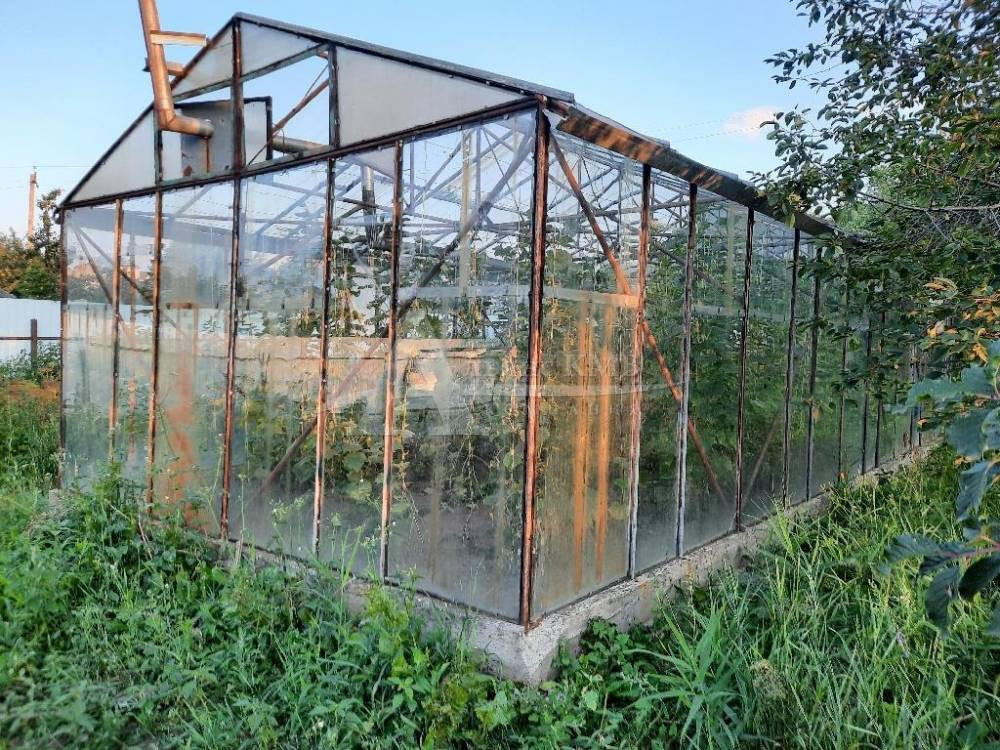 Стоит теплица, плодоносящие деревья.