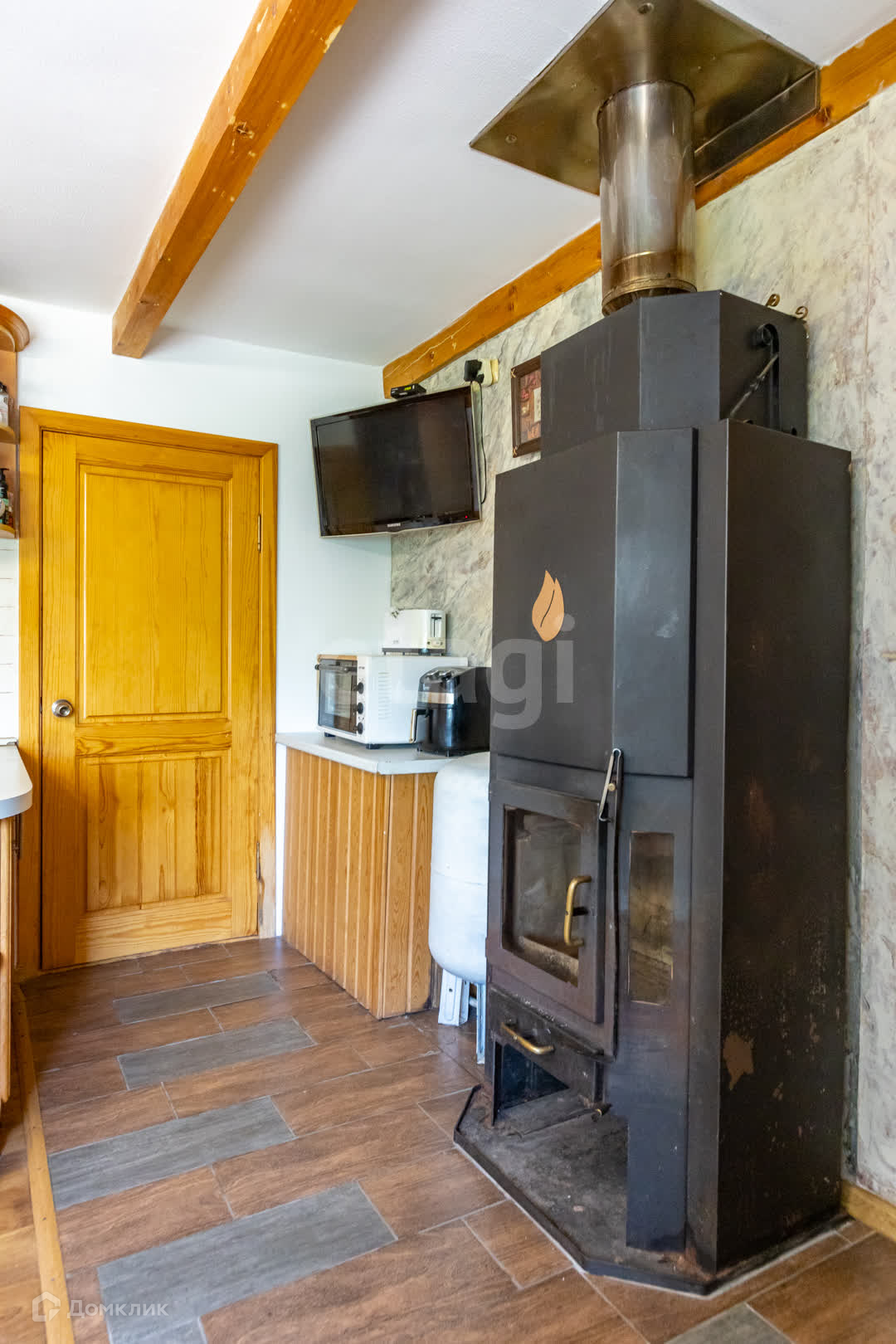 Отопление электрокотел. В межсезонье дровяной камин. Горячая вода - бойлер на 80 литров. Кондиционер, 3 встроенных шкафа-купе, встроенная кухня. Лестница и межкомнатные двери из кедра.