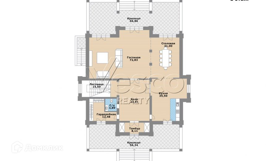1 этаж: прихожая, гардероб, холл, кухня-столовая-каминный зал с выходом на террасу, с/у