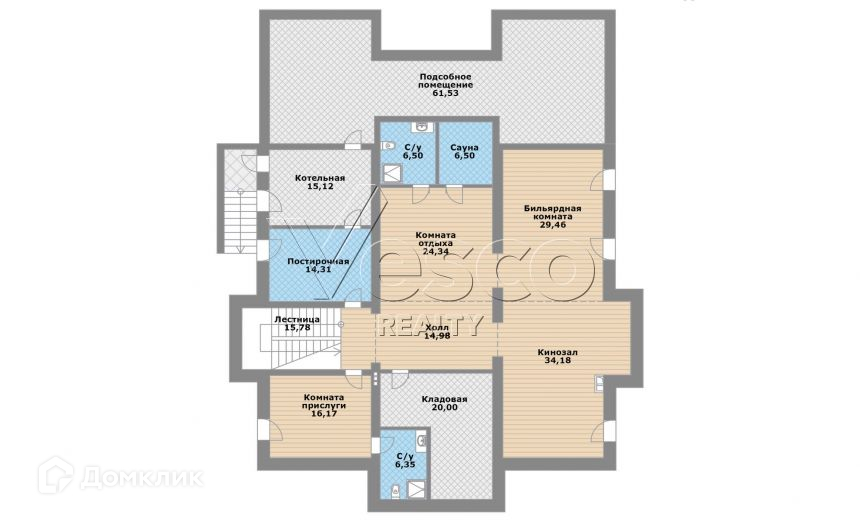 Цоколь: комната отдыха с сауной душевой, 2 с/у, кладовая, 3 помещения свободного назначения, котельная