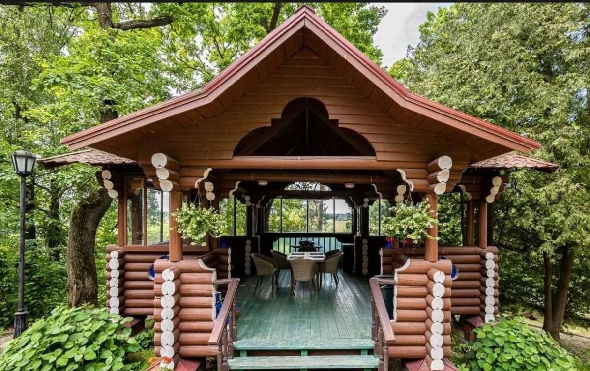 На территории есть настоящая русская баня, роскошная беседка, бункер, вековые сосны и ели.