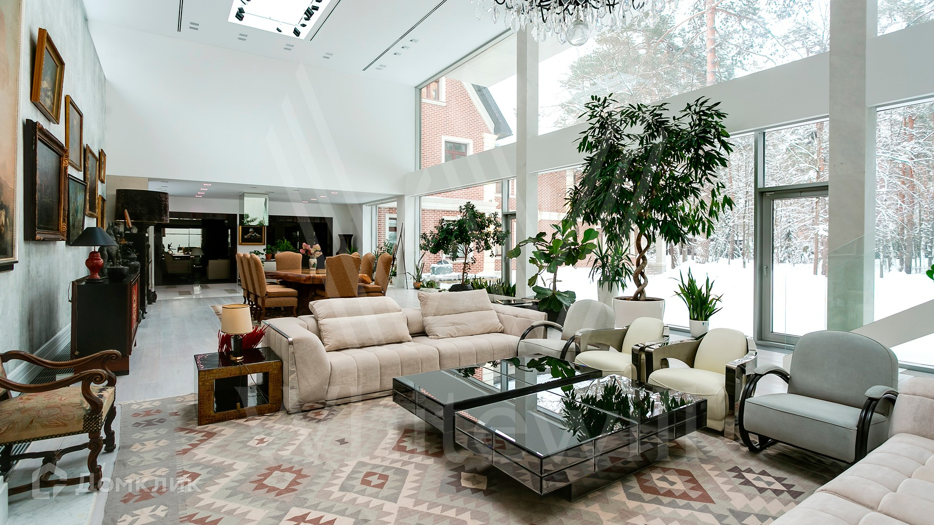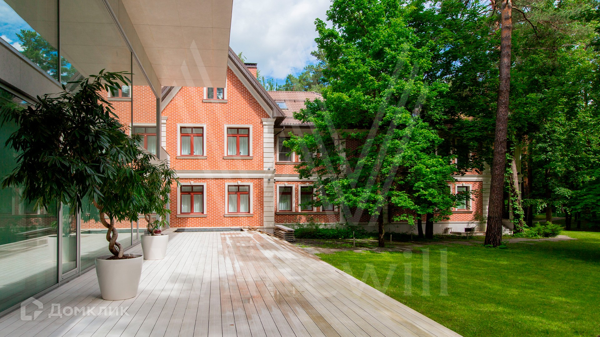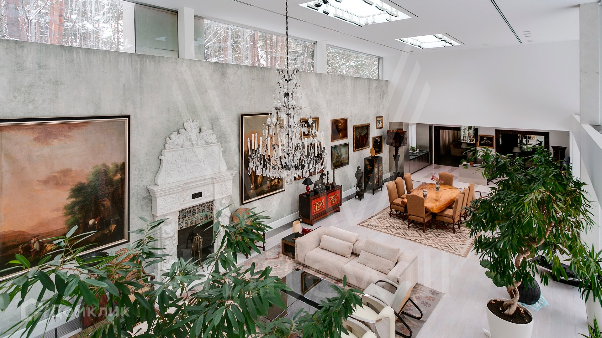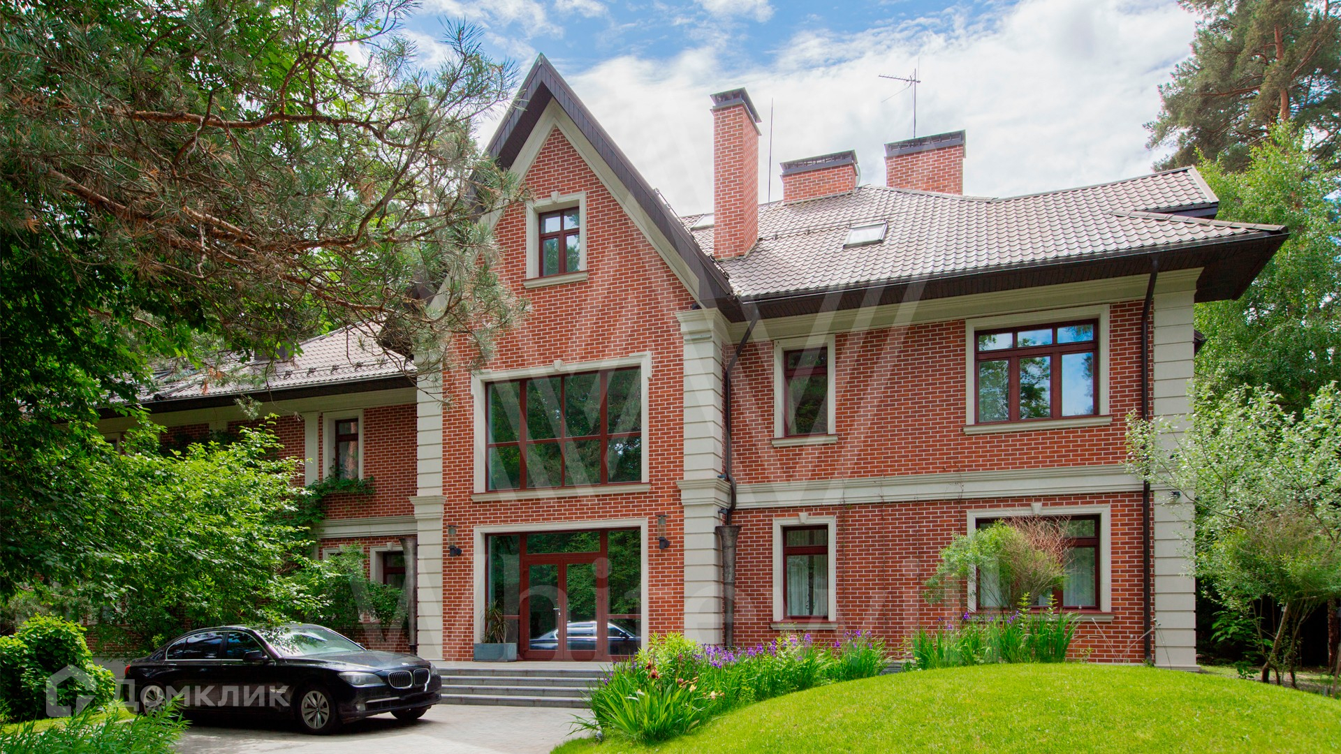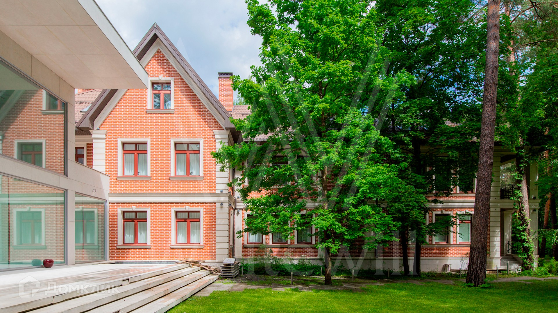ID 9 952. Николина гора. Просторная загородная резиденция площадью 1100 м² построена на участке 50 соток в окружении сосен. К фасаду основного здания, выполненного в английском стиле из красного клинкерного кирпича, примыкает современная постройка из стекла и бетона. Интерьер эклектичен под стать архитектуре дома — здесь сочетаются полы из мрамора и версальский паркет, дверные порталы в духе арт-деко, мебель 13 века и винтаж 60-х годов. Высота потолков достигает 7 метров. В особняке спланировали 6 спален, единое пространство из гостиной с камином, столовой и кухни, кабинет, зону отдыха с сауной и хамамом, холл со вторым светом, передающий атмосферу старых парижских домов. На территории предусмотрен небольшой дом для персонала. На участке выполнен ландшафтный дизайн, выложены дорожки.