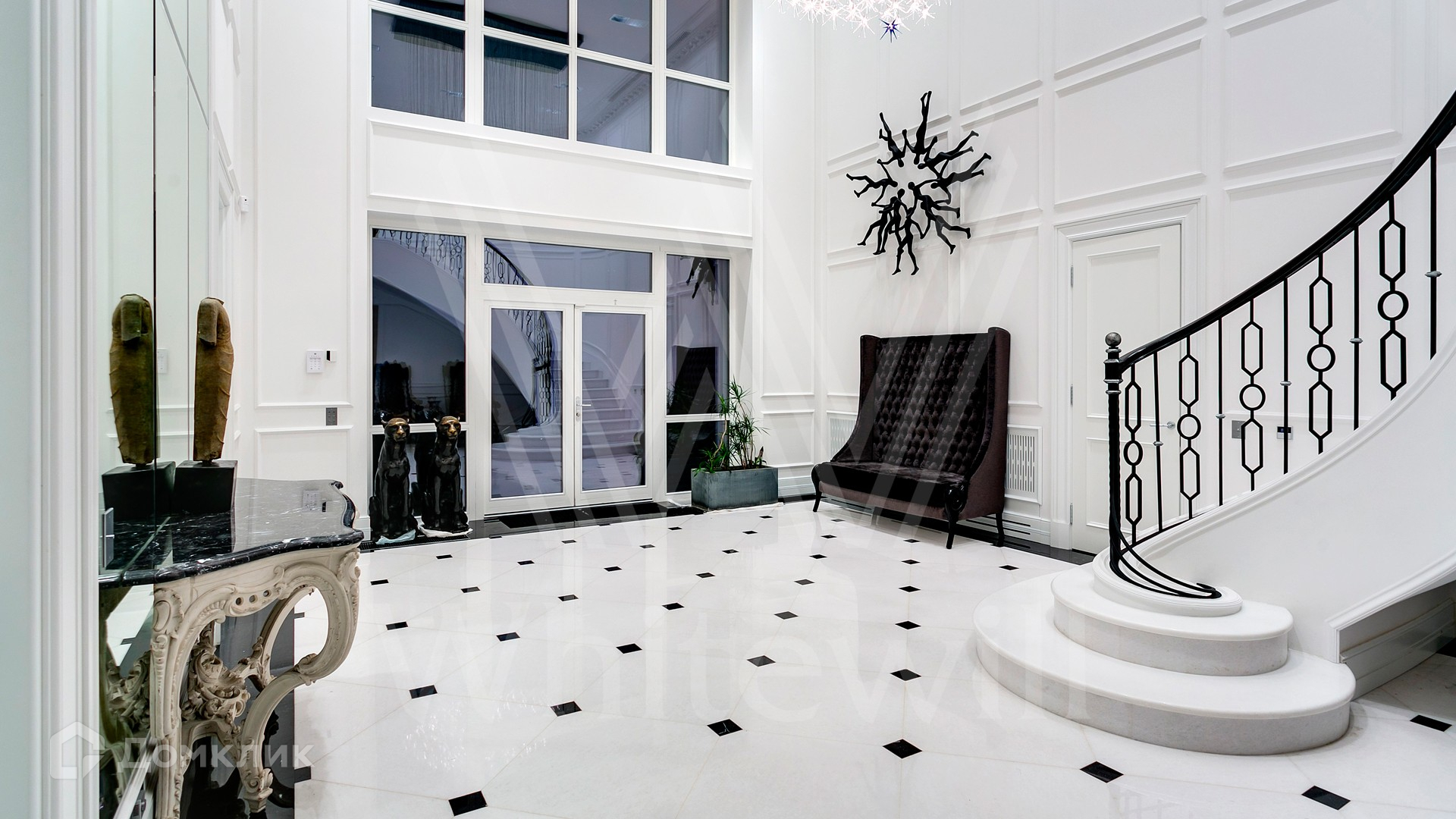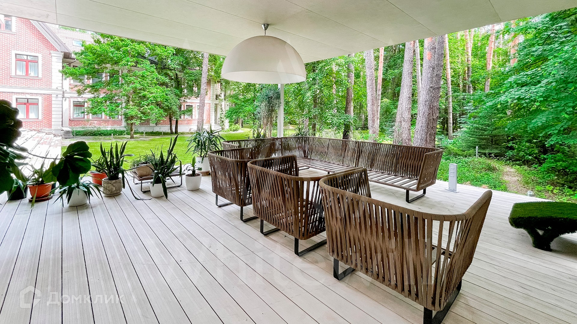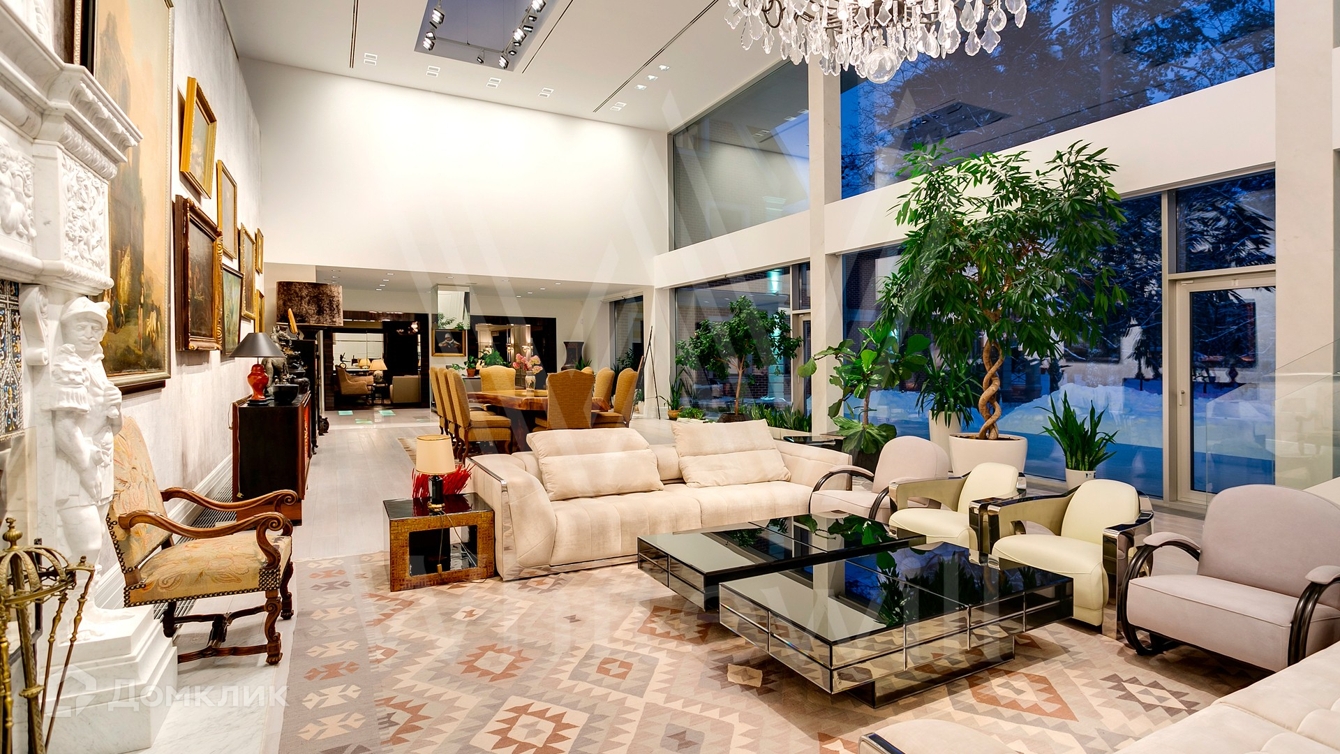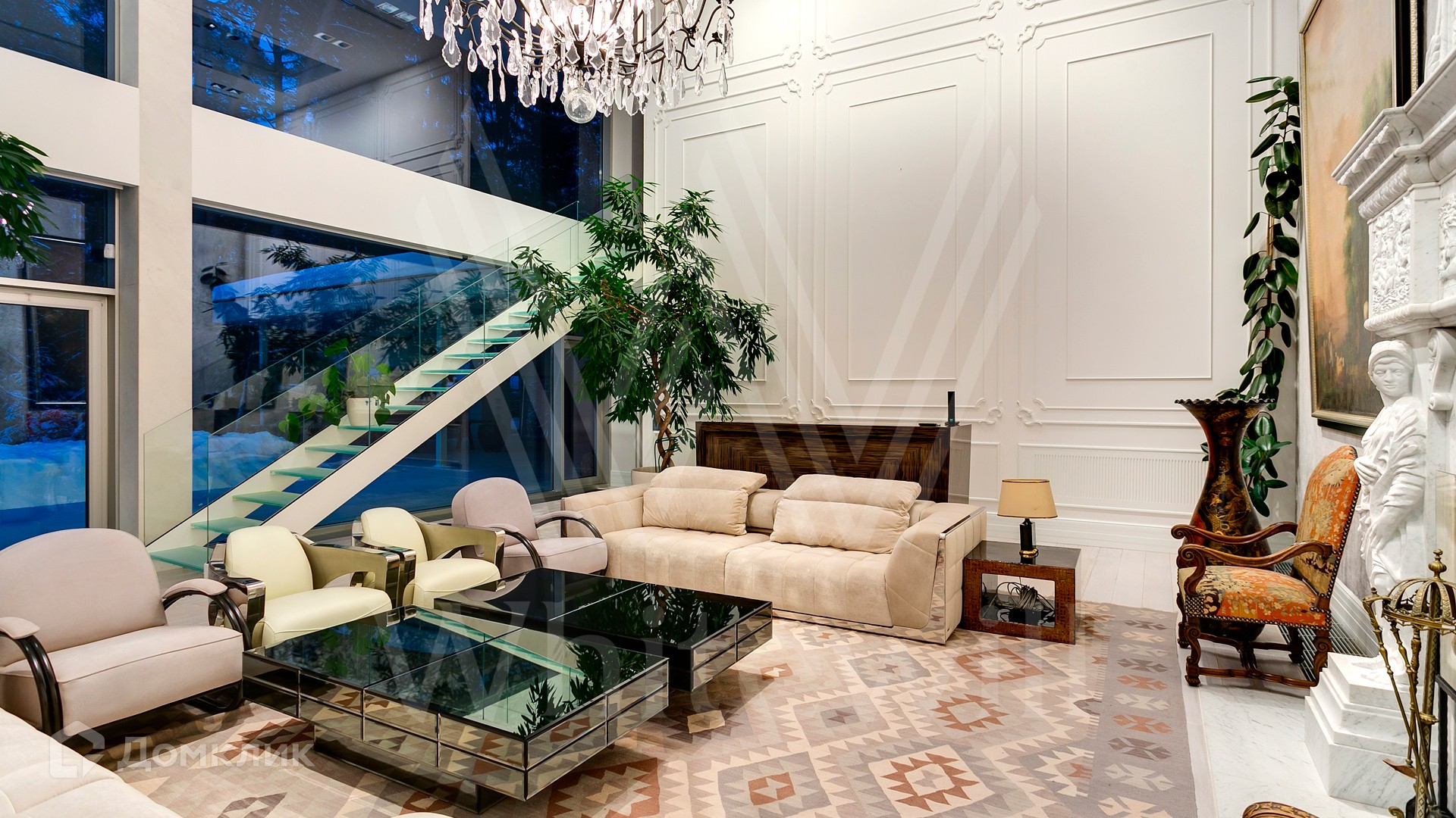 ID 9 952. Николина гора. Просторная загородная резиденция площадью 1100 м² построена на участке 50 соток в окружении сосен. К фасаду основного здания, выполненного в английском стиле из красного клинкерного кирпича, примыкает современная постройка из стекла и бетона. Интерьер эклектичен под стать архитектуре дома — здесь сочетаются полы из мрамора и версальский паркет, дверные порталы в духе арт-деко, мебель 13 века и винтаж 60-х годов. Высота потолков достигает 7 метров. В особняке спланировали 6 спален, единое пространство из гостиной с камином, столовой и кухни, кабинет, зону отдыха с сауной и хамамом, холл со вторым светом, передающий атмосферу старых парижских домов. На территории предусмотрен небольшой дом для персонала. На участке выполнен ландшафтный дизайн, выложены дорожки.
