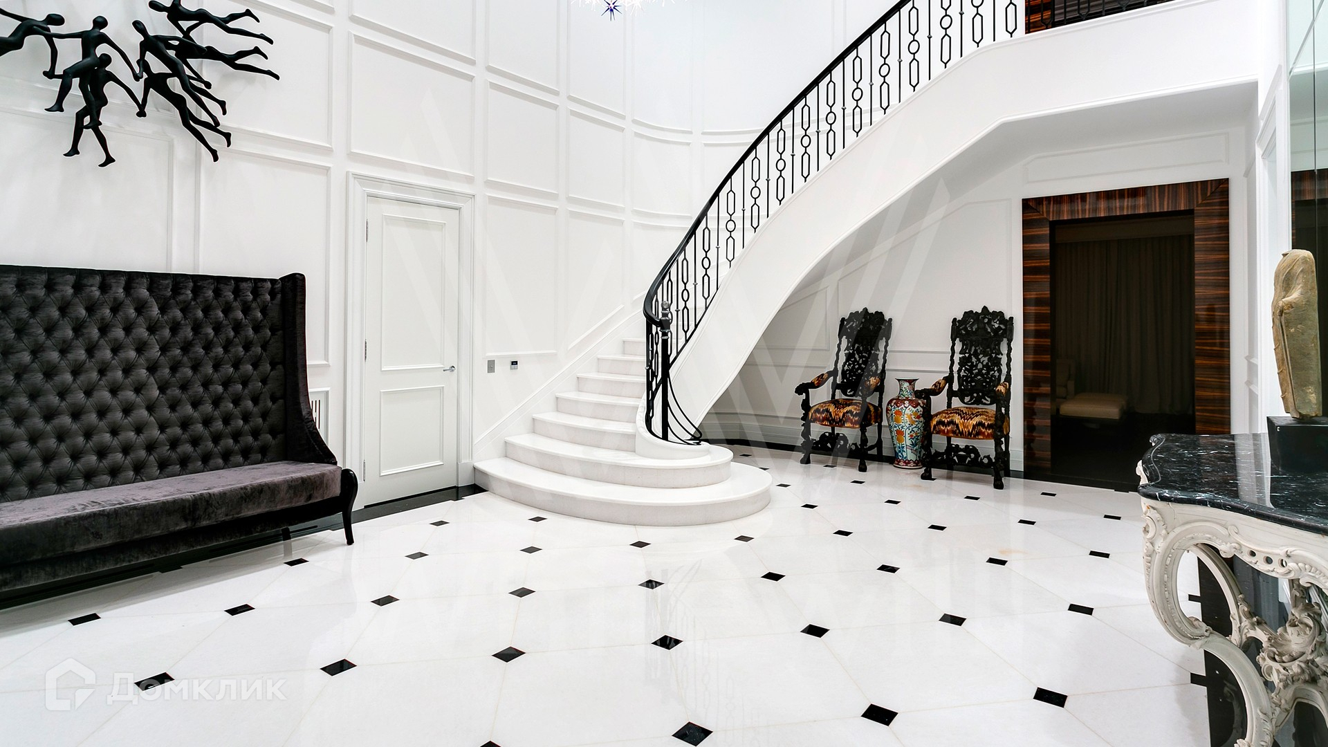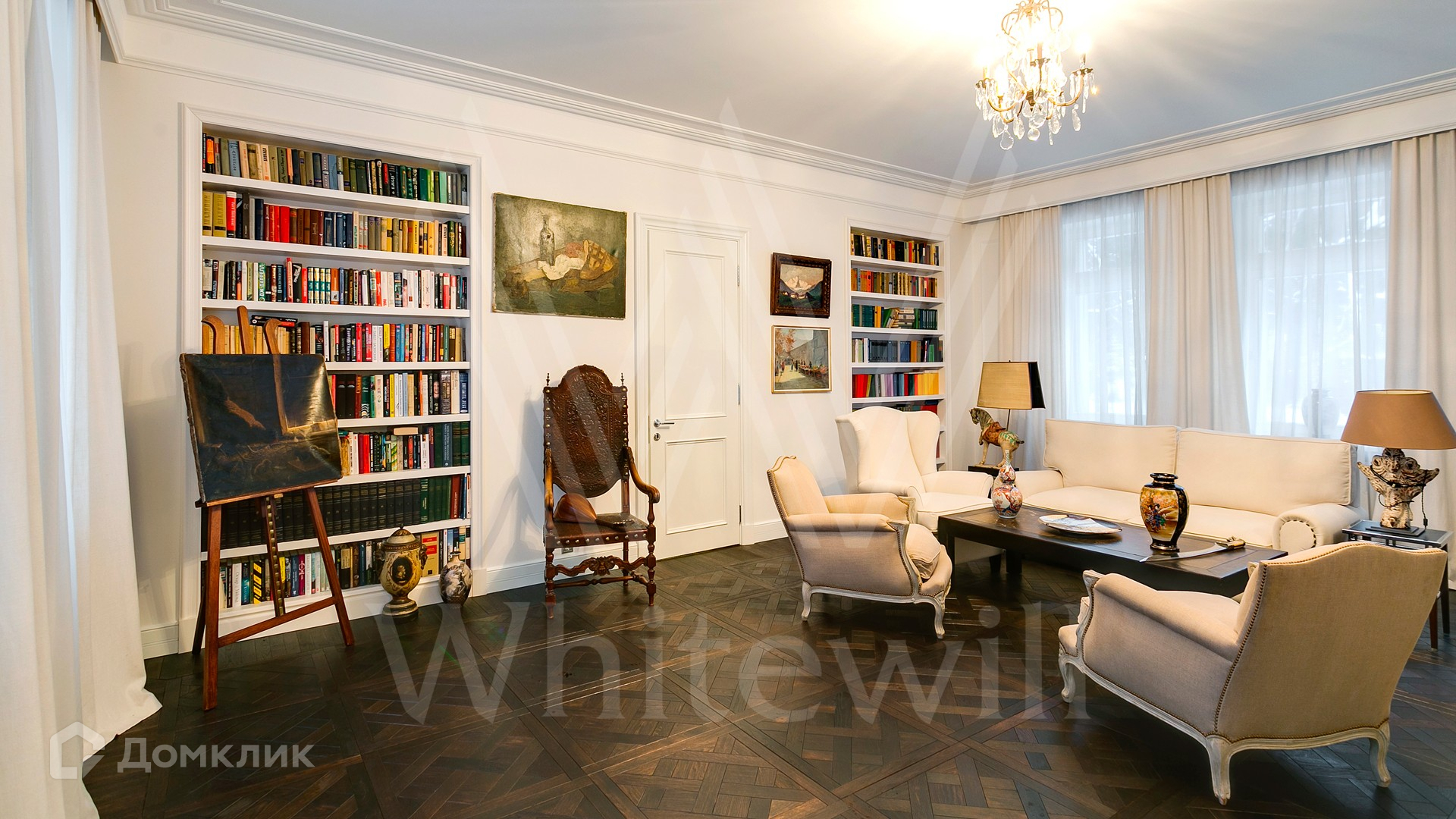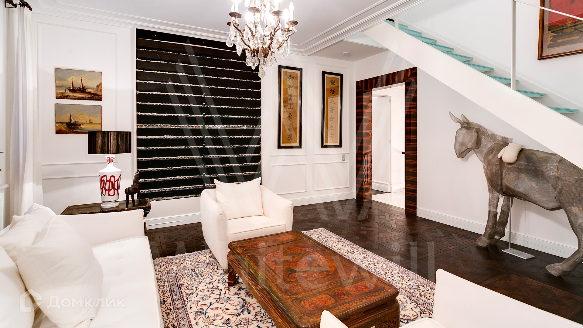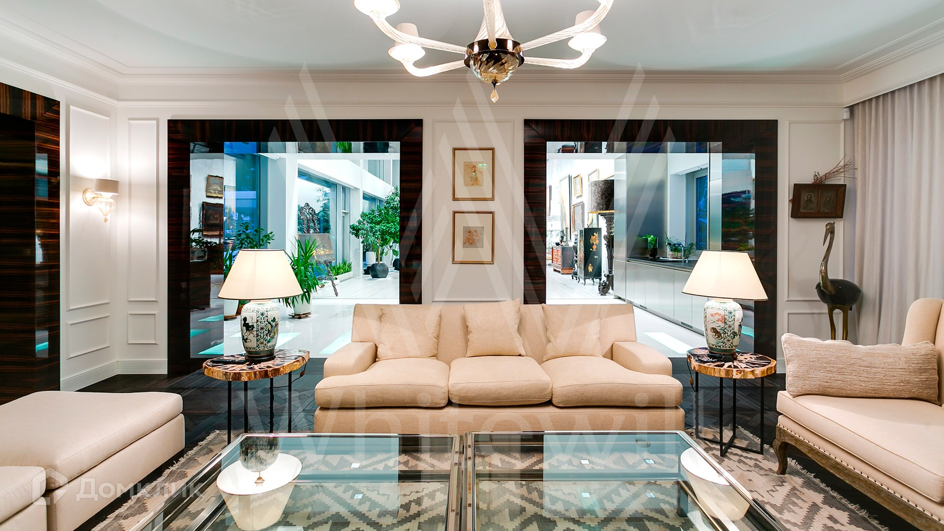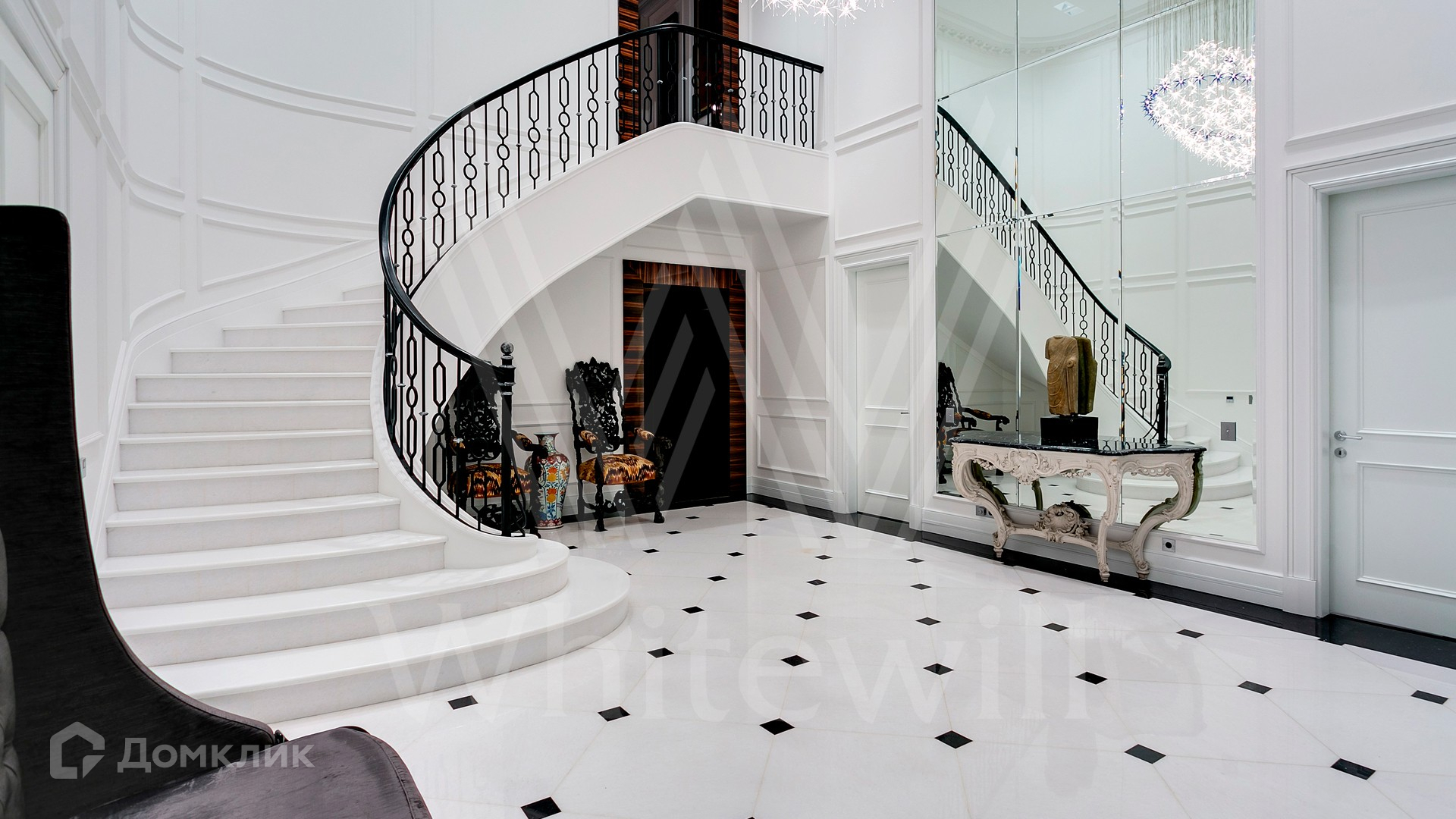 ID 9 952. Николина гора. Просторная загородная резиденция площадью 1100 м² построена на участке 50 соток в окружении сосен. К фасаду основного здания, выполненного в английском стиле из красного клинкерного кирпича, примыкает современная постройка из стекла и бетона. Интерьер эклектичен под стать архитектуре дома — здесь сочетаются полы из мрамора и версальский паркет, дверные порталы в духе арт-деко, мебель 13 века и винтаж 60-х годов. Высота потолков достигает 7 метров. В особняке спланировали 6 спален, единое пространство из гостиной с камином, столовой и кухни, кабинет, зону отдыха с сауной и хамамом, холл со вторым светом, передающий атмосферу старых парижских домов. На территории предусмотрен небольшой дом для персонала. На участке выполнен ландшафтный дизайн, выложены дорожки.