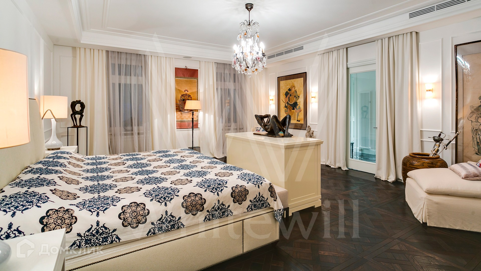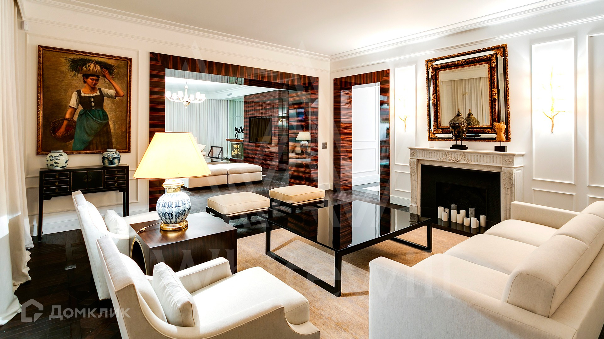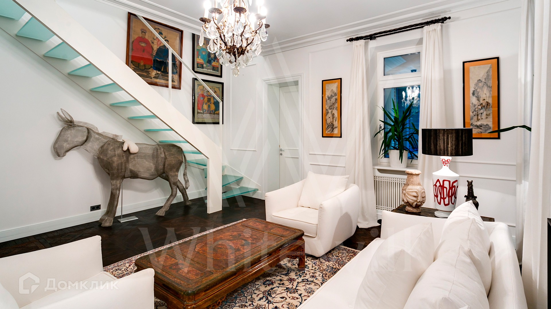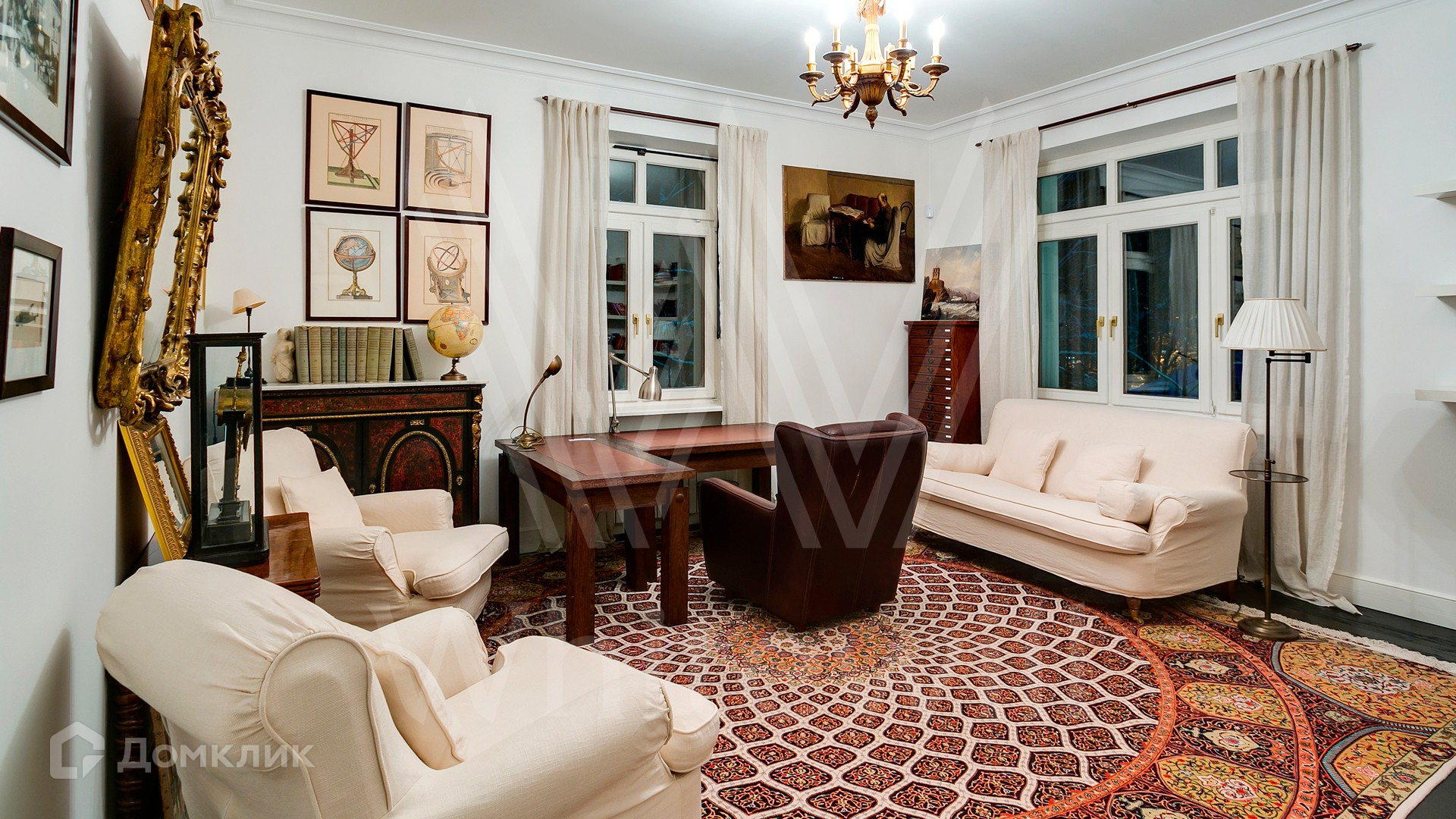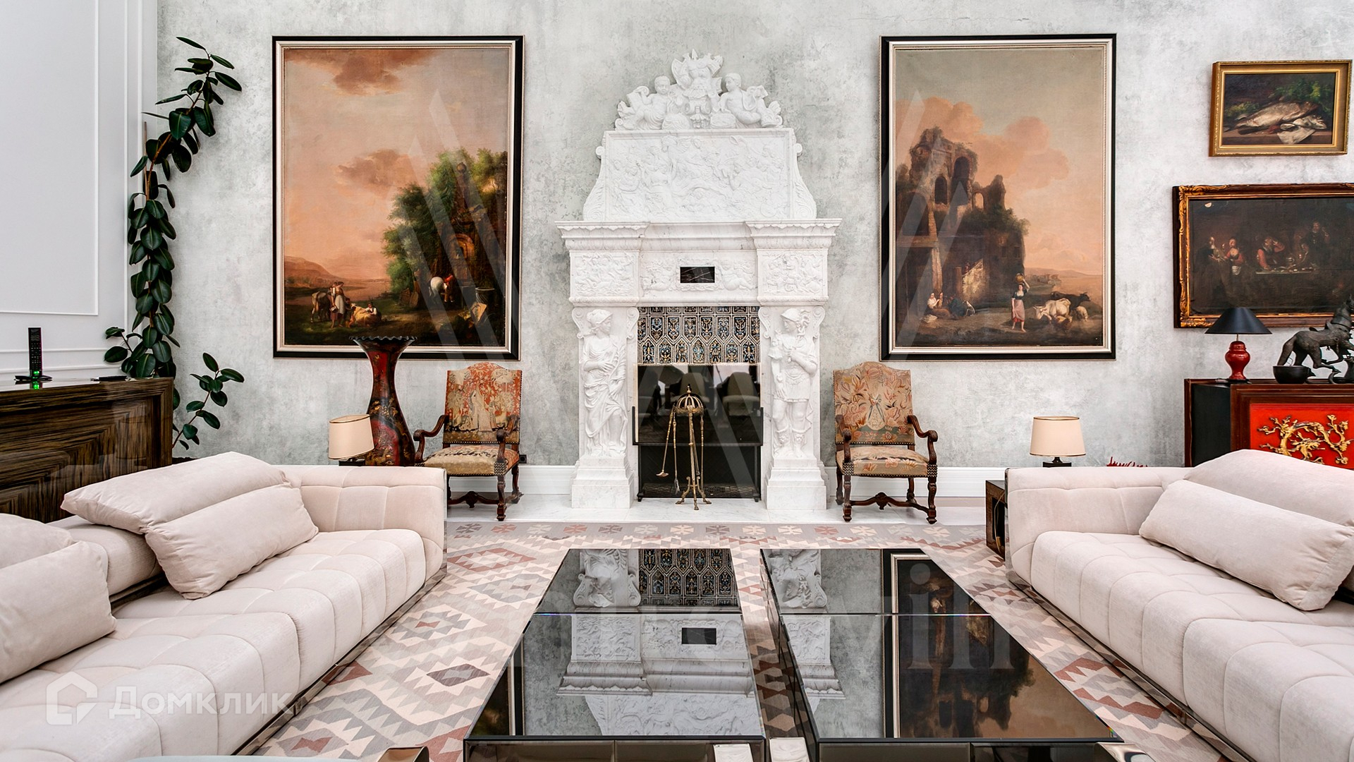 ID 9 952. Николина гора. Просторная загородная резиденция площадью 1100 м² построена на участке 50 соток в окружении сосен. К фасаду основного здания, выполненного в английском стиле из красного клинкерного кирпича, примыкает современная постройка из стекла и бетона. Интерьер эклектичен под стать архитектуре дома — здесь сочетаются полы из мрамора и версальский паркет, дверные порталы в духе арт-деко, мебель 13 века и винтаж 60-х годов. Высота потолков достигает 7 метров. В особняке спланировали 6 спален, единое пространство из гостиной с камином, столовой и кухни, кабинет, зону отдыха с сауной и хамамом, холл со вторым светом, передающий атмосферу старых парижских домов. На территории предусмотрен небольшой дом для персонала. На участке выполнен ландшафтный дизайн, выложены дорожки.