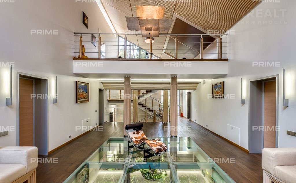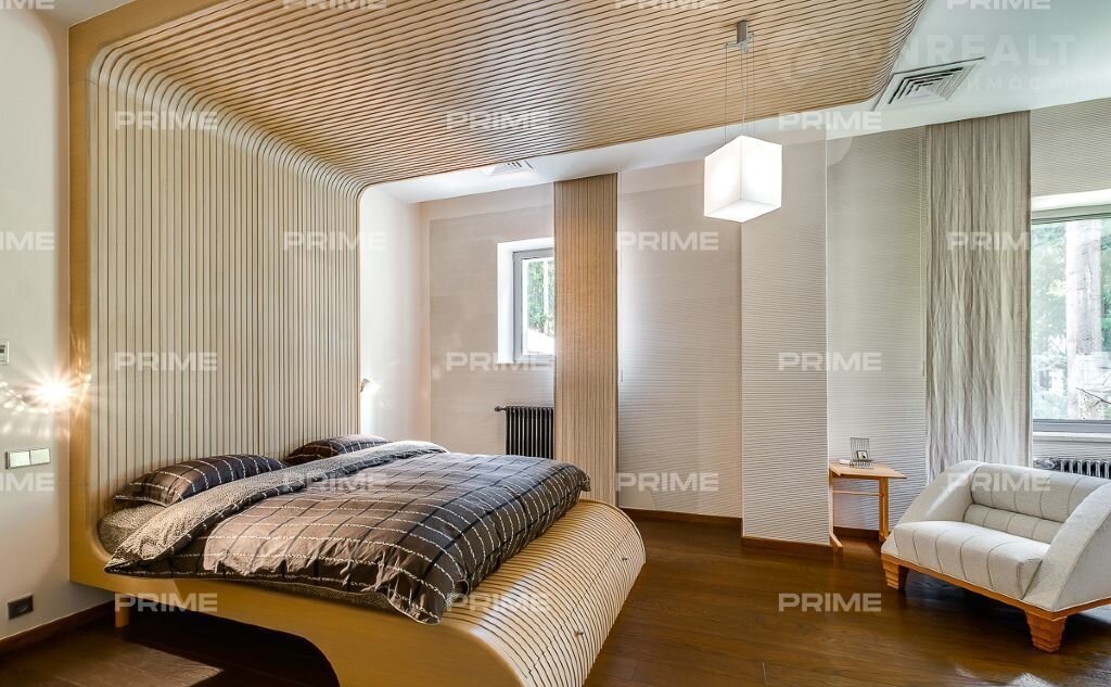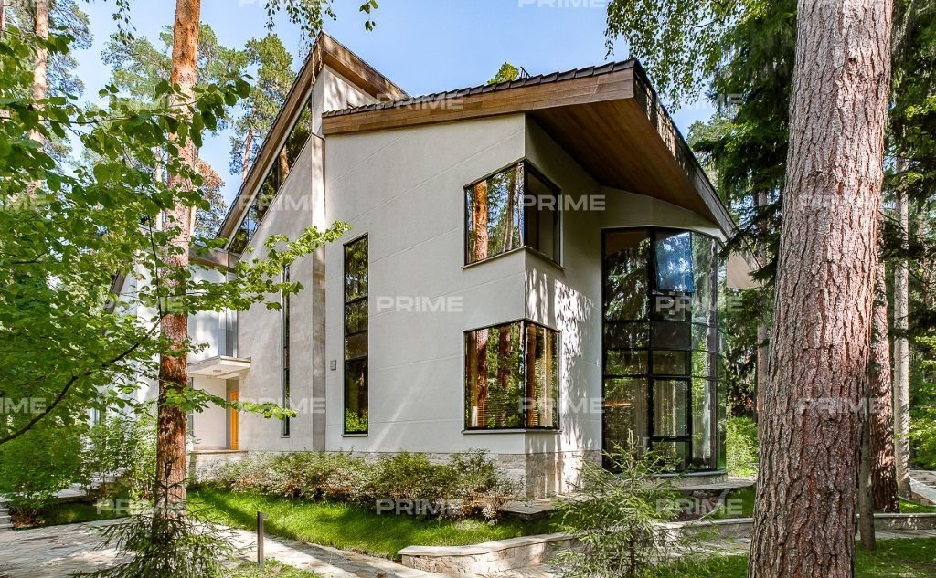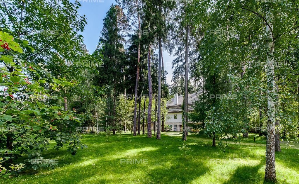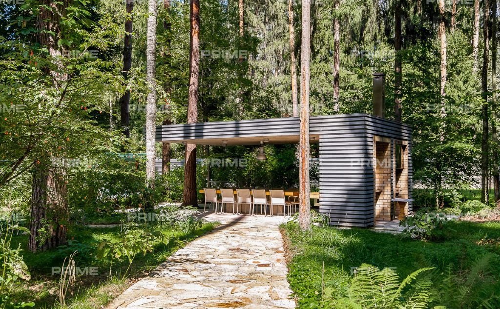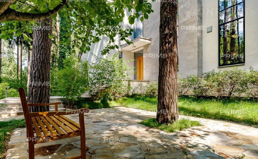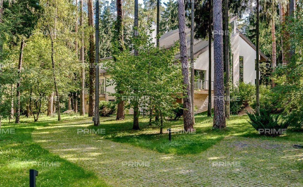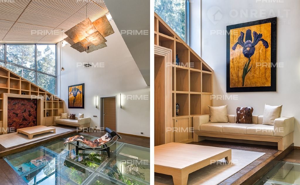 На территории участка выполнен ландшафтный дизайн с подсветкой, дорожками и системой полива. Интерьеры дома стремятся объединить внутреннее пространство и окружающий сосновый бор. Дом предлагается с дизайнерской отделкой "под ключ" и мебелью. В помещении 2 этажа, 3 спальни, гостиная с камином, аквазона с бассейном, сауной и зоной отдыха, зимний сад, а также квартира для персонала.