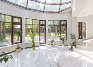 ID 9 952. Николина гора. Просторная загородная резиденция площадью 1100 м² построена на участке 50 соток в окружении сосен. К фасаду основного здания, выполненного в английском стиле из красного клинкерного кирпича, примыкает современная постройка из стекла и бетона. Интерьер эклектичен под стать архитектуре дома — здесь сочетаются полы из мрамора... |