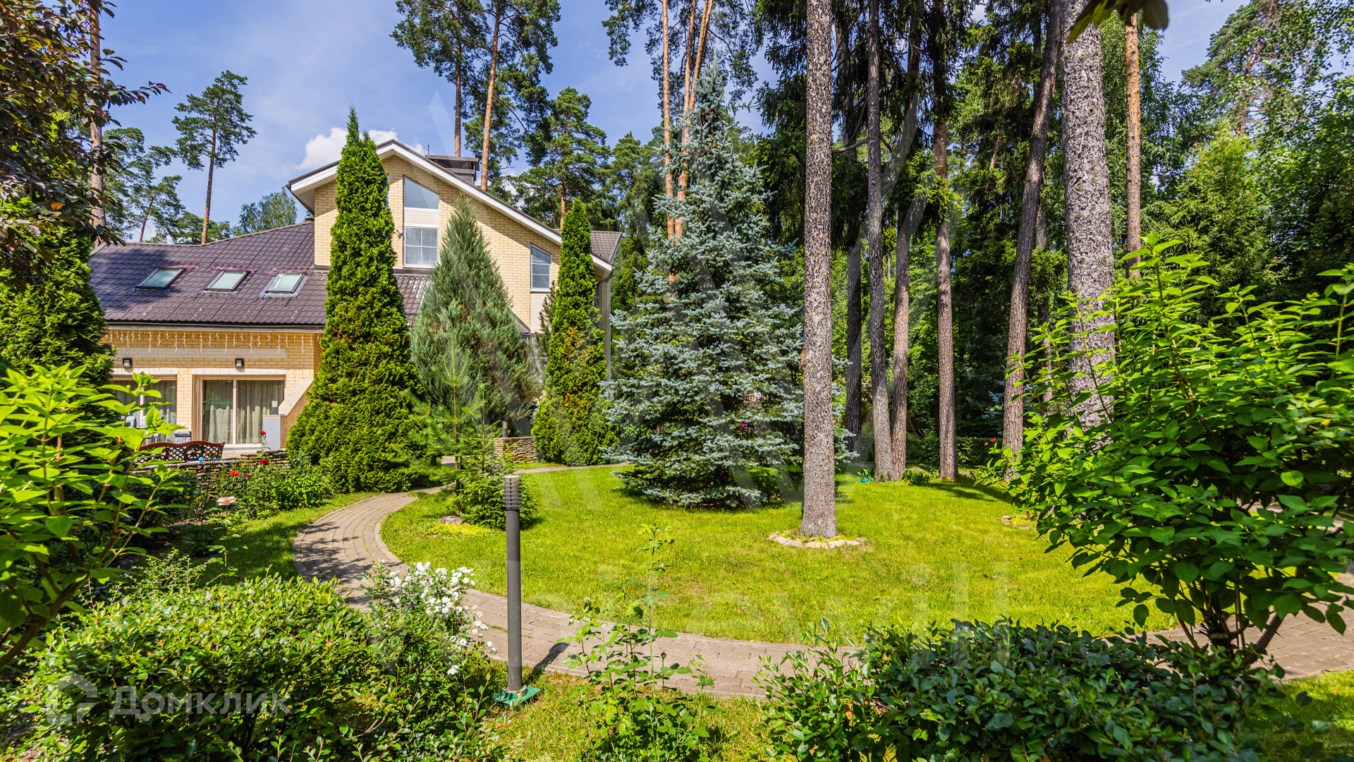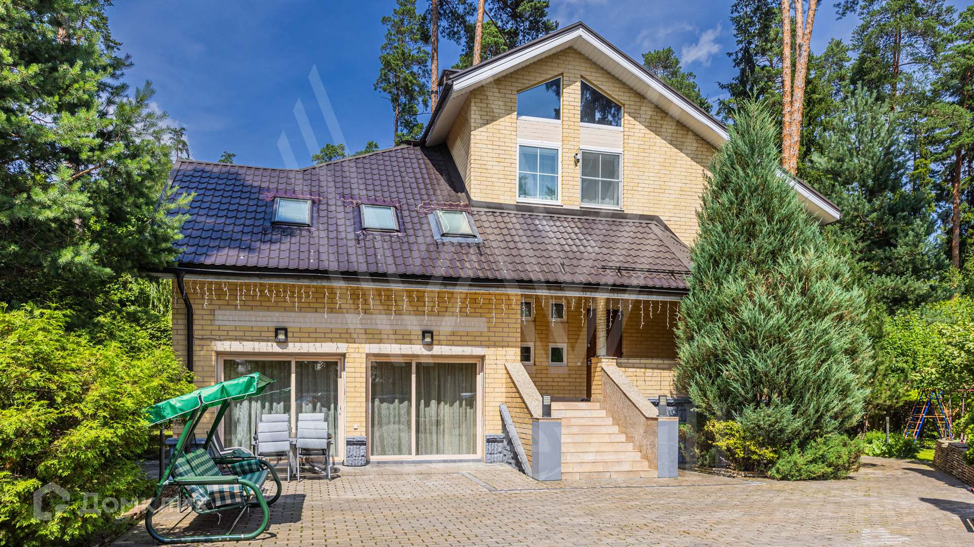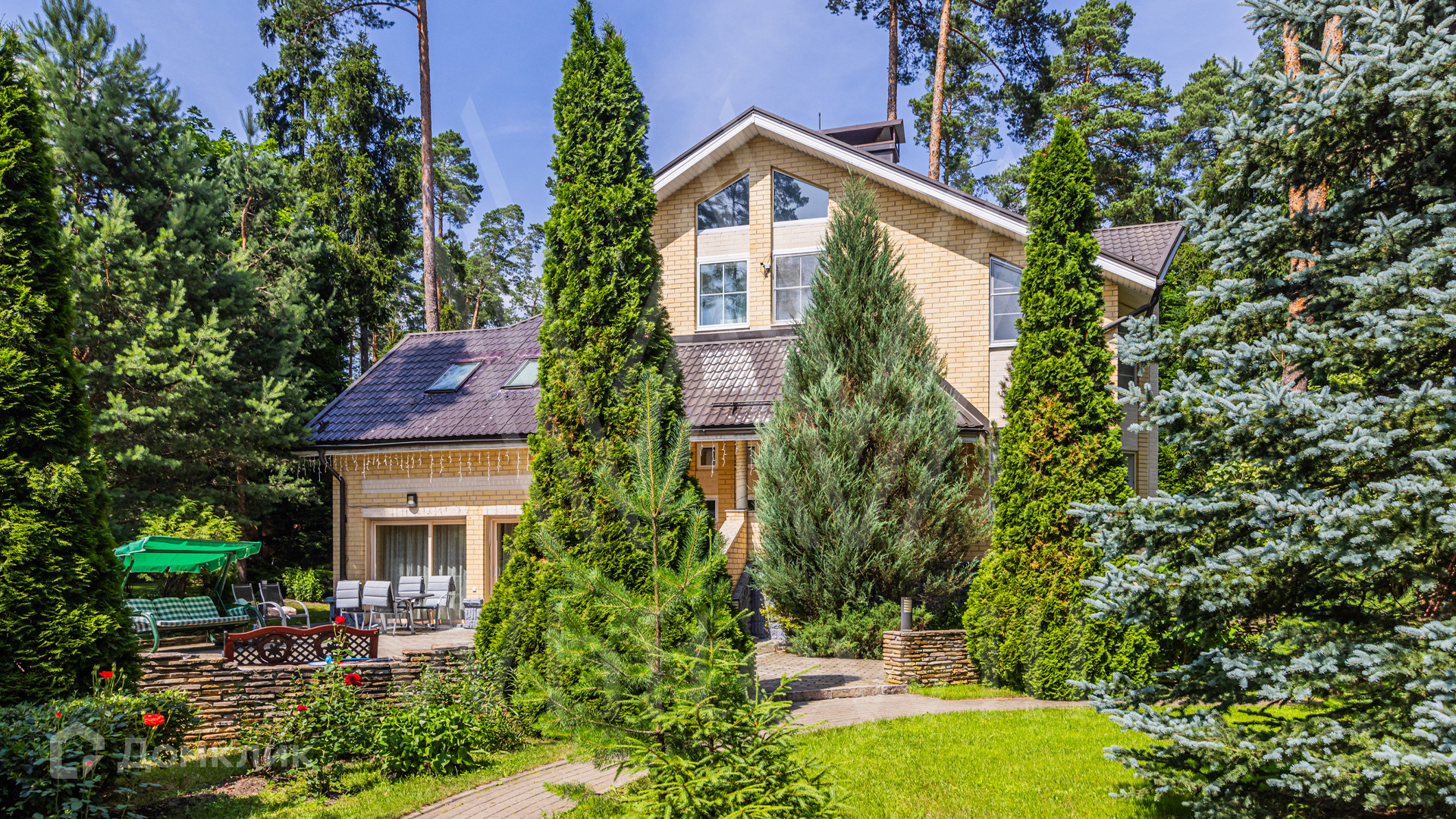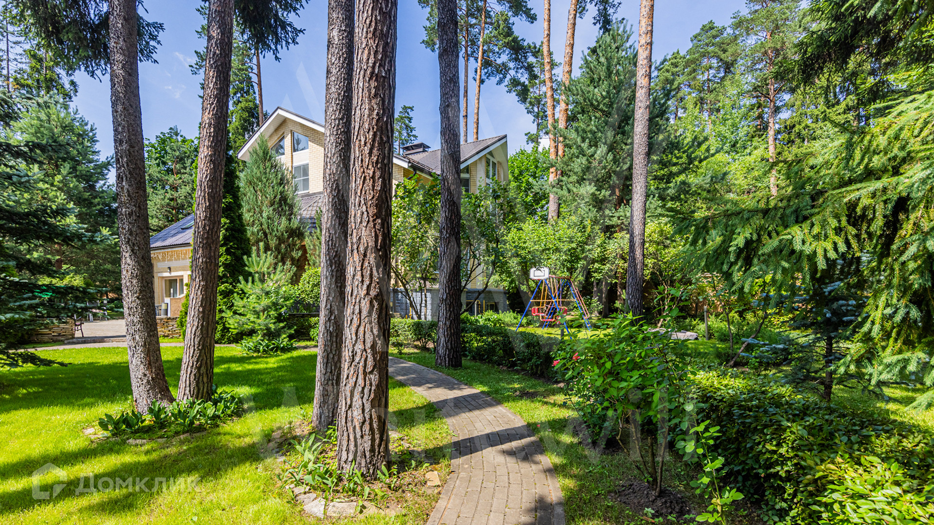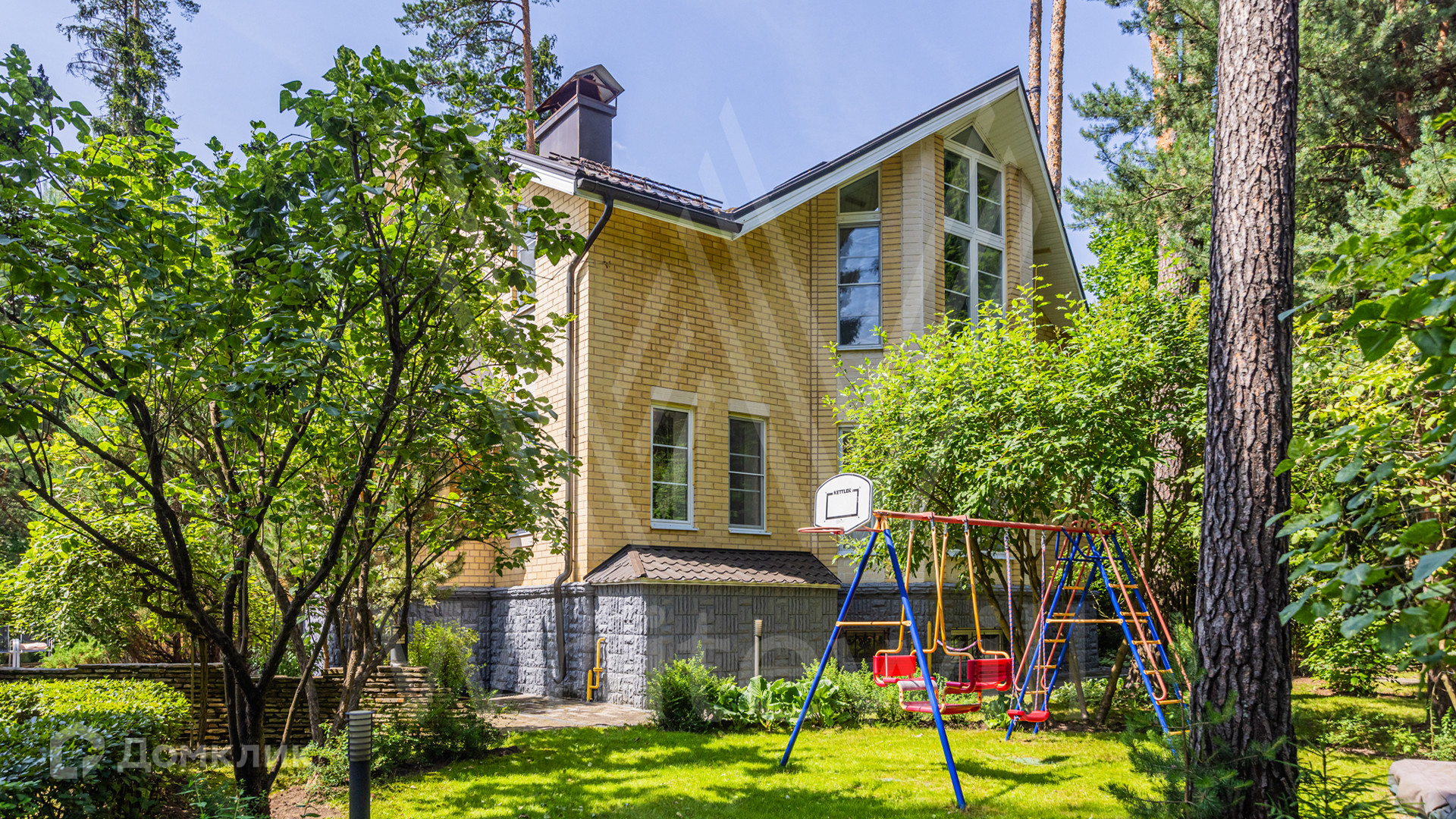 ID 12 349. Коттон Вэй (Никологорское). Загородный дом площадью 450 м² расположен на просторном участке 30 соток с многолетними соснами. Фасад здания облицован бежевым клинкерным кирпичом и декорирован молочными вставками. В отделке светлого интерьера преобладают теплые оттенки, создающие атмосферу уюта. Планировка резиденции включает 5 спален, гостиную с камином, кухню, игровую, кабинет, спортзал с балетной стойкой, кинозал, сауну, джакузи и комнату отдыха. Предусмотрен гараж на 2 машины. На участке выполнен ландшафтный дизайн, засеян газон, вымощены дорожки и обустроены беседка с зоной барбекю и детская площадка.