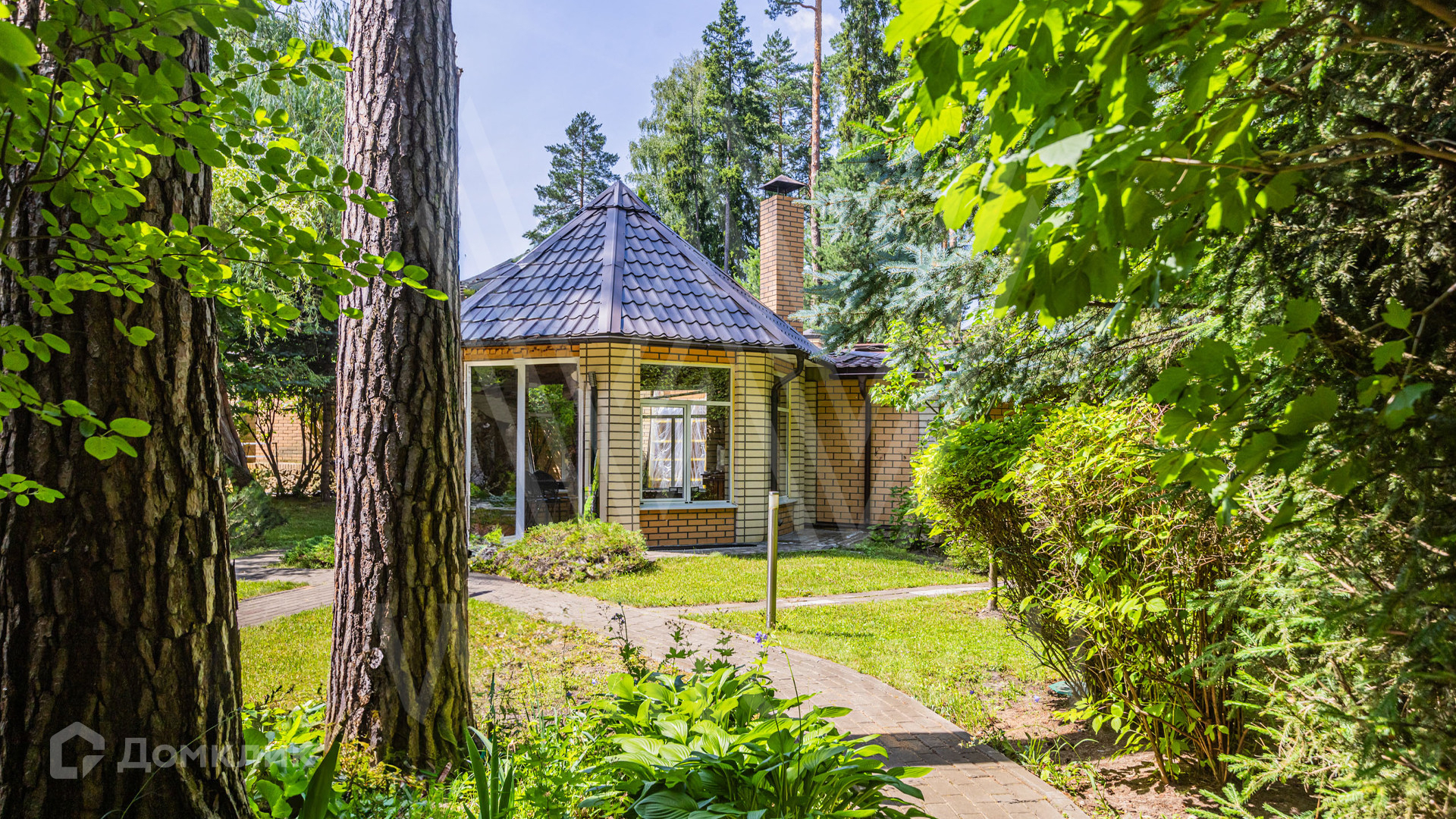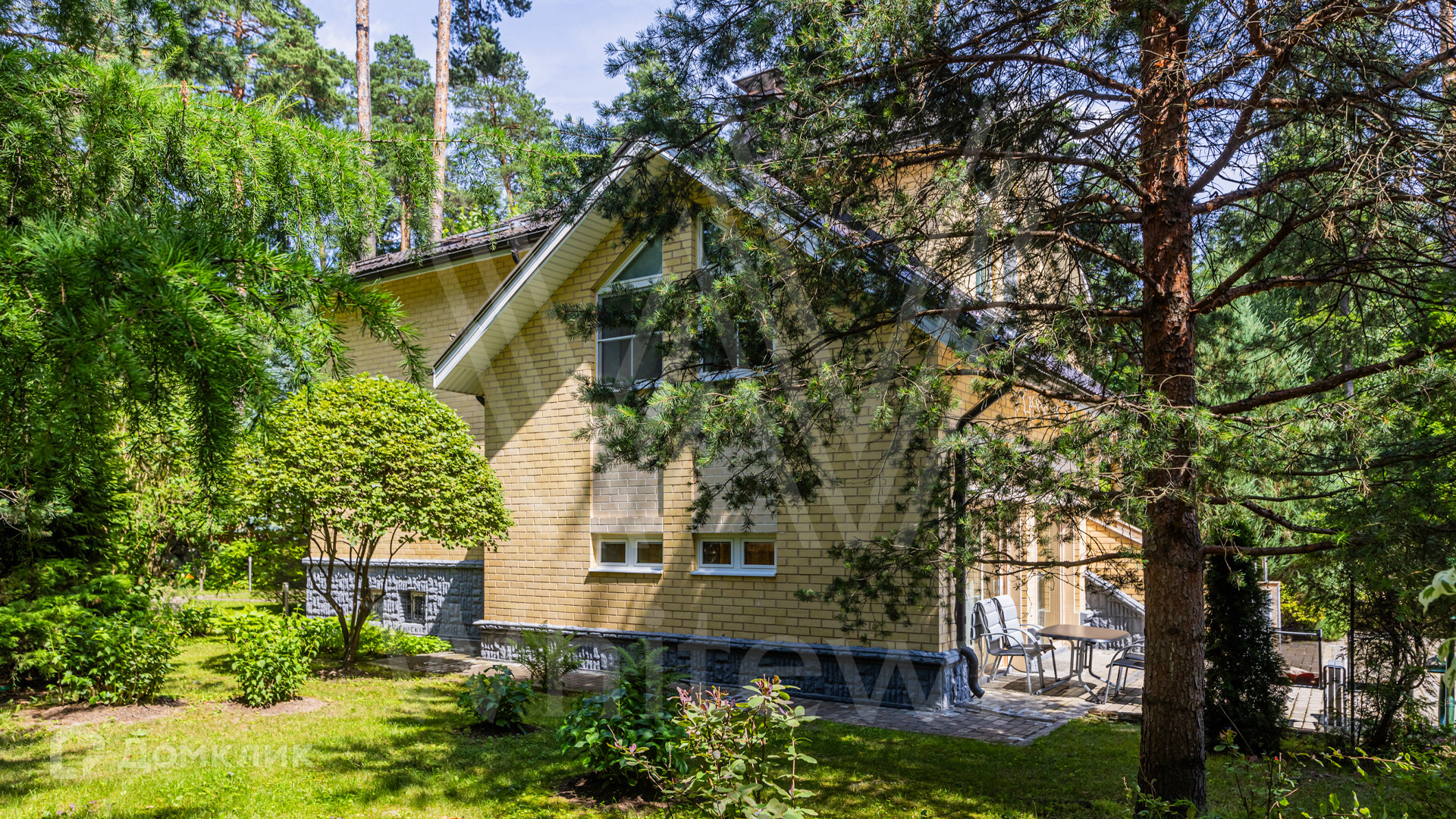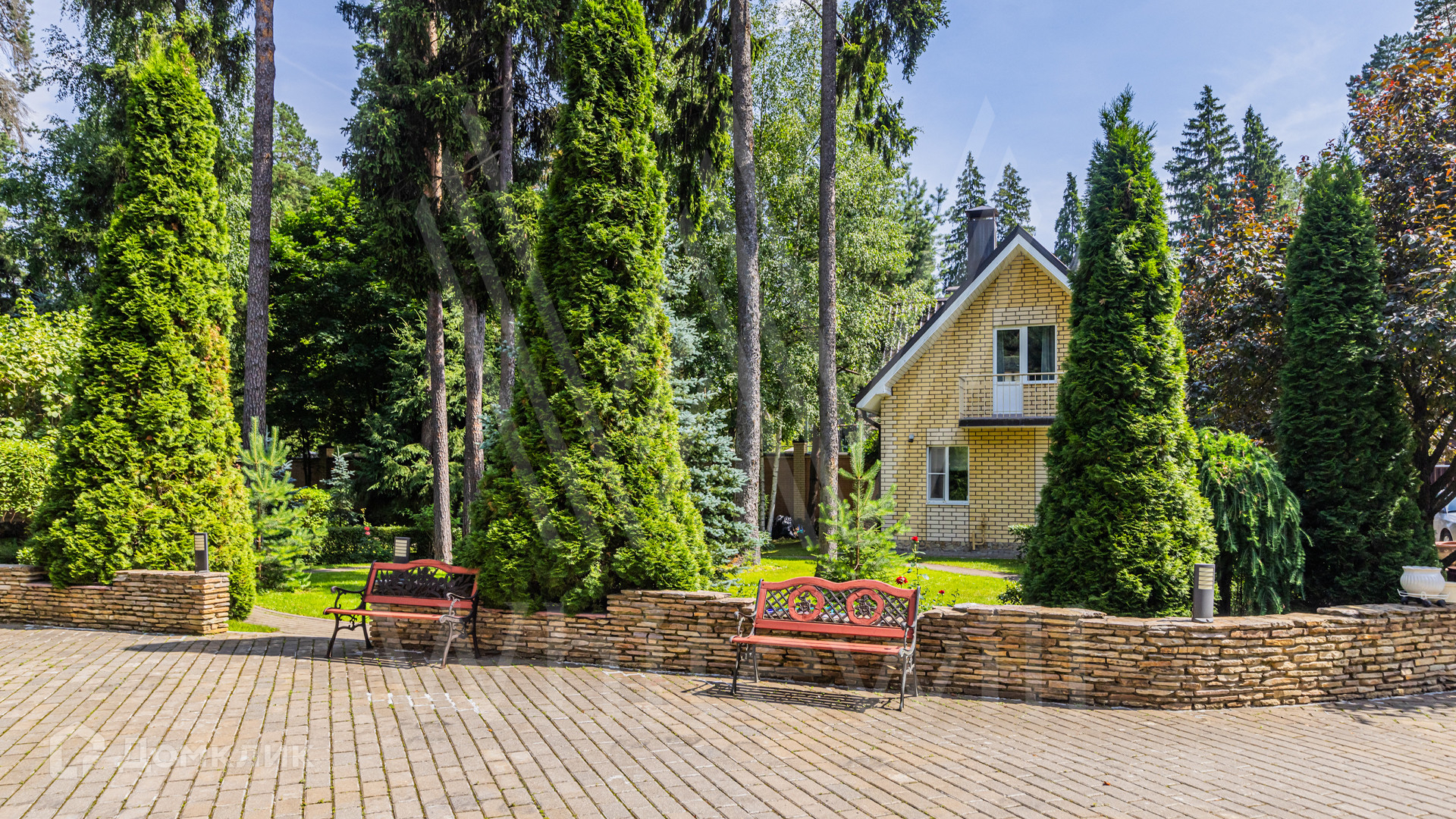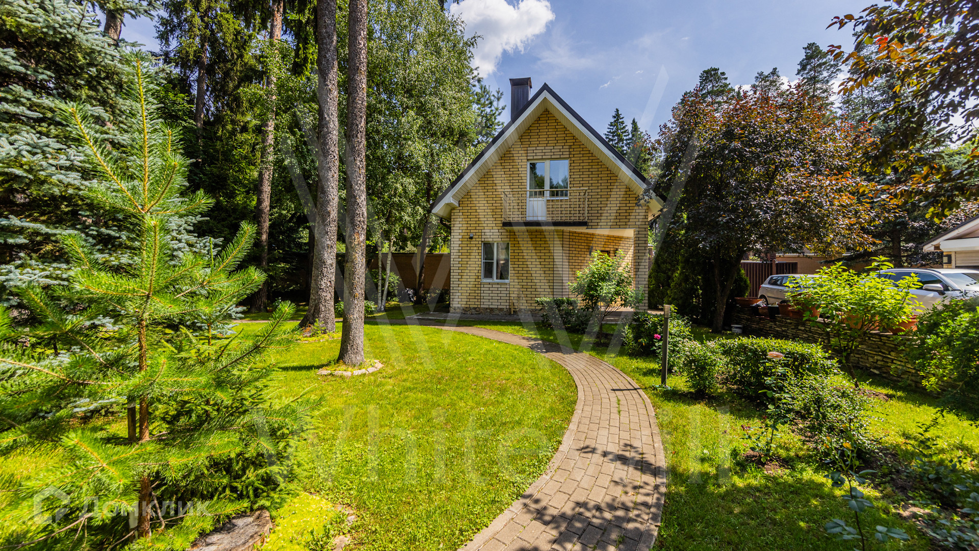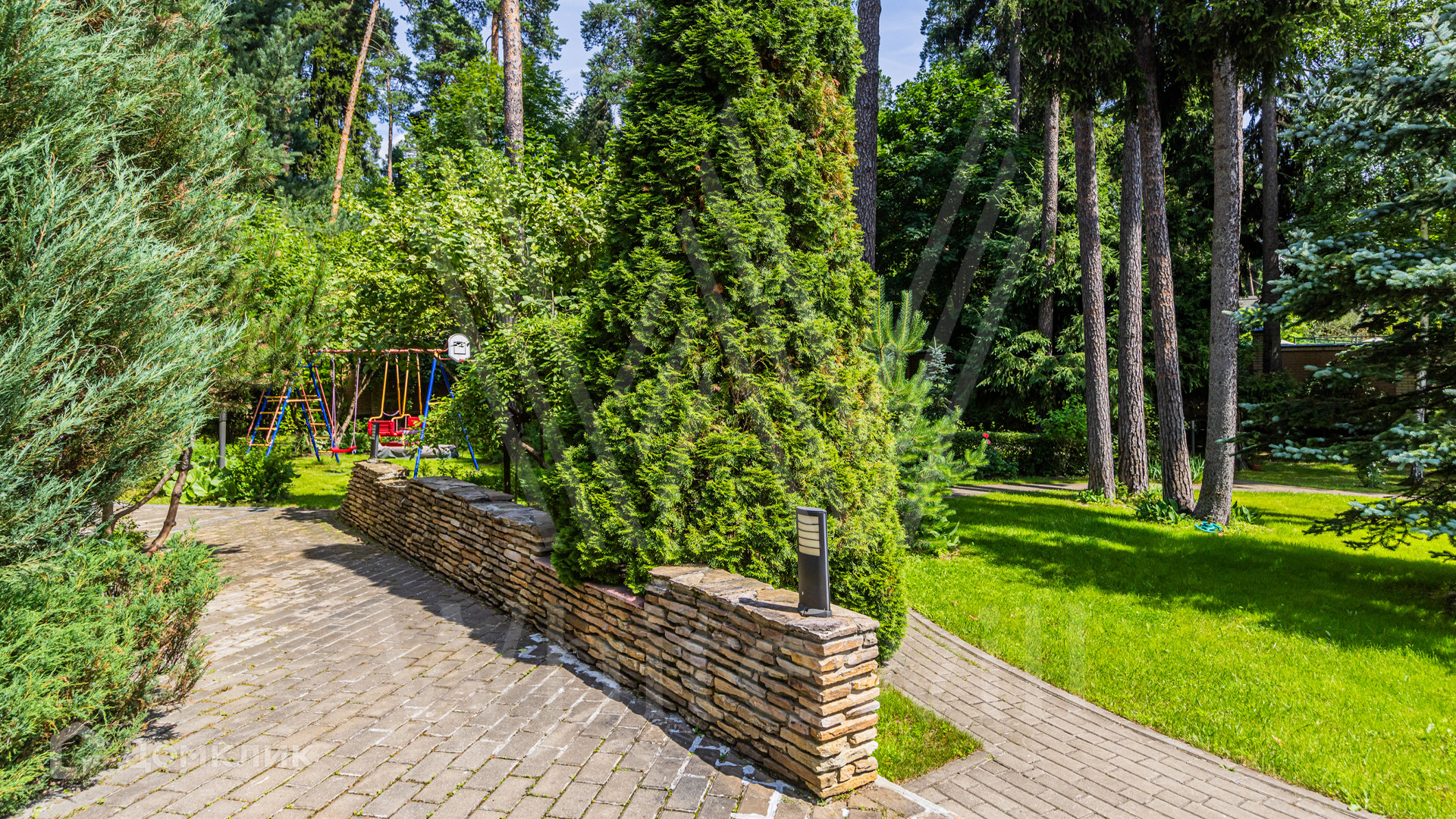 ID 12 349. Коттон Вэй (Никологорское). Загородный дом площадью 450 м² расположен на просторном участке 30 соток с многолетними соснами. Фасад здания облицован бежевым клинкерным кирпичом и декорирован молочными вставками. В отделке светлого интерьера преобладают теплые оттенки, создающие атмосферу уюта. Планировка резиденции включает 5 спален, гостиную с камином, кухню, игровую, кабинет, спортзал с балетной стойкой, кинозал, сауну, джакузи и комнату отдыха. Предусмотрен гараж на 2 машины. На участке выполнен ландшафтный дизайн, засеян газон, вымощены дорожки и обустроены беседка с зоной барбекю и детская площадка.