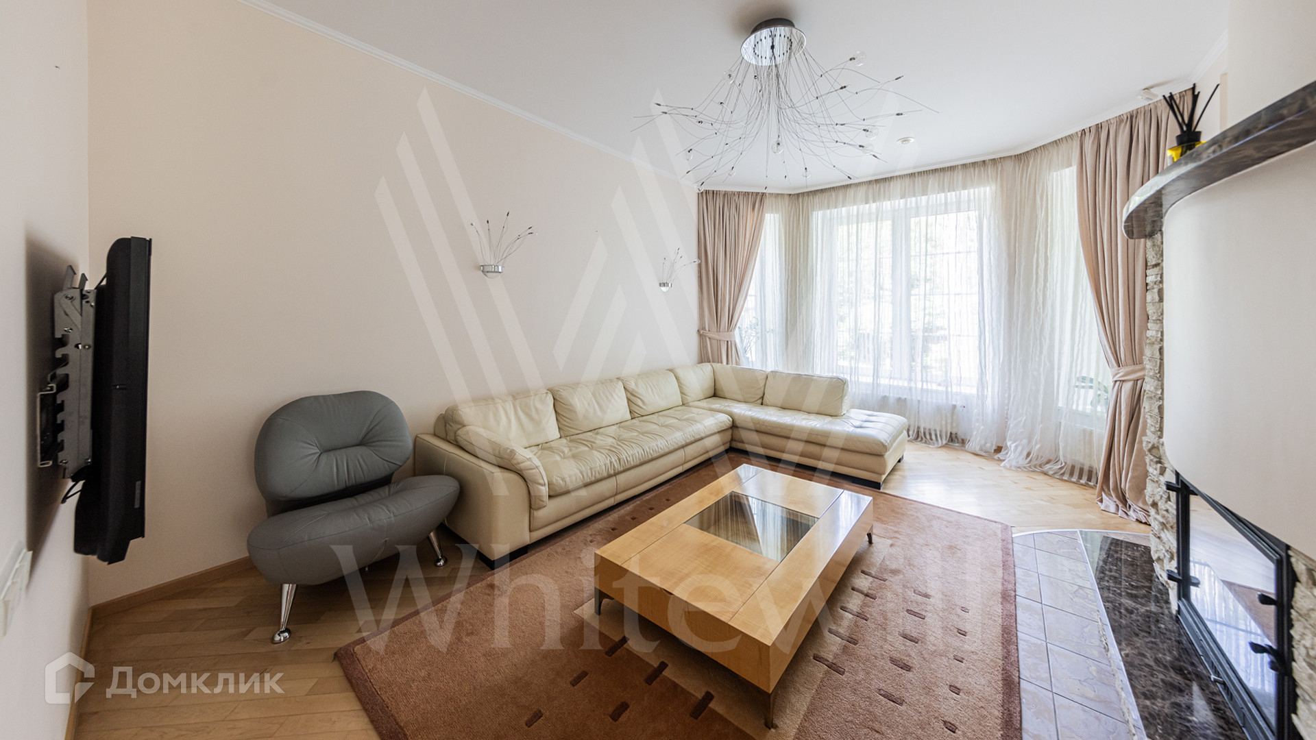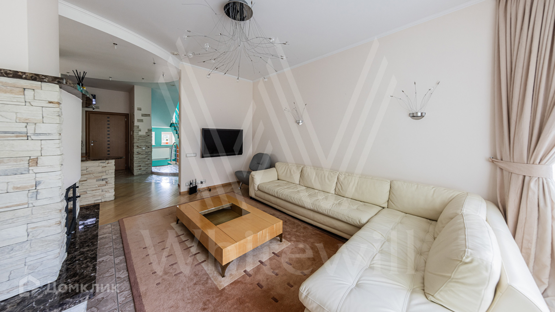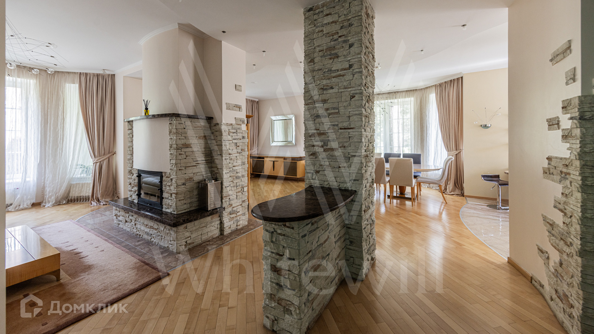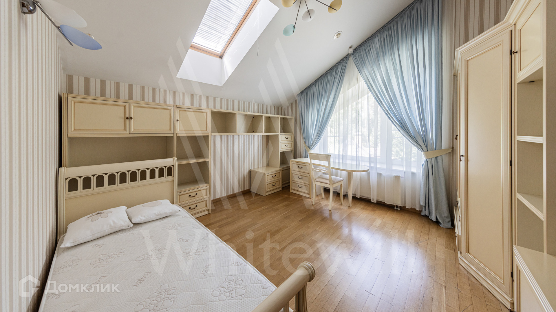 ID 12 349. Коттон Вэй (Никологорское). Загородный дом площадью 450 м² расположен на просторном участке 30 соток с многолетними соснами. Фасад здания облицован бежевым клинкерным кирпичом и декорирован молочными вставками. В отделке светлого интерьера преобладают теплые оттенки, создающие атмосферу уюта. Планировка резиденции включает 5 спален, гостиную с камином, кухню, игровую, кабинет, спортзал с балетной стойкой, кинозал, сауну, джакузи и комнату отдыха. Предусмотрен гараж на 2 машины. На участке выполнен ландшафтный дизайн, засеян газон, вымощены дорожки и обустроены беседка с зоной барбекю и детская площадка.